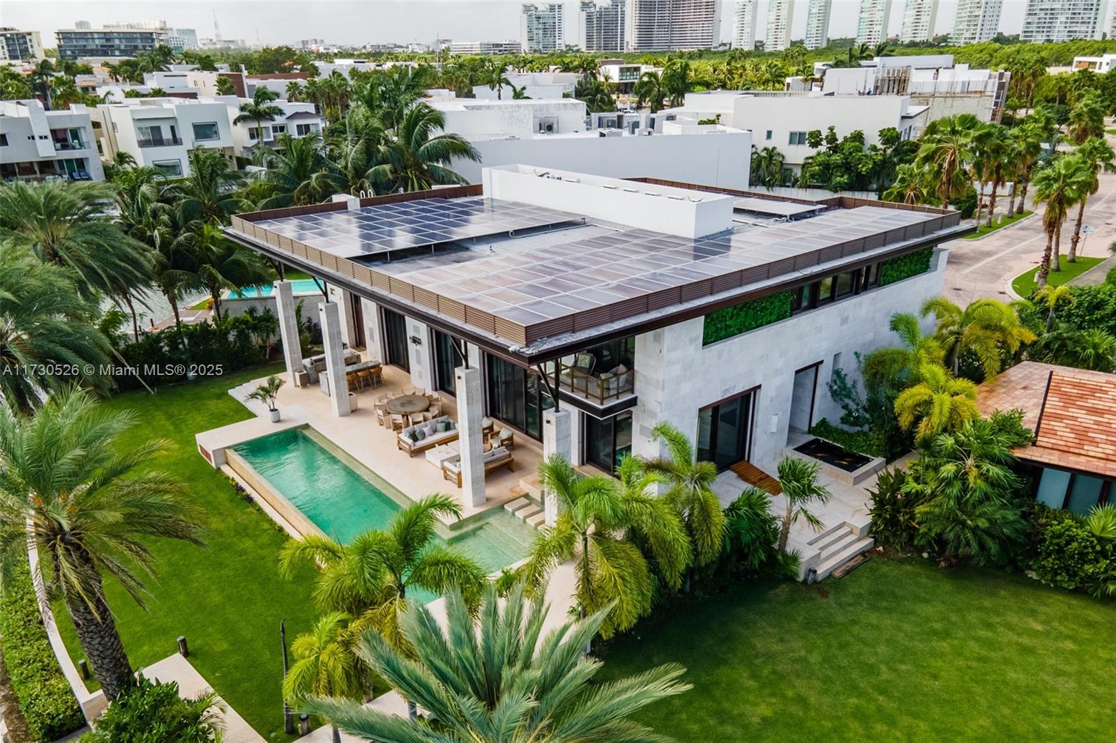 Located in one of the most exclusive areas of Cancun is this impressive residence that redefines luxury & comfort. Every detail has been carefully selected to offer an unparalleled living experience. Main house is 1502m2. Main level is perfect for entertaining, with great room, bar, dining, kitchen, breakfast nook & media room. There is also a large office. Step outside to the lanai, pool & outdoor kitchen. Access to 2 full ext baths. Upstairs are 5 Bdrms, 3 are en suite. Basement level is for the car enthusiast with room for 6 cars, an area for all your auto tools, as well as a bunk room & 3 full baths. Guest house has 1 bed, 1.5 baths, pool, garage for 3 cars.Games room has mens & womens bathrooms. All this sits on over ½ acre of land. Boat docks, room for up to a 60’ boat. MLW of 3’.