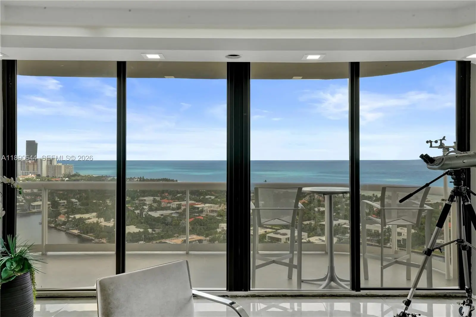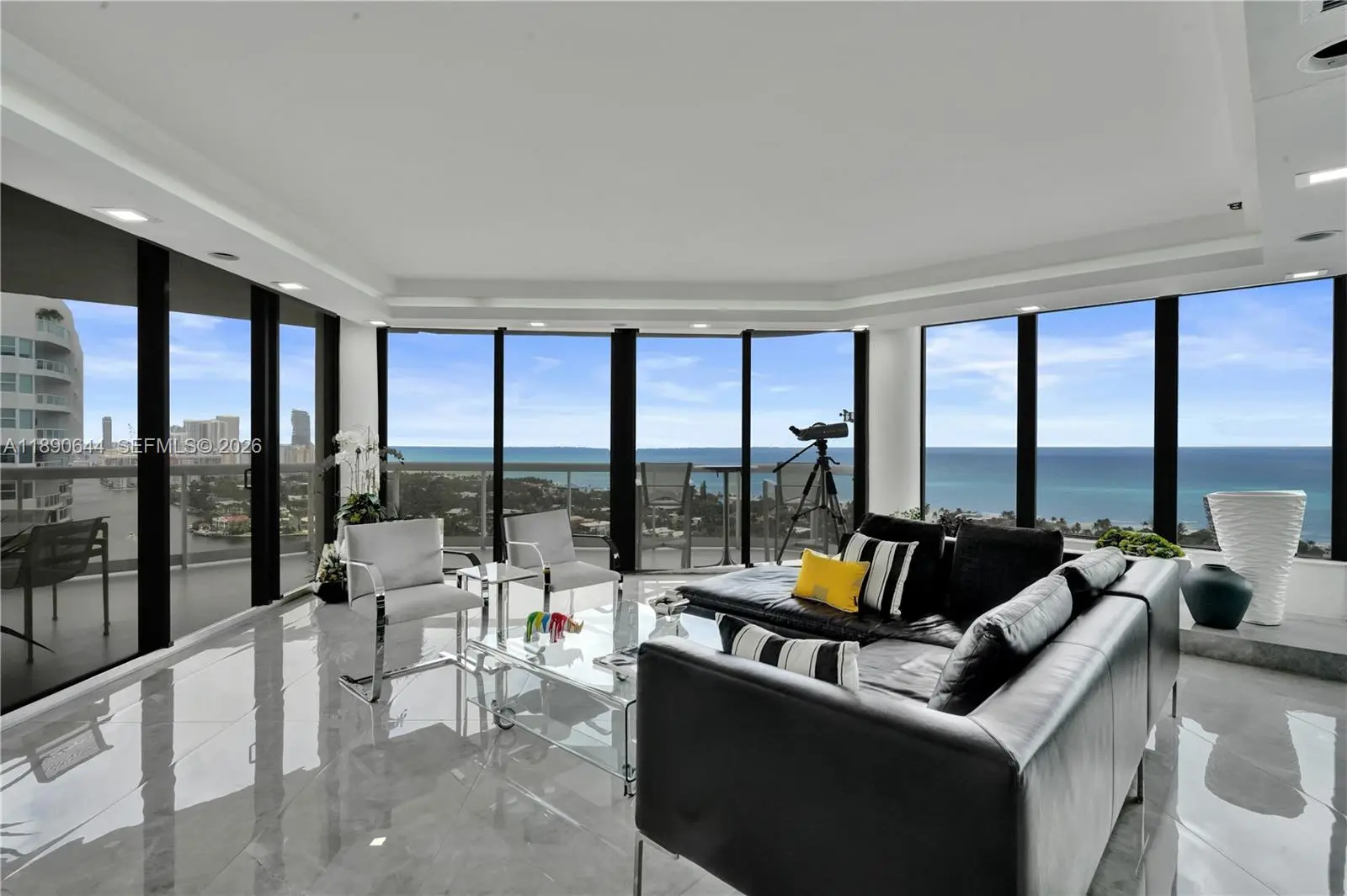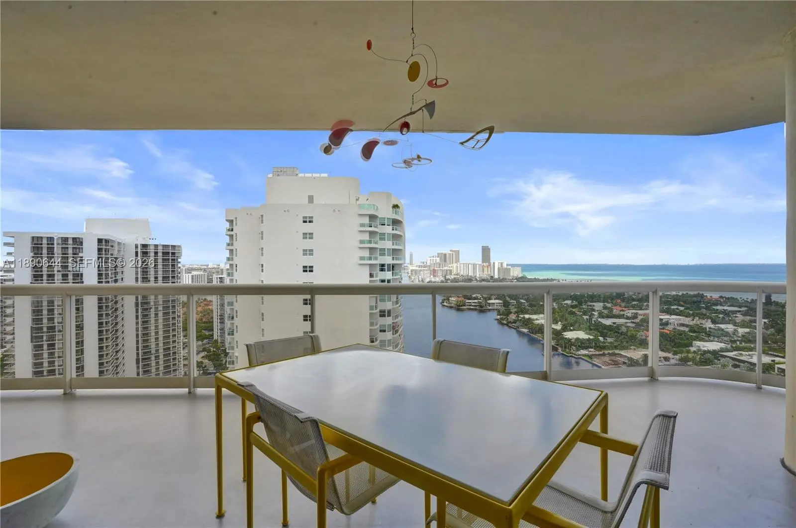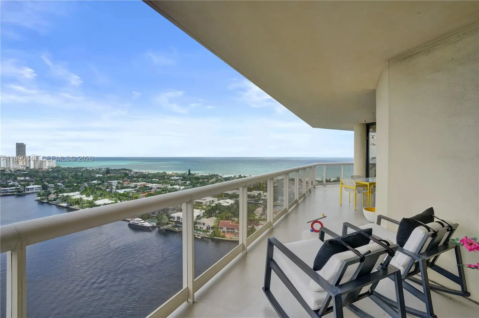 Perched on the 26th floor of Terraces at Turnberry, one of Aventura’s premier waterfront addresses, this 1,936 square foot corner 06 residence commands sweeping ocean views over protected Golden Beach, with direct Intracoastal frontage below. A nearly 600 square foot wraparound terrace extends the living space well beyond the interior, placing you directly above the Intracoastal waterway, where boats move below against an ever-changing backdrop. Western exposure reveals additional views of Turnberry’s championship golf course. Inside, the minimalist interior showcases clean lines and ceilings over nine feet high. Walls of floor to ceiling impact sliding glass doors flood the main living areas with natural light and frame layered ocean, Intracoastal, and golf course vistas. The Poliform galley kitchen is appointed with Miele and Sub-Zero appliances. Custom closets and flush architectural doors by Armadi reinforce the cohesive modern design. A private, dedicated EV charging station provides rare convenience. Moments from Aventura Mall and waterfront dining. Elegant five-star building with resort-style amenities including 24-hour guard-gated security,valet, heated pool and spa with towel service, indoor and outdoor cafés, two fitness centers with sauna, tennis courts, Pilates classes, and racquetball.