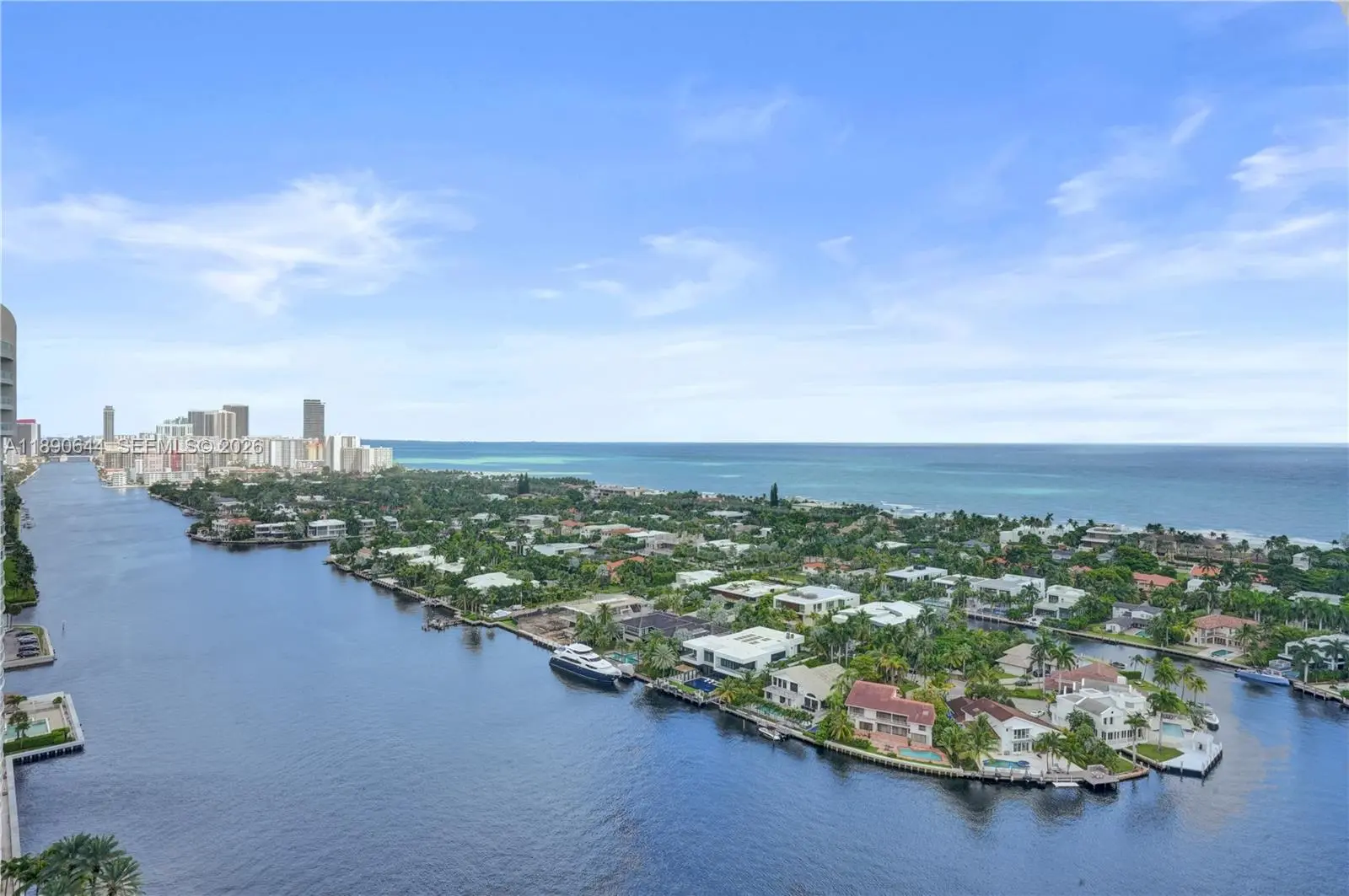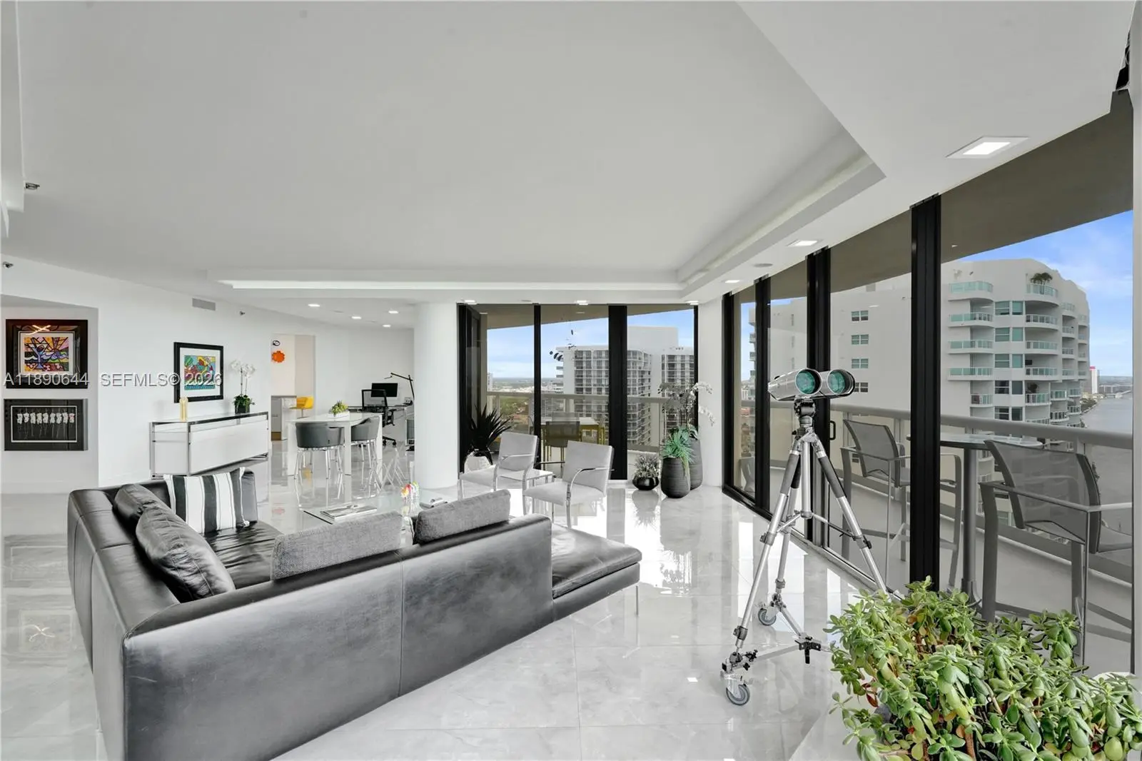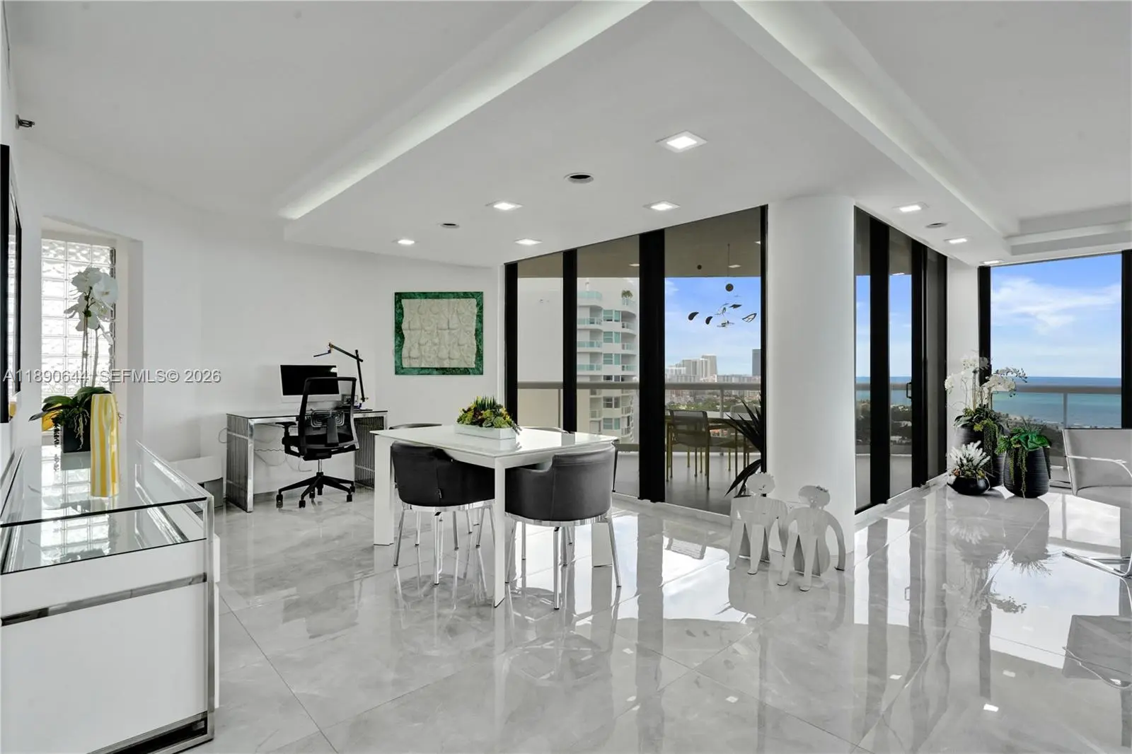 Perched on the 26th floor of Terraces at Turnberry, one of Aventura’s premier waterfront addresses, this 1,936 square foot corner 06 residence commands sweeping ocean views over protected Golden Beach, with direct Intracoastal frontage below. A nearly 600 square foot wraparound terrace extends the living space well beyond the interior, placing you directly above the Intracoastal waterway, where boats move below against an ever-changing backdrop. Western exposure reveals additional views of Turnberry’s championship golf course. Inside, the minimalist interior showcases clean lines and ceilings over nine feet high. Walls of floor to ceiling impact sliding glass doors flood the main living areas with natural light and frame layered ocean, Intracoastal, and golf course vistas. The Poliform galley kitchen is appointed with Miele and Sub-Zero appliances. Custom closets and flush architectural doors by Armadi reinforce the cohesive modern design. A private, dedicated EV charging station provides rare convenience. Moments from Aventura Mall and waterfront dining. Elegant five-star building with resort-style amenities including 24-hour guard-gated security,valet, heated pool and spa with towel service, indoor and outdoor cafés, two fitness centers with sauna, tennis courts, Pilates classes, and racquetball.