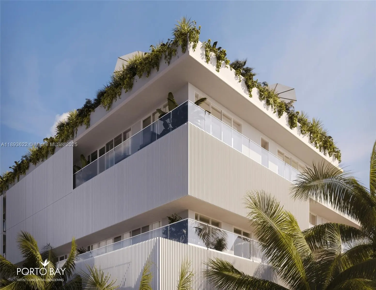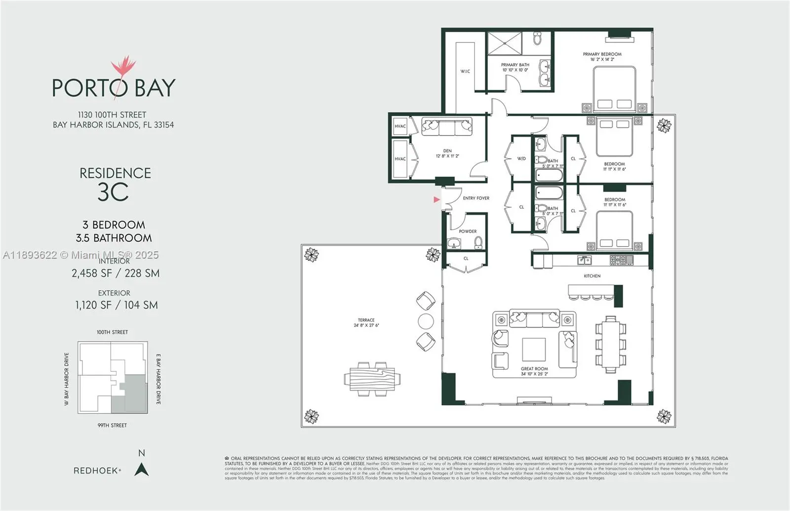 Residence 3C at Porto Bay offers 3 bedrooms and 3.5 baths plus a den with 2,458 SF of interiors and an expansive 1,120 SF wraparound terrace with room for a full outdoor dining area. This bright corner home features a spacious great room with open dining and living areas, European oak floors, and a gourmet island kitchen with Bosch appliances and travertine countertops. The primary suite includes a walk-in closet and a spa-inspired bathroom with dual vanities and Porcelanosa finishes. A den, powder room, washer/dryer, and two parking spaces complete the home. Experience serene island living in a boutique 18-residence building featuring a gym, sauna, cold plunge, elegant lobby, and an outdoor rooftop pool with panoramic views. Secure your residence while early pricing is still available.