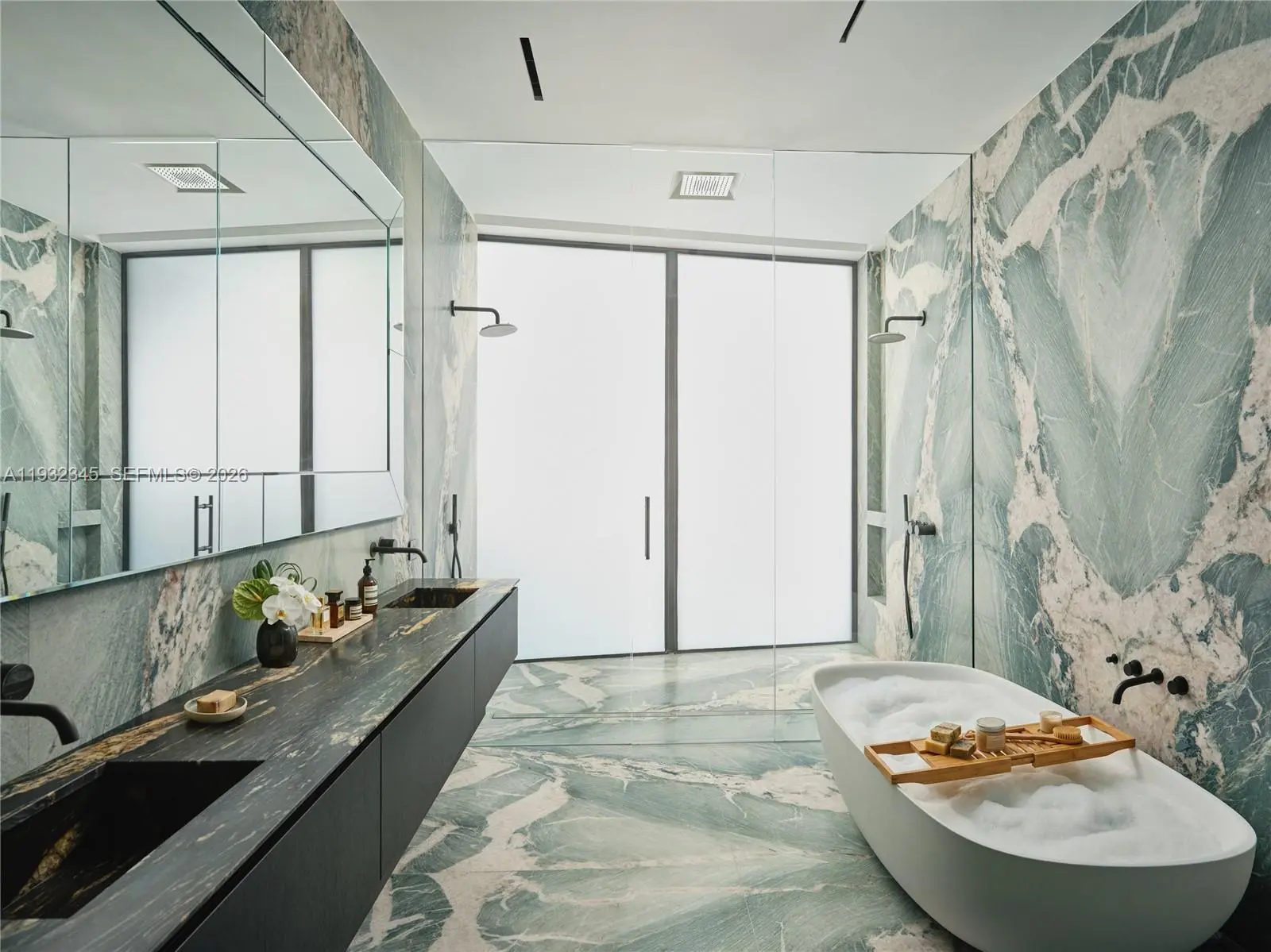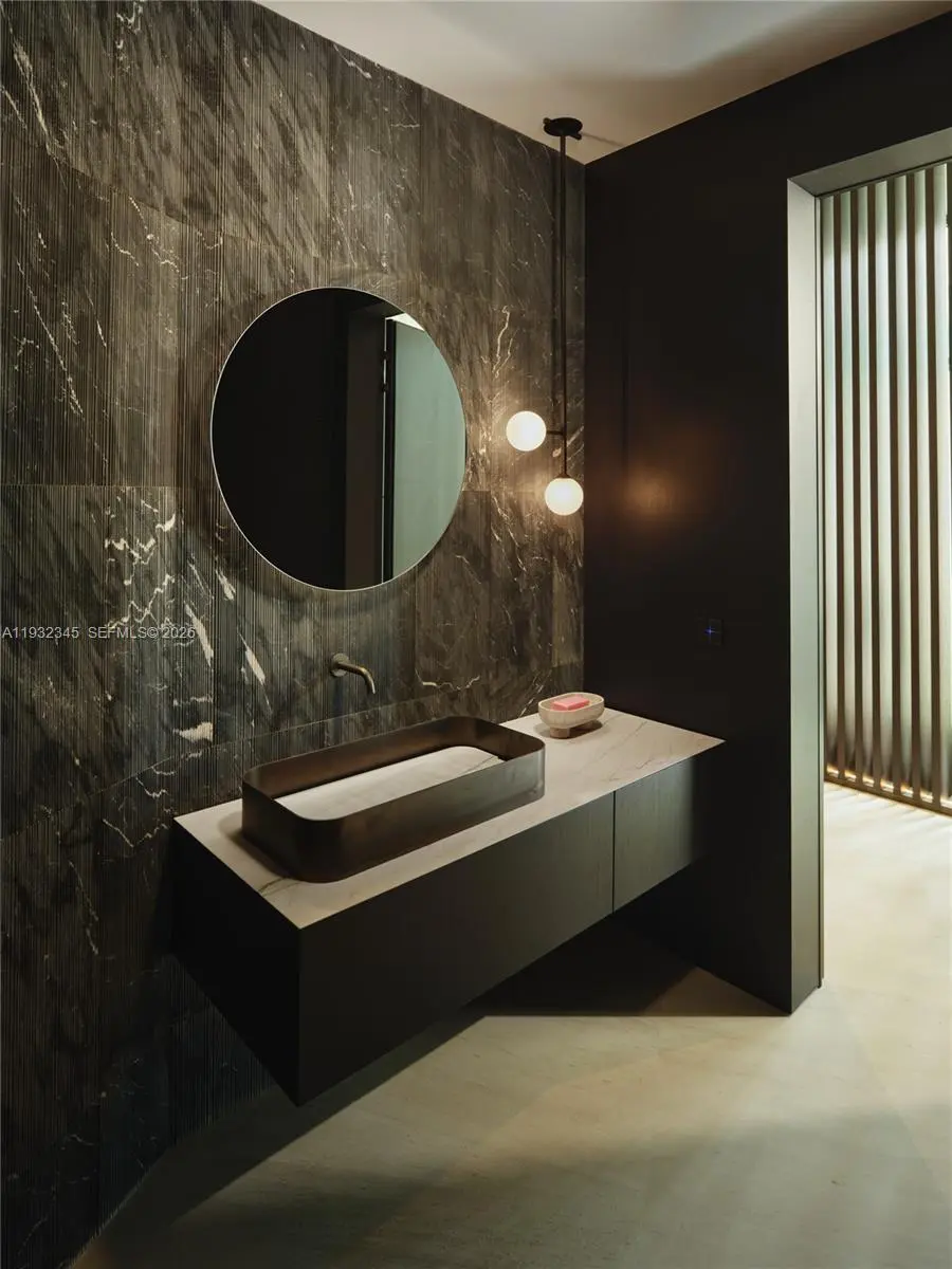 One of the most exceptional waterfront residences in Miami. This striking architectural estate offers 10,689 SF of luxurious interior living plus an additional 8,000 SF understory, featuring 7 bedrooms, 7.5 bathrooms, 12-foot ceilings, and expansive open living and entertaining spaces wrapped in walls of glass. An elevated waterfront terrace opens to a dramatic 70ft knife-edge pool and spa, summer kitchen, and extended deck with sweeping open bay and downtown skyline views, all set behind a rare 14-foot seawall. The home includes dual kitchens (display and staff), a state-of-the-art theater, private elevator, rooftop deck, and an innovative understory accommodating up to 10 vehicles. High-end finishes include Boffi kitchens and baths, Apure and Lumifer lighting, Ornare closets, and more. Situated on a 13,382-SF lot with 105 feet of prime waterfrontage, the property also features a new deep-water dock for a large yacht and a 50,000-lb boat lift.