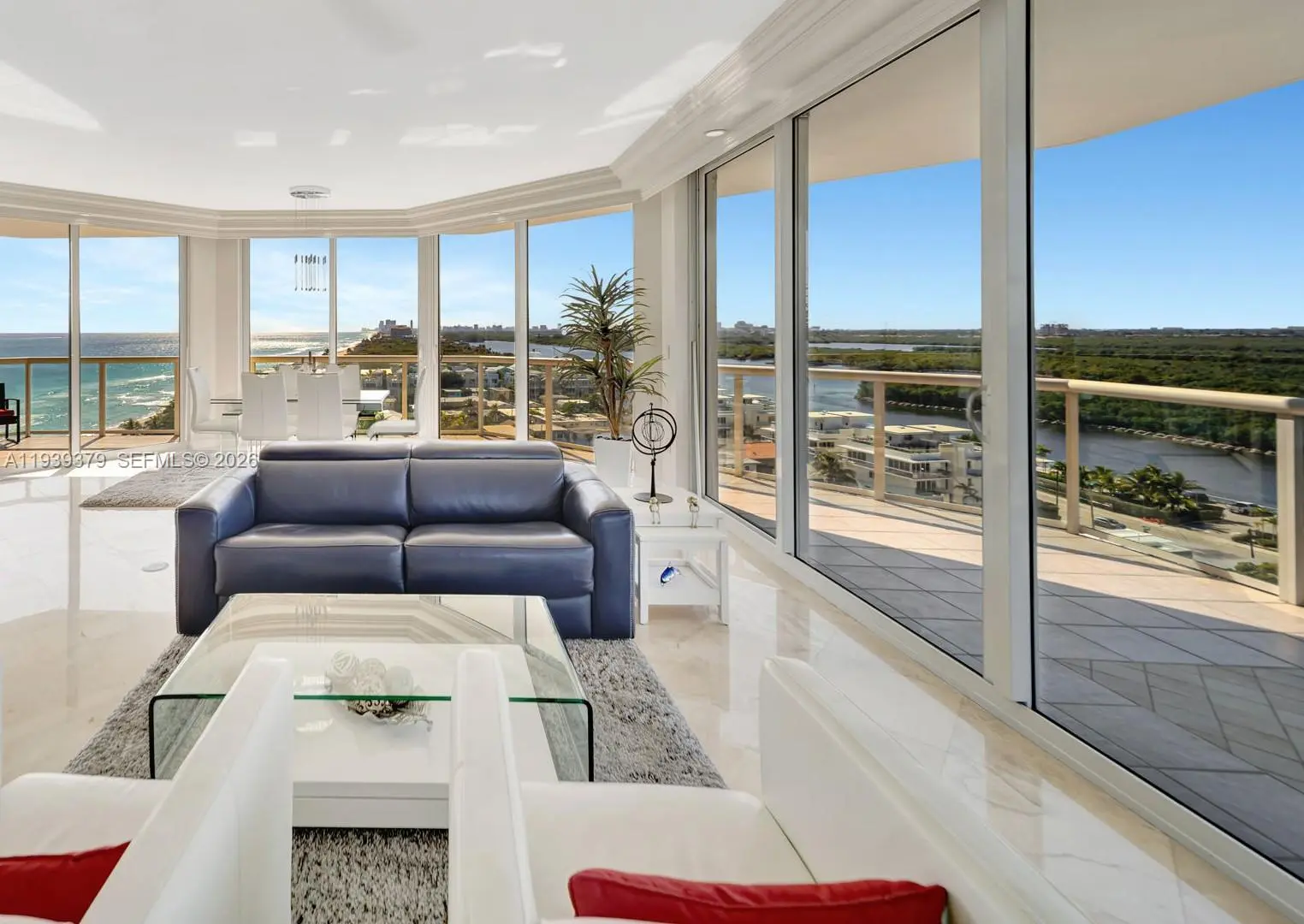The 2012 sq.ft. ocean front residence has 2 full bedrooms & 3rd bedroom is currently used as an oversized den which can easily be converted back as tax rolls reflect a 3 bedroom. An opportunity to own a truly refined oceanfront corner residence. This expansive home is highlighted by an oversized terrace and dramatic South-East and South-West exposures, offering breathtaking ocean and skyline views with an abundance of natural light from sunrise through sunset. High Floor-to-Ceiling sliding glass doors meld together interior and exterior, creating a seamless indoor-outdoor lifestyle ideal for both everyday living and elegant entertaining. The generous primary suite is a serene coastal sanctuary, featuring direct ocean views, private terrace access. A thoughtfully designed guest bedroom with beautiful views is perfect for hosting guests without compromising space or style. Home includes 2 full bathrooms, refined powder room and a dedicated in-unit laundry room for added convenience. Residents enjoy a 5 star, resort-style experience with an impressive collection of amenities, including a state-of-the-art fitness center, two heated pools, outdoor jacuzzi, on-site café, valet service, and direct beach access with dedicated chair and umbrella service. This gated, full-service community offers 24-hour security, concierge services, an elegant club and party room, tennis and pickleball courts, assigned garage parking and private storage—delivering the ultimate in luxury & comfort.
