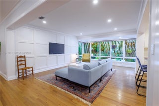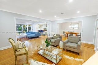 Timeless elegance defines this fully updated 3BR/3BA (~2,224sf) Miami Shores ranch on an oversized 9,675sf lot with room for a pool. Light-filled formal and casual living areas feature oak hardwood floors, plantation shutters, elegant millwork, and a decorative stone fireplace. The open kitchen and family room overlook a large patio with built-in gas grill and lush tropical landscaping through a wall of hurricane-impact glass. Off the formal dining room, the chef’s kitchen offers white shaker cabinetry, marble counters, a gas range, and a walnut butcher-block island with seating. The spacious primary suite includes extensive closets and a refined en-suite bath with marble-top vanity, glass shower, and polished nickel fixtures. Each additional bedroom has its own renovated bath and generous storage. Additional features include a laundry room with vintage utility sink, pantry storage, and a finished 1-car garage with cabinetry, butcher-block workbench, and built-in air compressor—ideal for a workshop or car enthusiast. Nestled on a quiet, tree-lined street walkable to downtown Miami Shores shops and dining.