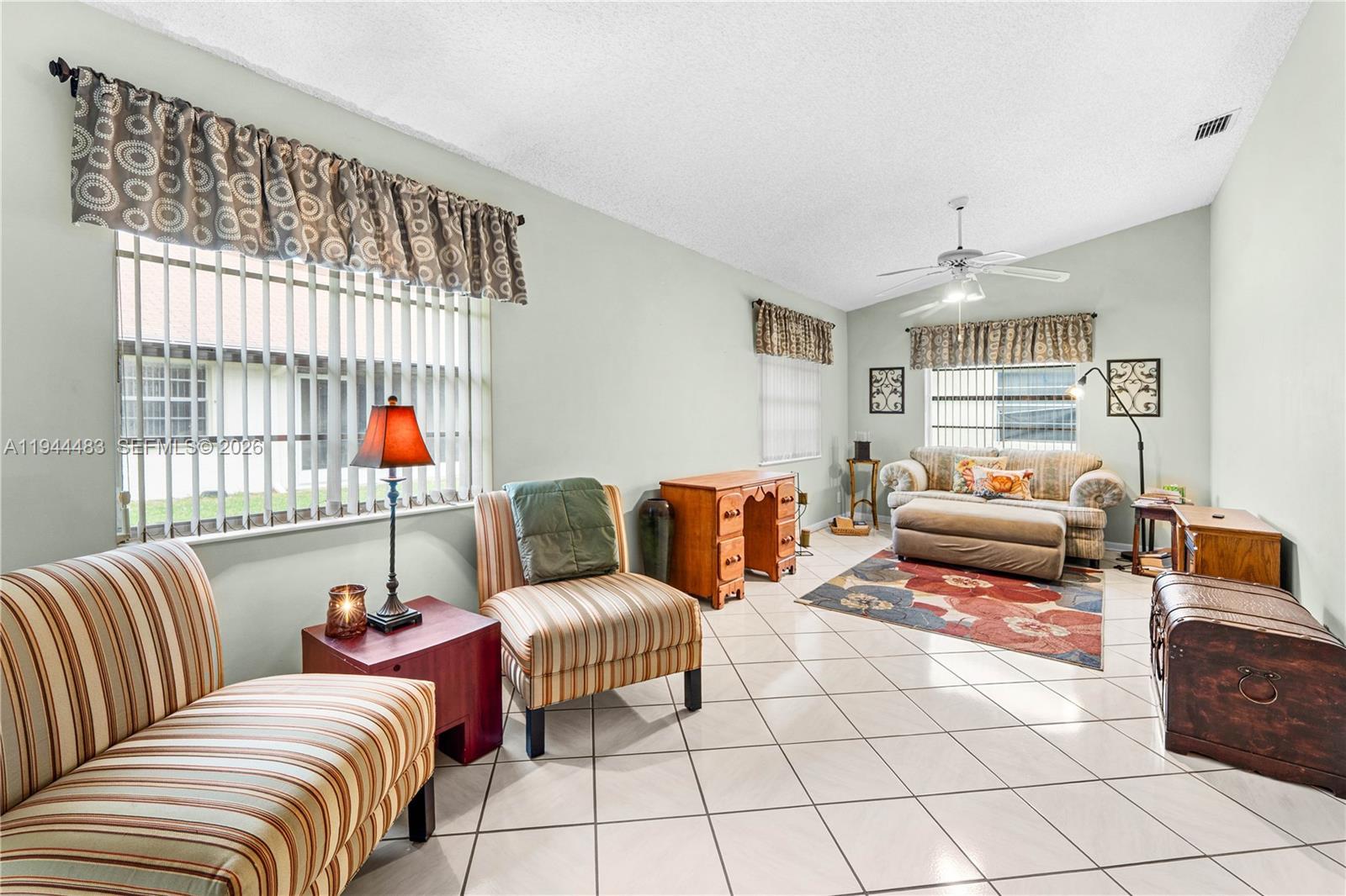 Discover comfort and convenience in this bright and airy 2-bedroom, 2-bathroom villa with a 1-car garage and versatile den, nestled within the best-kept secret gated community of Cypress Lakes in West Palm Beach. Built in 1989, this well-maintained residence offers 1,529 square feet of living space highlighted by high ceilings and an open, light-filled layout that creates an inviting atmosphere throughout. Home has hurricane panel for your convenience. Cypress Lakes is a vibrant 55+ community offering resort-style amenities, including a heated community pool, golf course, clubhouse, tennis courts, and playgrounds. Residents enjoy an active and social lifestyle within the secure setting of this gated neighborhood. Ideally located, this home is centrally positioned near Palm Beach International Airport, the train station, and just a short drive to beautiful beaches. Enjoy easy access to excellent shopping, dining, and entertainment, making this an exceptional opportunity for relaxed South Florida living.