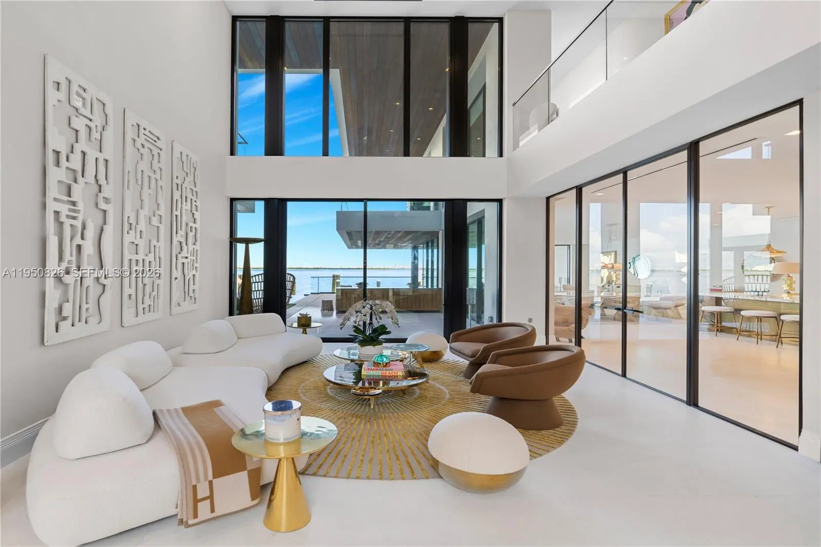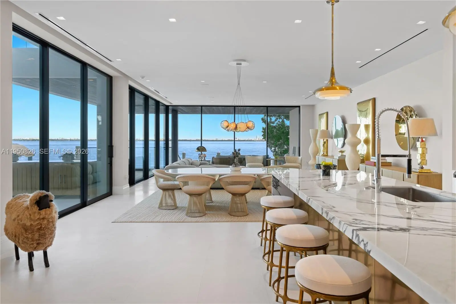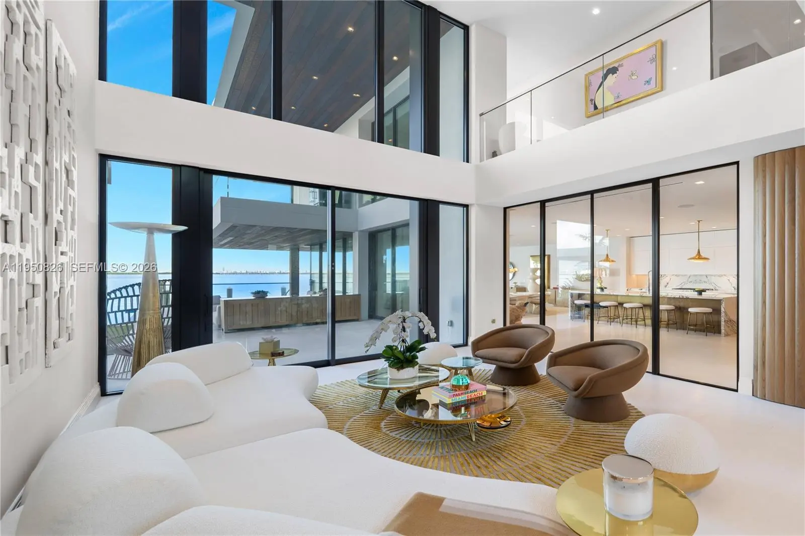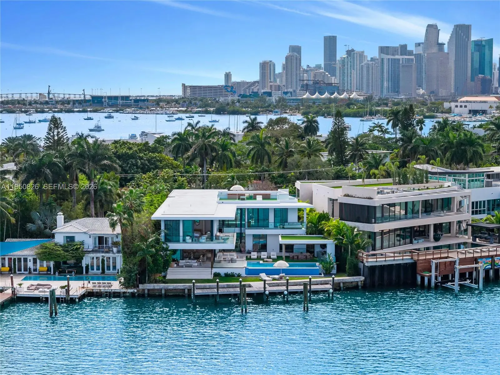MODERN WATERFRONT RESIDENCE FEATURING CURATED LUXE INTERIORS SITTING ON THE OPEN BAY + CITY VIEWS ON THE EXCLUSIVE VENETIAN ISLANDS BY STRANG DESIGN! 5 beds + double offices & theater, 5 full baths + 2 powder rooms spanning 8,048 Adj SF living area on a 13,382 SF LOT w/ 104 FT of waterfront. Dramatic double-height entry & entertaining areas feature 25’ ceilings w/ custom Bocci chandelier & Nella Vetrina Italian doors + custom hidden bar. Chef’s kitchen w/ Wolf appliances, including gas range, double oven & coffee station. Sub-Zero fridge & wine storage. Ground-floor office, convertible to a bedroom, wrapped in Phillip Jeffries wallpaper + floor-to-ceiling built-in bookcases. Theater w/ State-of-the-art AV system featuring Bang & Olufsen surround sound system, Sony 4K HDR projector + separate wet bar & fridge. Primary suite w/ private terrace overlooking the Bay & City lights. Dedar wallpaper + dual walk-in closets. Primary bath w/ double vanity & electric frosted smart glass for privacy. Gym w/ PENT Equipment. Expansive Outdoor area w/ infinity-edge pool, outdoor kitchen w/ gas range + ipe dock. Rooftop terrace w/ open views of Miami and the Bay w/ storage & drink fridge. Smart Home technology includes Control4 automation, Sonos, Lutron lighting & fully motorized blackout shades in bedrooms & common areas. Fully secured w/ a wired alarm system, leak detection, a multi-camera security system & a whole-home gas generator. Gated Driveway for up to 4 cars + 2-car garage.
