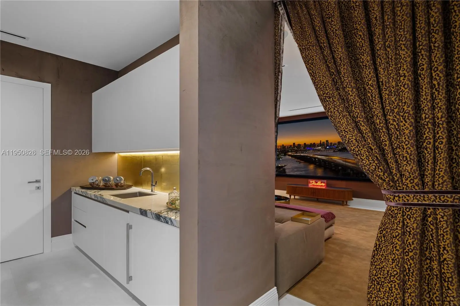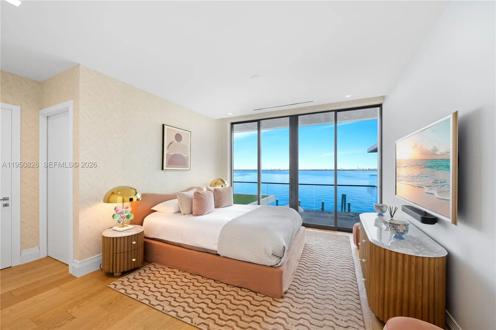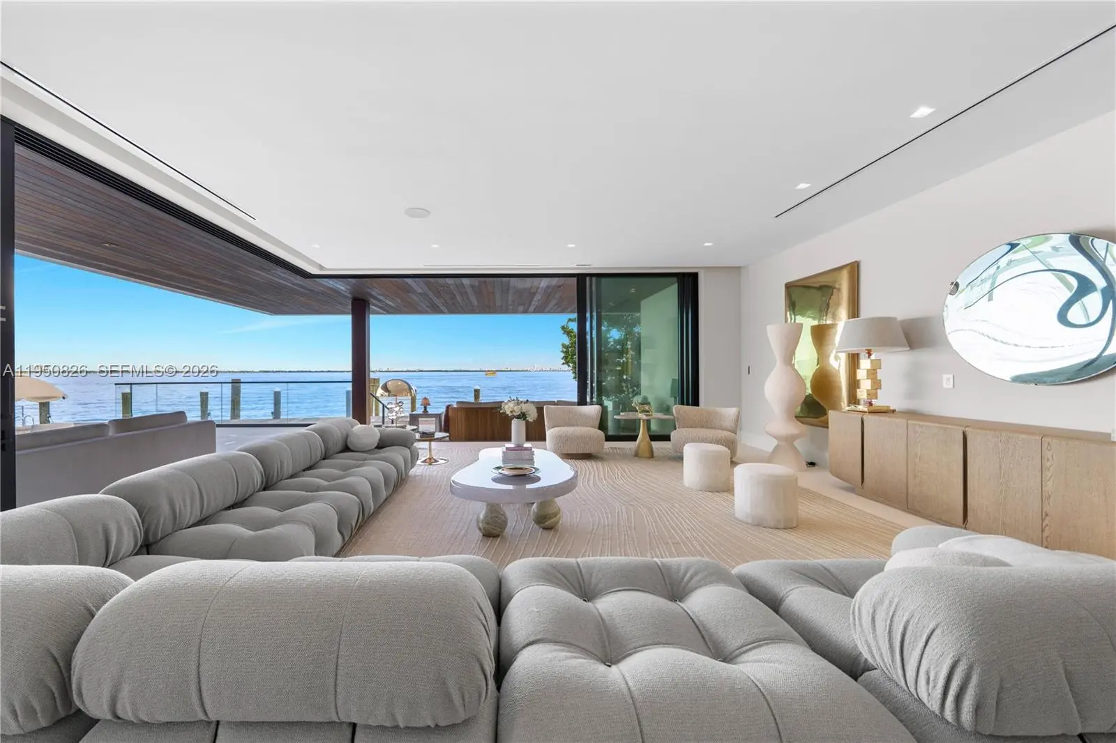 MODERN WATERFRONT RESIDENCE FEATURING CURATED LUXE INTERIORS SITTING ON THE OPEN BAY + CITY VIEWS ON THE EXCLUSIVE VENETIAN ISLANDS BY STRANG DESIGN! 5 beds + double offices & theater, 5 full baths + 2 powder rooms spanning 8,048 Adj SF living area on a 13,382 SF LOT w/ 104 FT of waterfront. Dramatic double-height entry & entertaining areas feature 25’ ceilings w/ custom Bocci chandelier & Nella Vetrina Italian doors + custom hidden bar. Chef’s kitchen w/ Wolf appliances, including gas range, double oven & coffee station. Sub-Zero fridge & wine storage. Ground-floor office, convertible to a bedroom, wrapped in Phillip Jeffries wallpaper + floor-to-ceiling built-in bookcases. Theater w/ State-of-the-art AV system featuring Bang & Olufsen surround sound system, Sony 4K HDR projector + separate wet bar & fridge. Primary suite w/ private terrace overlooking the Bay & City lights. Dedar wallpaper + dual walk-in closets. Primary bath w/ double vanity & electric frosted smart glass for privacy. Gym w/ PENT Equipment. Expansive Outdoor area w/ infinity-edge pool, outdoor kitchen w/ gas range + ipe dock. Rooftop terrace w/ open views of Miami and the Bay w/ storage & drink fridge. Smart Home technology includes Control4 automation, Sonos, Lutron lighting & fully motorized blackout shades in bedrooms & common areas. Fully secured w/ a wired alarm system, leak detection, a multi-camera security system & a whole-home gas generator. Gated Driveway for up to 4 cars + 2-car garage.