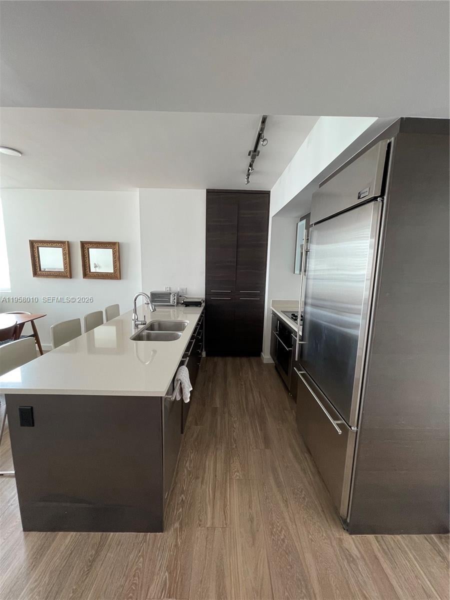 Bright, updated & spacious CORNER unit with city & water views at 500 Brickell. This 2/2 split plan apartment has stainless steel appliances, quartz countertops, wood-look porcelain tile, built out closets & more. 500 Brickell offers 24 hour security, gym, spa, two pools, movie theater ++. Move in OR invest & rent it out with a 30 day minimum. Live the Brickell lifestyle: walk to restaurants, work and entertainment. Minutes from US1, I-95, the Grove & Gables. Contact listing agent for showings.
