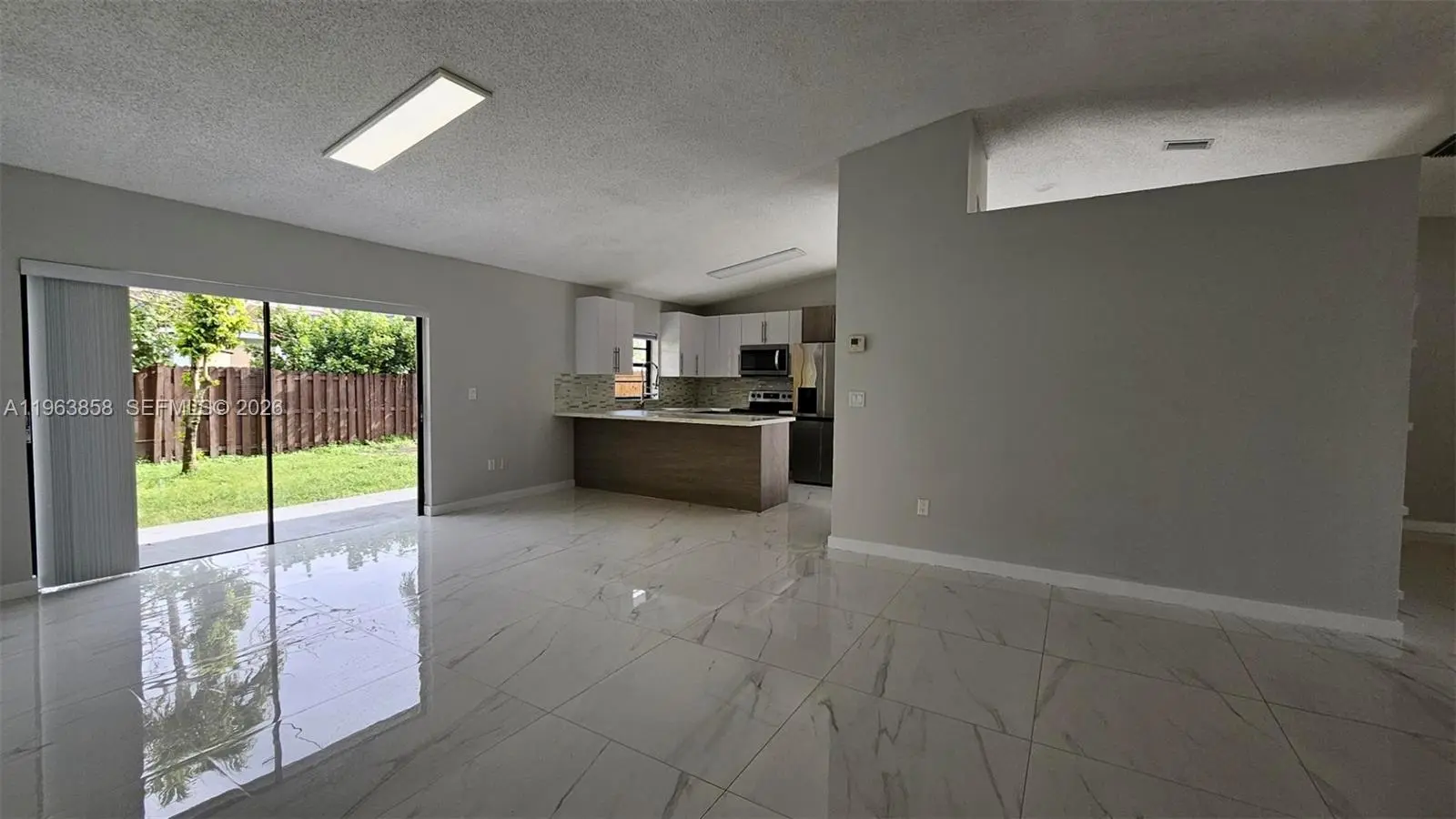 Completely remodeled home in quiet neighborhood. Large porcelain tiles throughout, Quartz countertops, stainless steel appliances. Large patio. Home has additional area next to kitchen that can be used as an office/den