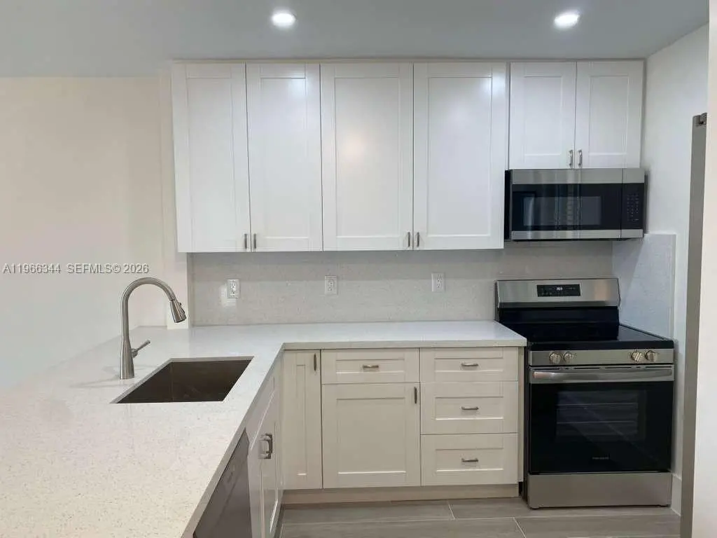 Just tastefully remodeled with new floors, new kitchen remodel, new appliances. Quiet and sought-after complex. Peace of mind with hurricane windows and doors. On lockbox, text for combo