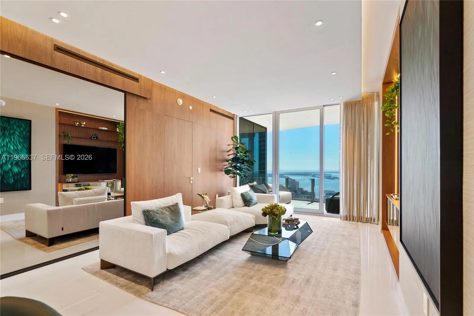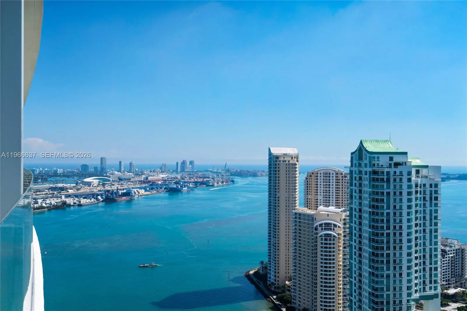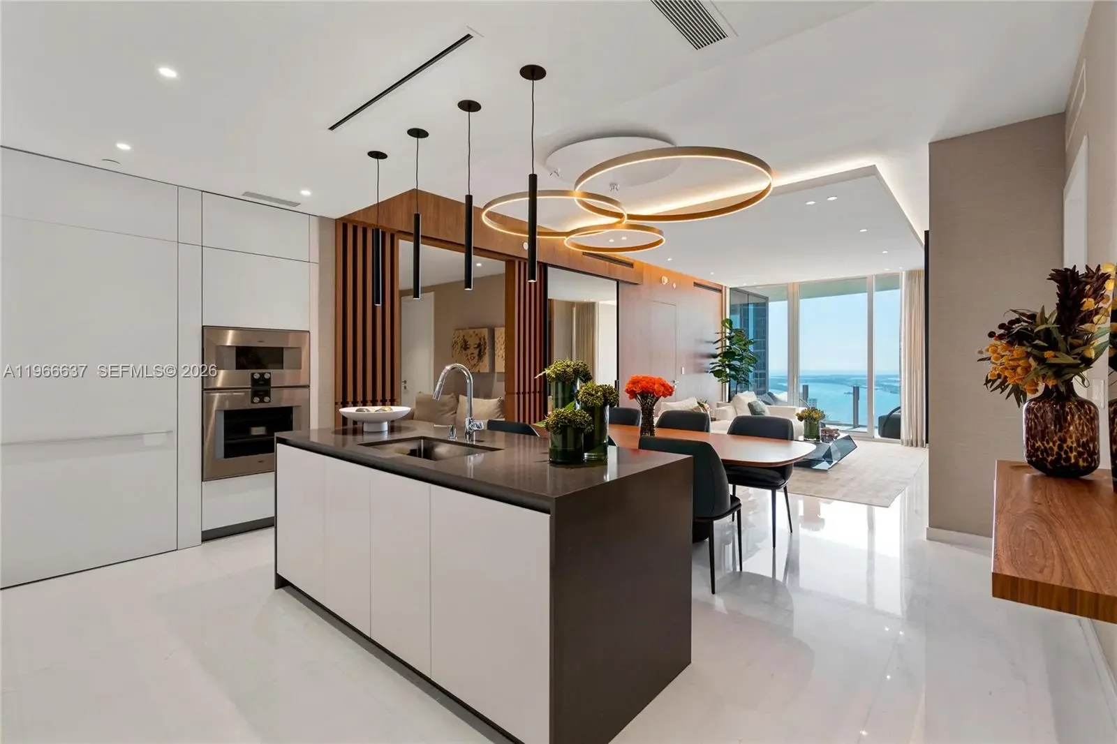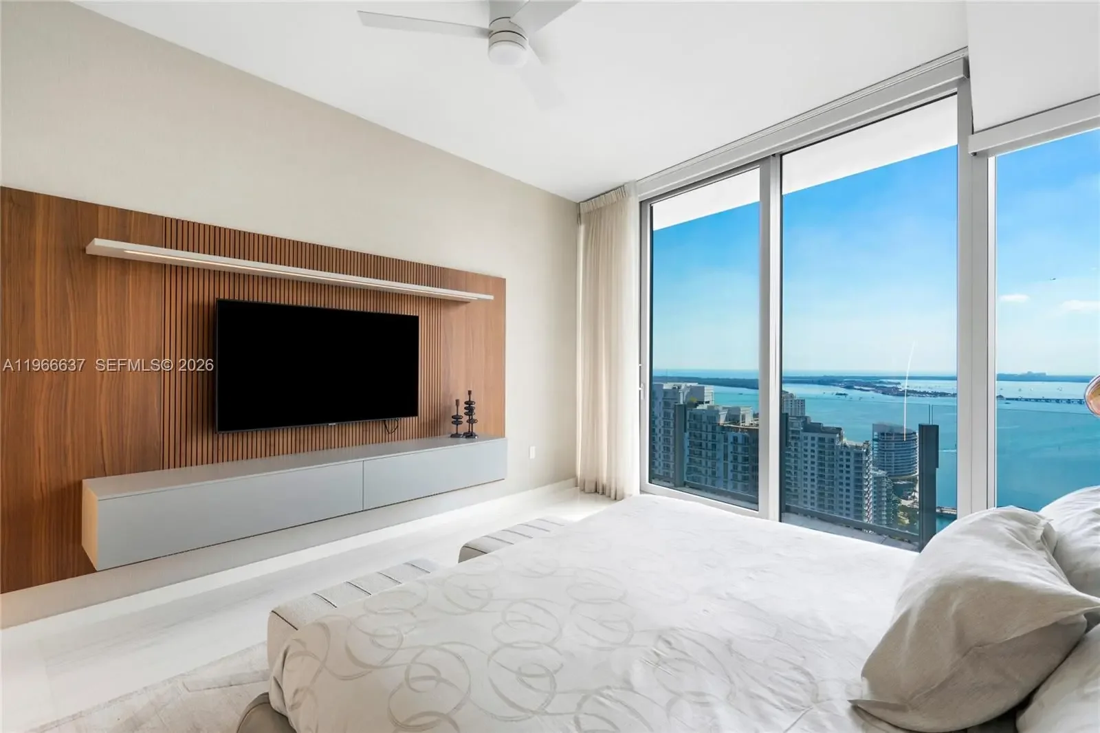 Welcome to Aston Martin 4005, a designer furnished new construction featuring 2 Bed plus an enclosable Den with 3.5 baths in the waterfront between Brickell and Downtown Miami. This stunning high-floor residence features breathtaking panoramic views of Biscayne Bay, the Miami skyline, and the Atlantic Ocean through 10 ft floor-to-ceiling windows and wrap-around balcony. Professionally curated interiors blend modern elegance with comfort, showcasing custom furnishings by Addison House, statement lighting, premium finishes, and bespoke décor throughout. The open-concept living and dining areas flow seamlessly into a gourmet kitchen equipped with top-of-the-line Gaggenau appliances, sleek cabinetry, and refined stone surfaces. Spacious bedrooms offer serene retreats with spa-inspired bathrooms and ample walk-in closets. Wraparound balcony accesible from all bedrooms and living room. Residents also enjoy over 40,000 SqFt of amenities including an infinity pool deck in the sky, state of the art fitness center and spa, theaters, kids rooms, business centre, event salons, boat dock, and more. Building also features 24/7 security, concierge, and is within steps from Miami's hottest restaurants and shops, Downtown and Brickell, and a short drive from Miami Beach, Key Biscayne, Coconut Grove with easy access to the airport. Tenant can chose to change to bedroom furniture in the second bedroom. Must See!
