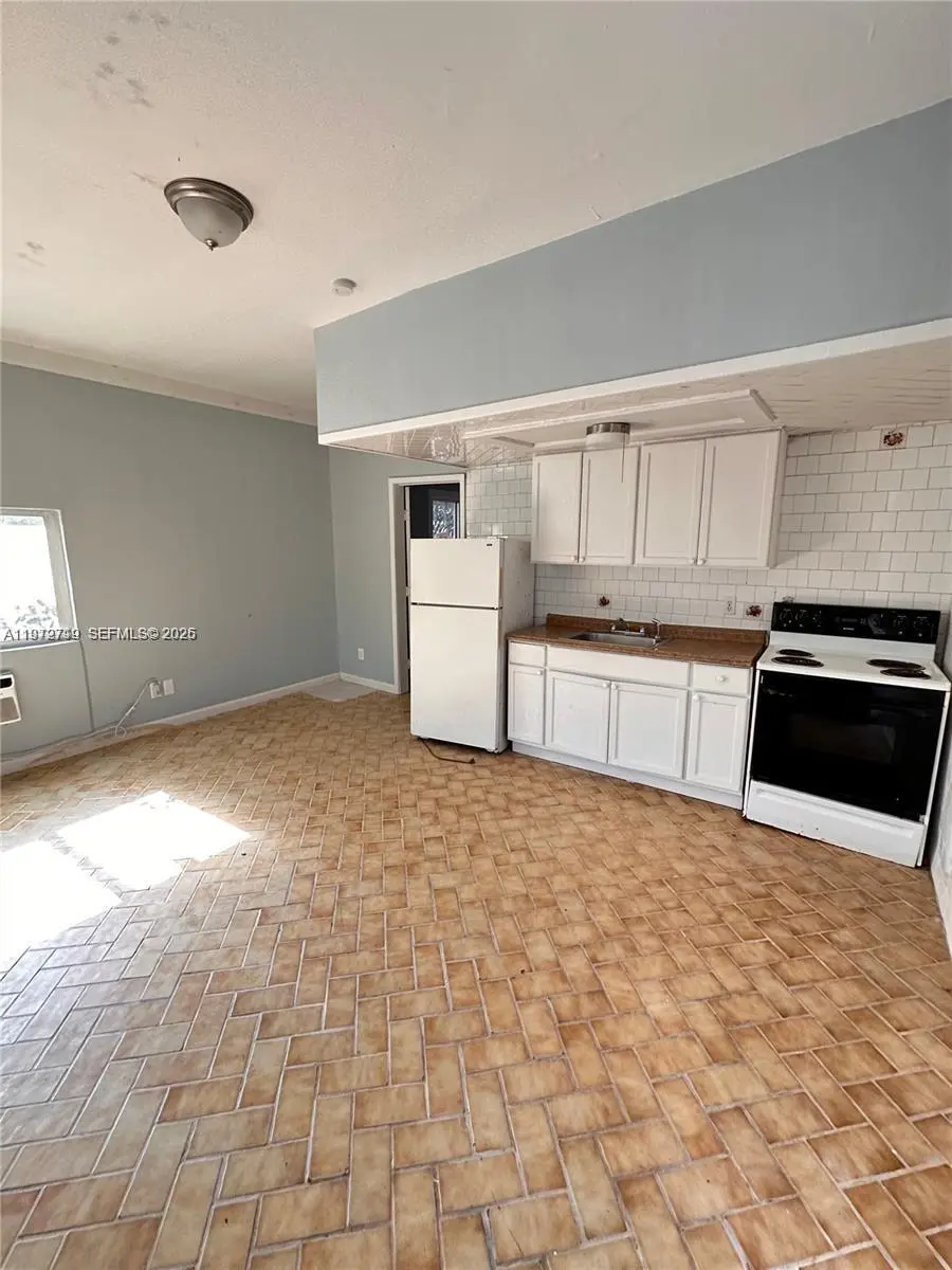 This cozy 1-bedroom, 1-bathroom rental in the vibrant Edgewater neighborhood offers a bright and open living space. The unit features a modern kitchen with white cabinetry, a stainless steel sink, a refrigerator, and a stove, complemented by classic white subway tile backsplash. The spacious living area boasts herringbone-patterned tile flooring and large windows that allow natural light to flood in. A convenient closet and additional storage space are included in the bedroom, which is adorned with neutral tones and a clean, minimalist design. Located in the heart of Edgewater, you'll enjoy easy access to downtown Miami, the Design District, and waterfront attractions. Perfect for those seeking a stylish urban apartment!