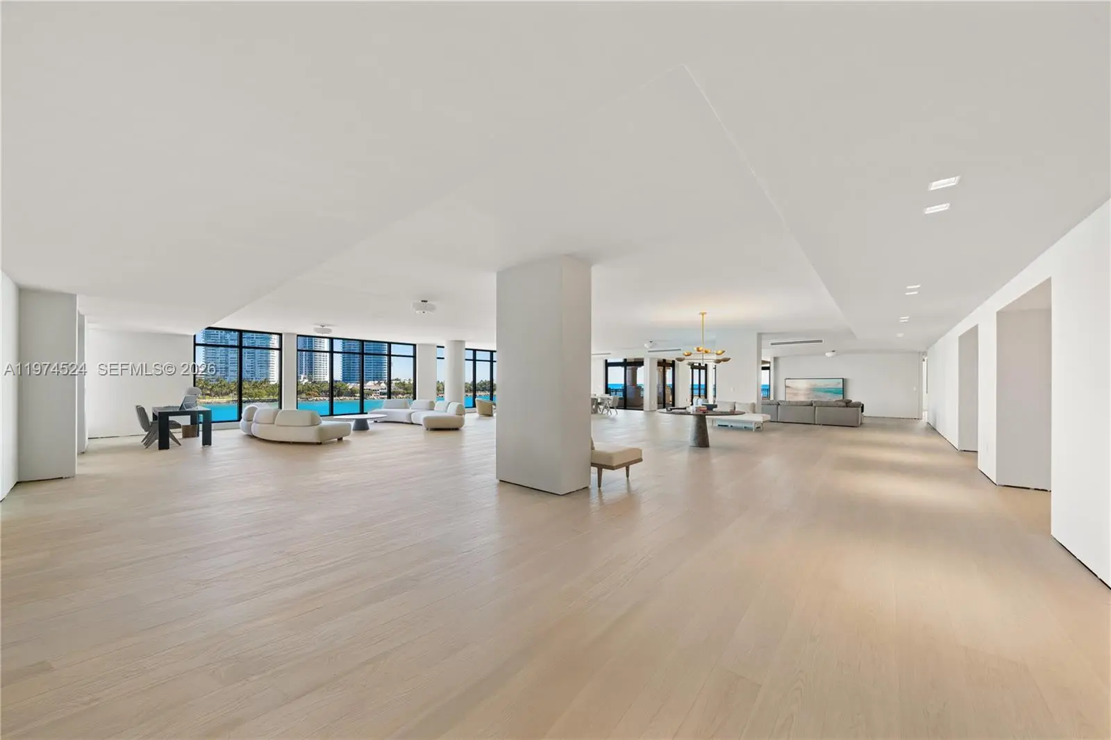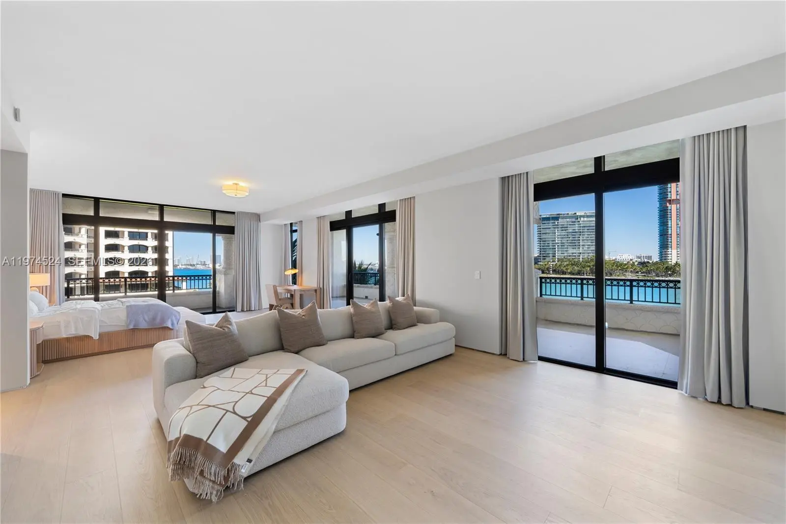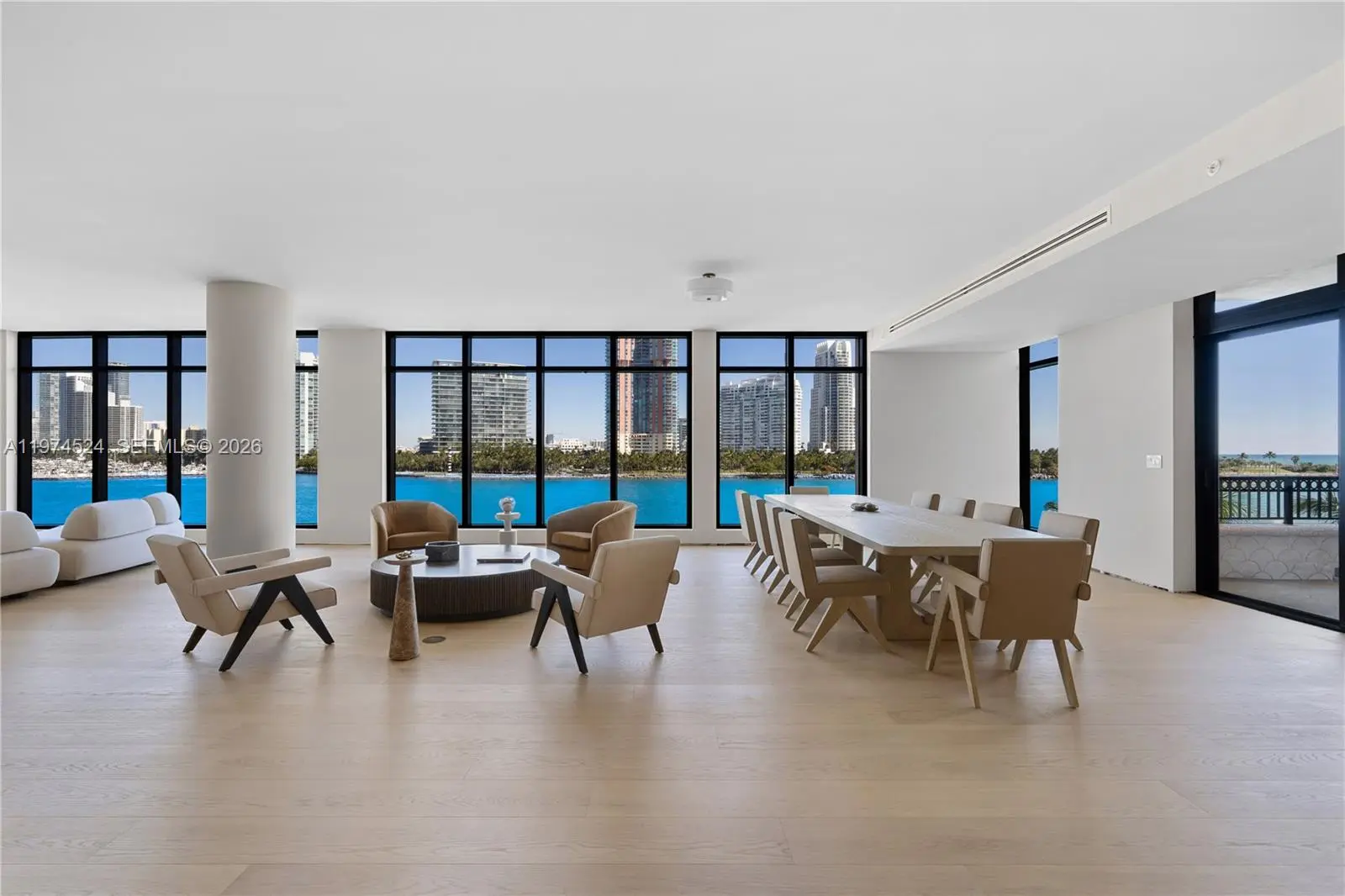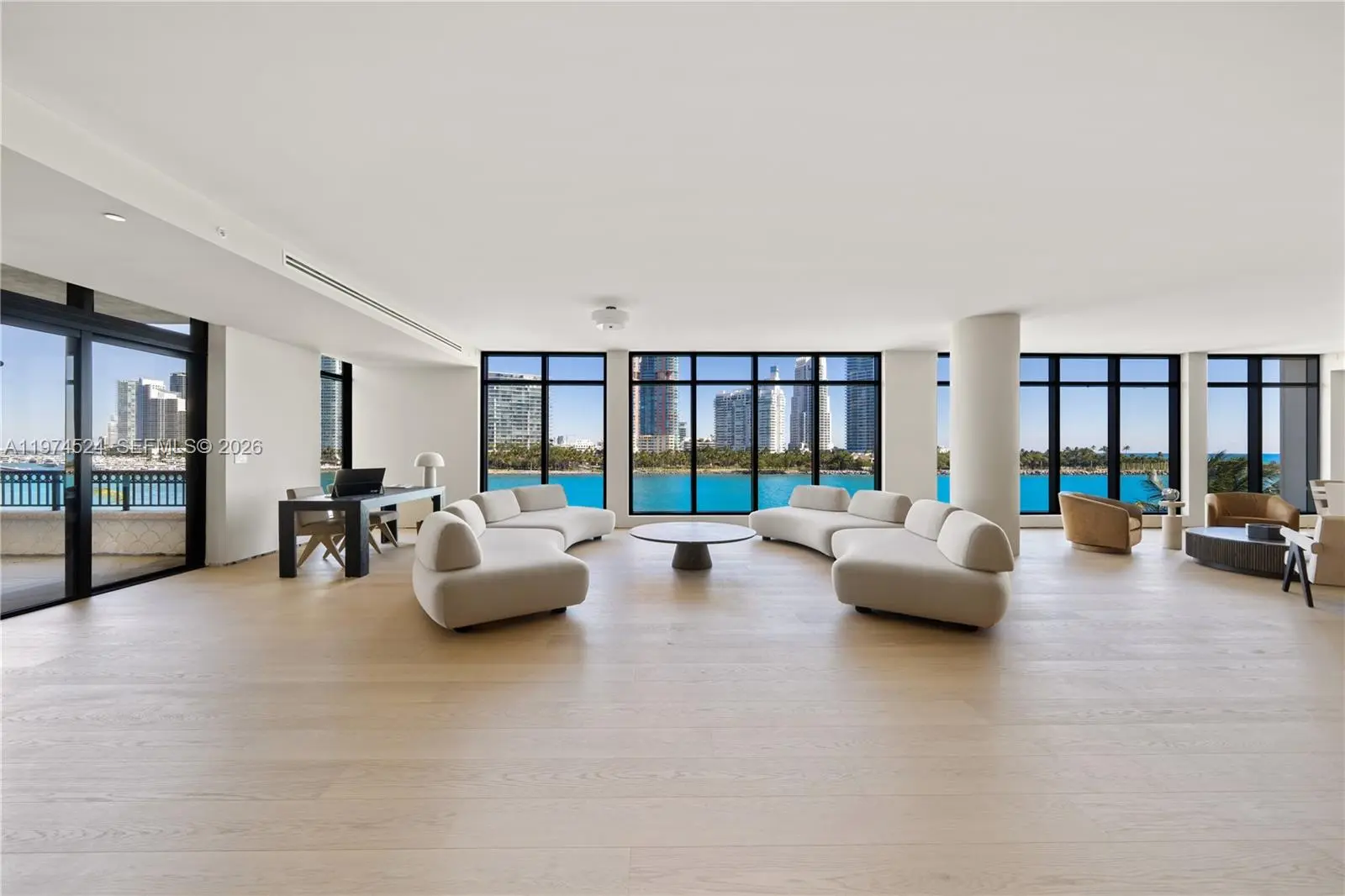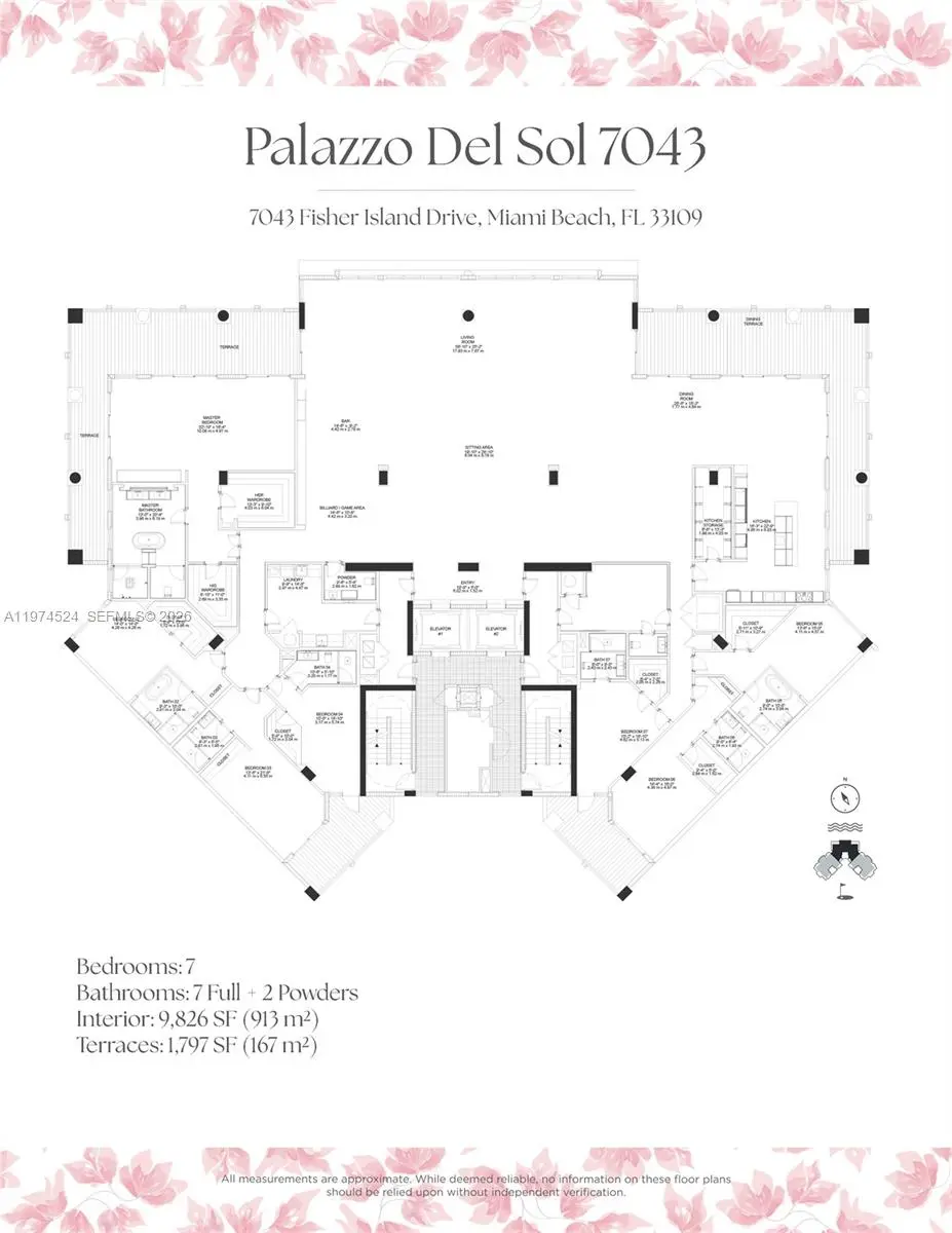 A RARE FIND ON THE ULTRA EXCLUSIVE FISHER ISLAND… NEARLY 10,000 SF OF INTERIOR LIVING AT THE 6-STAR FULL-SERVICE PALAZZO DEL SOL WITH SWEEPING WATER & CITY VIEWS! This Move-In-Ready, Expansive Full-Floor Residence features 7 bedrooms + 7 bathrooms + 2 powder rooms. Spanning 9,826 SF of Interior Living Space + 1,797 SF of Deep Wrap-Around Terraces enjoy Sunrise & Sunset Views. 2 Private Elevators lead you to a Bayfront Great Room with Elegant Formal Dining & Lounging Areas. European oak wood flooring throughout. Boffi eat-in kitchen with Bohemian grey granite countertops, Gaggenau appliances, Dornracht faucets, Sub&Zero fridge & wine cooler. Primary Suite with Sunset Views + a separate Lounging Area. Primary Bath in Book-Matched White Carrara Marble, Double Vanity Sink, Custom Fisher Island Boffi Soaking Tub + Rain shower. 3 parking spaces + 1 golf cart parking space. Palazzo Del Sol is an Award-Winning Building by Architect Kobi Karp, with Public Spaces by Antrobus Design, and Built by ASR Construction. Building Amenities & Services include Butler-Serviced Aperitivo Bar & Lounge, Theater, Hair & Makeup Salon, Private Massage Rooms, Business Center, Gym & Cardio Room, Kidville Playroom, Concierge, Valet, Zero-Edge Pool & Spa with Attendant.