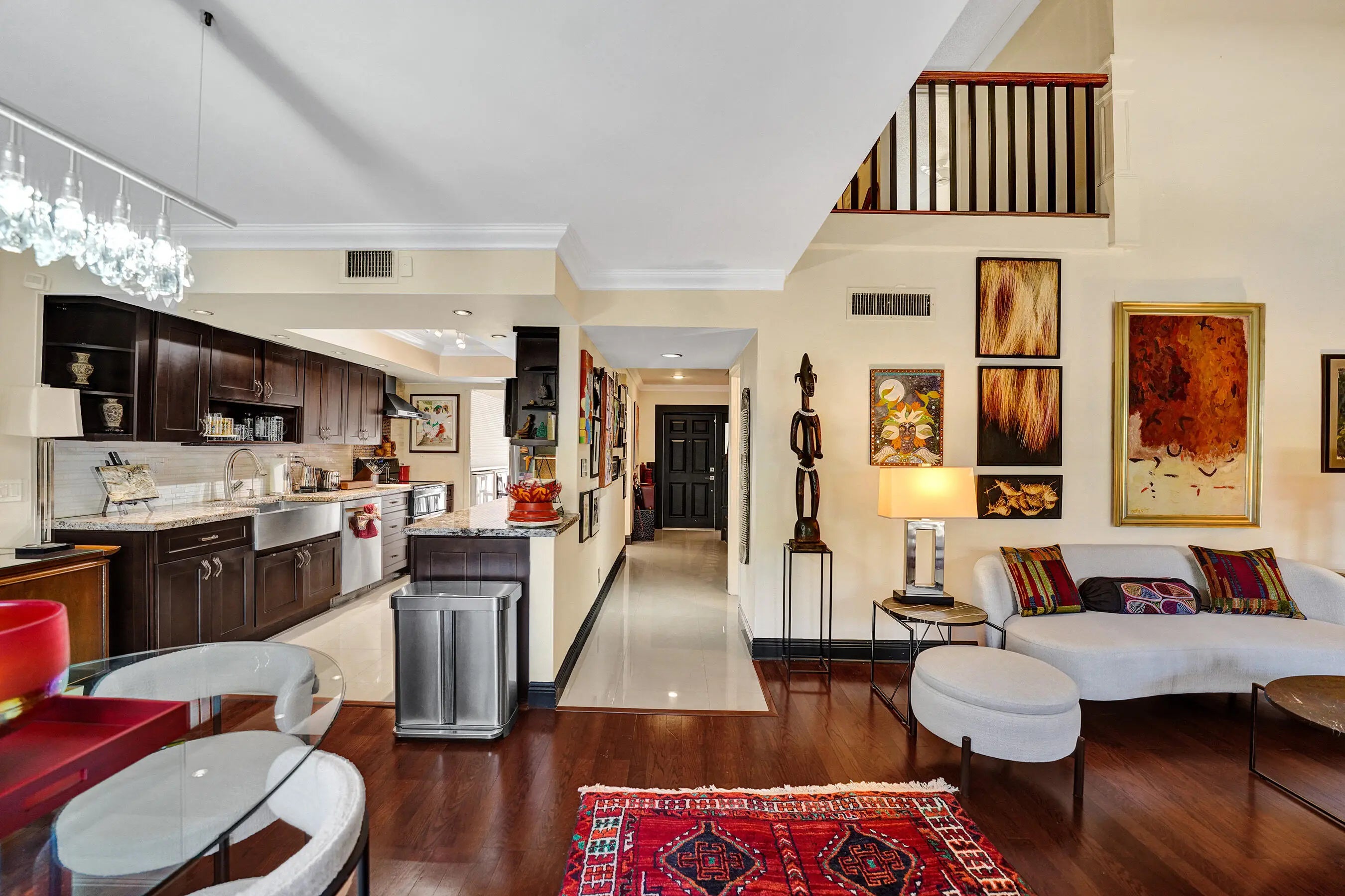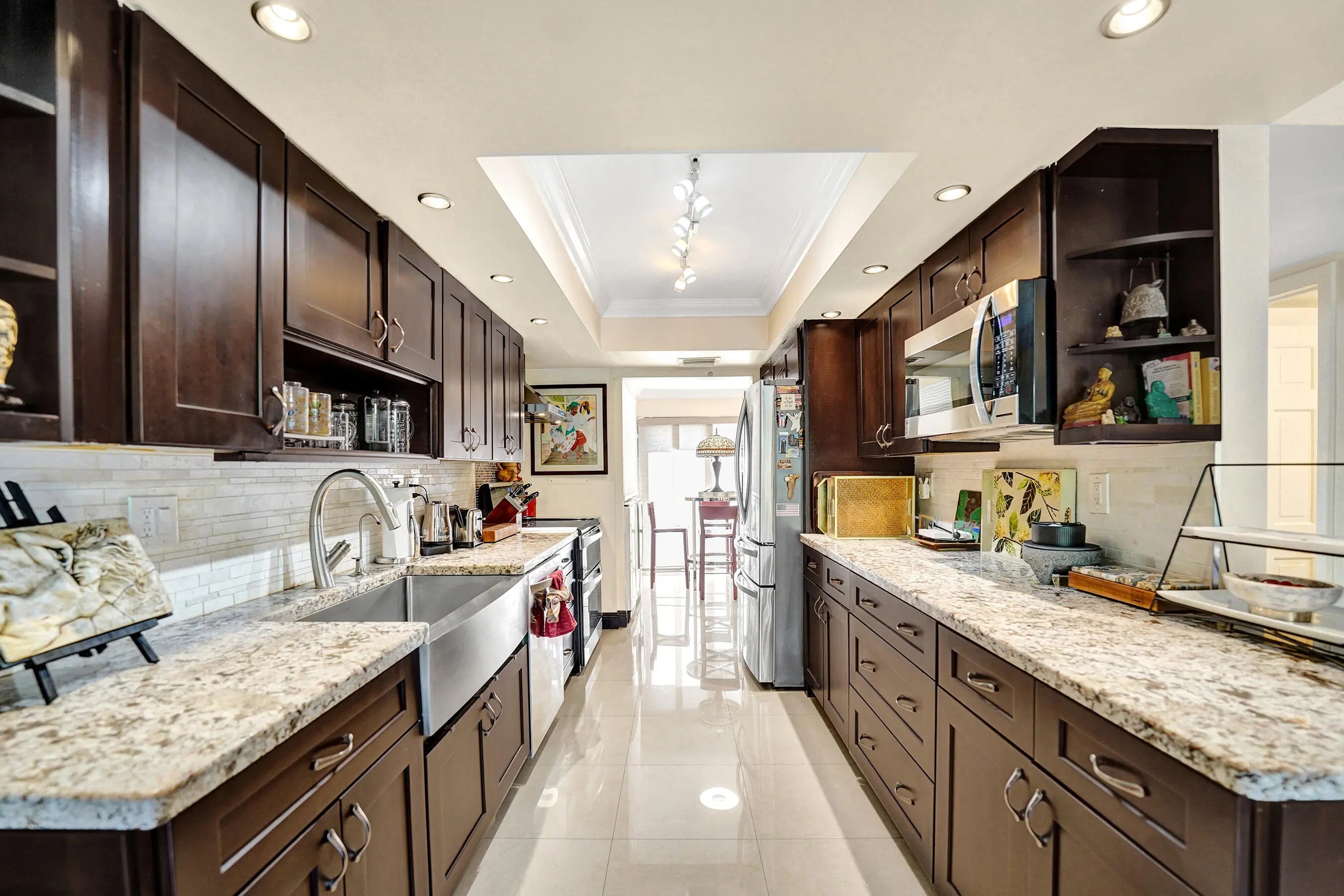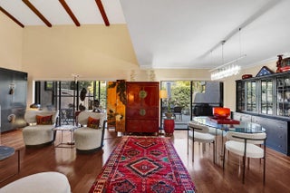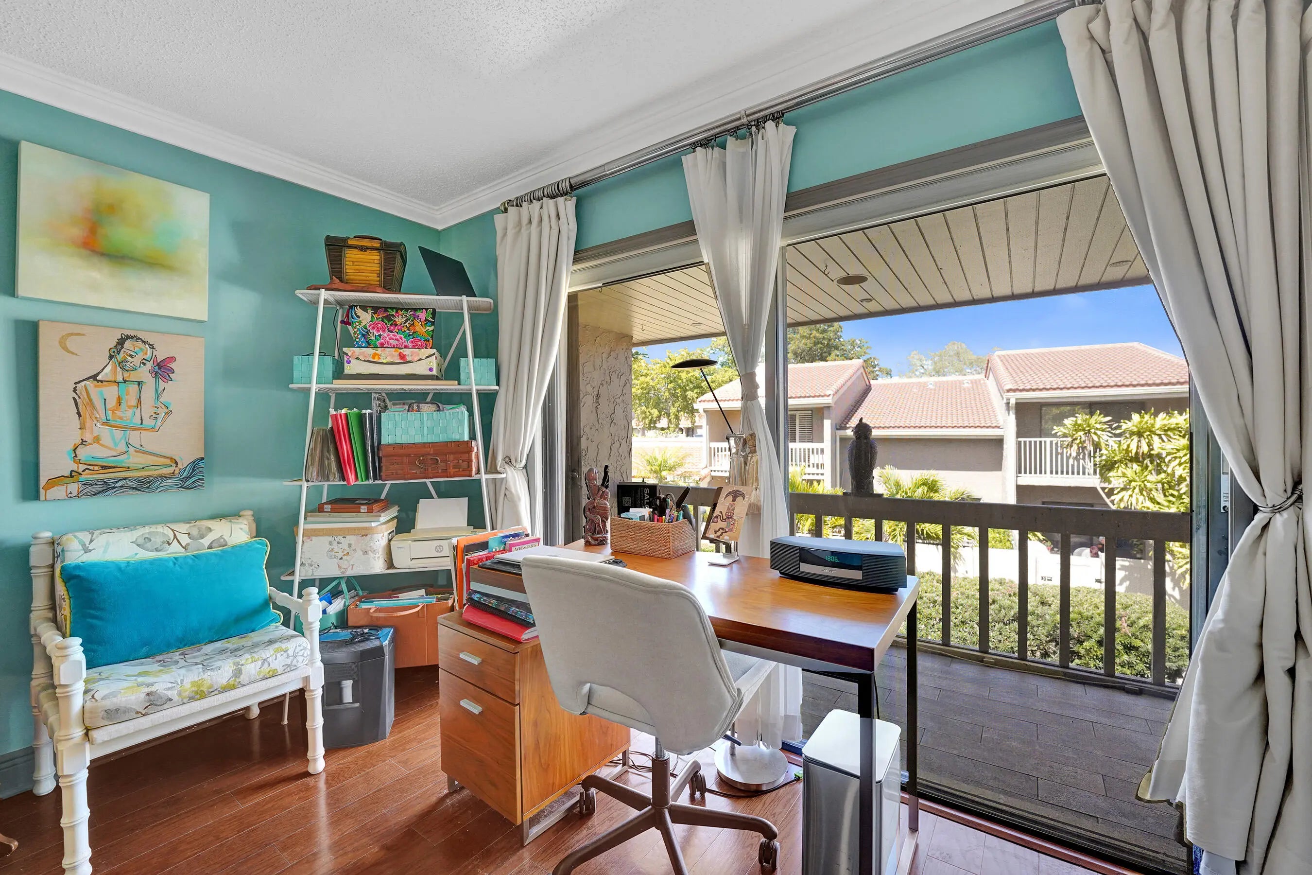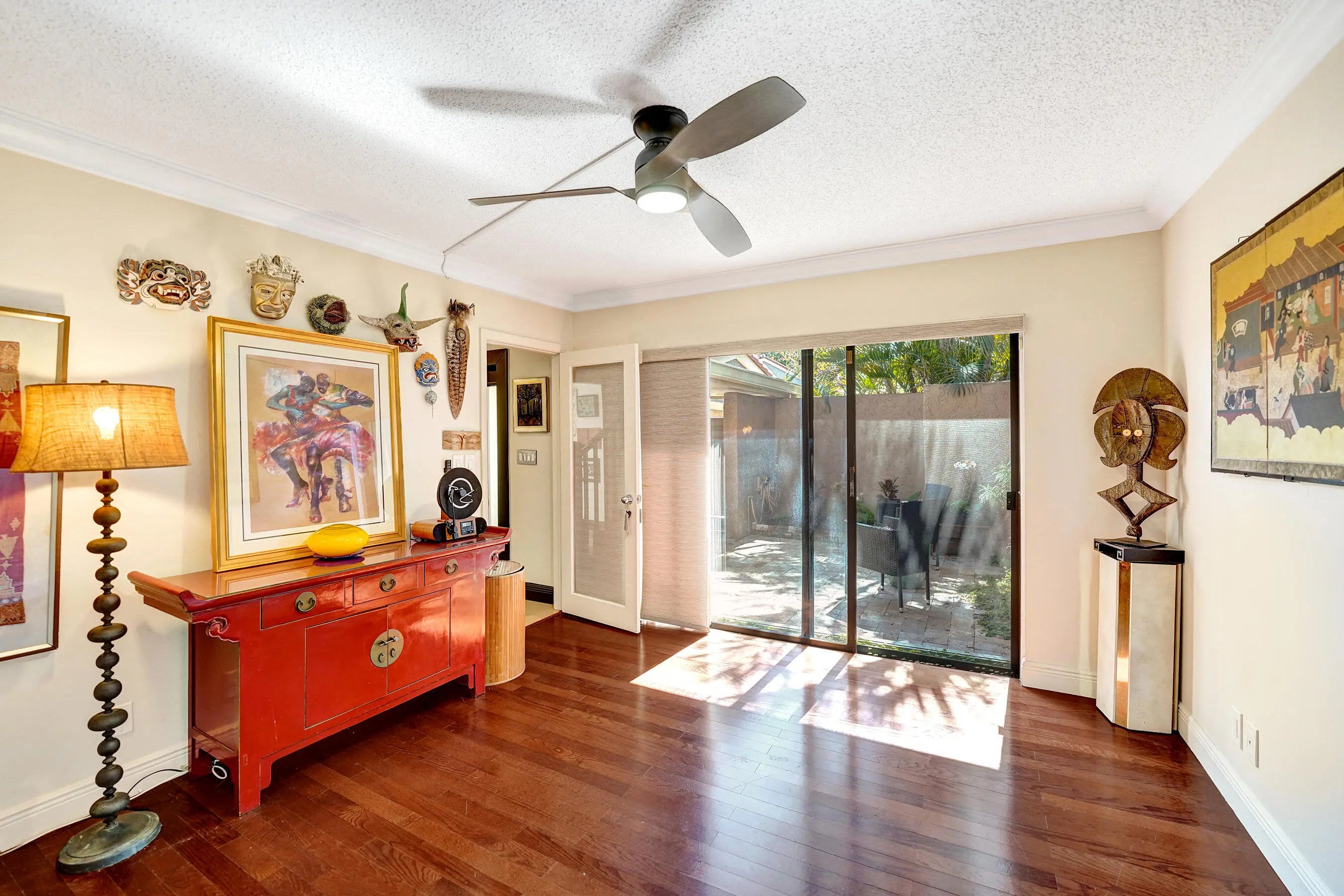 Welcome to this modern designed ensuite 3 bed, 3 bath, 2 story townhome in Emerald Hills. This spacious home features a bright, open floorplan with vaulted 17' wood beam ceilings in the great room. The galley kitchen offers granite topped wood cabinetry that are soft close, stainless steel appliances, double oven, tray ceiling and farmer sink. Breakfast nook/ laundry area flows from the kitchen. 1 bed/1bath are on the main floor with access to front patio. Primary features a walk in closet, marble tiled bathroom with shower plus jacuzzi tub. Spacious front and rear travertine tiled patios surrounded by natural landscaping. Accordian shutters, impact front door. Garage parking plus 2 spaces. Ample guest parking, pool, clubhouse, gym. Close to beaches, parks, airport, highways, art district