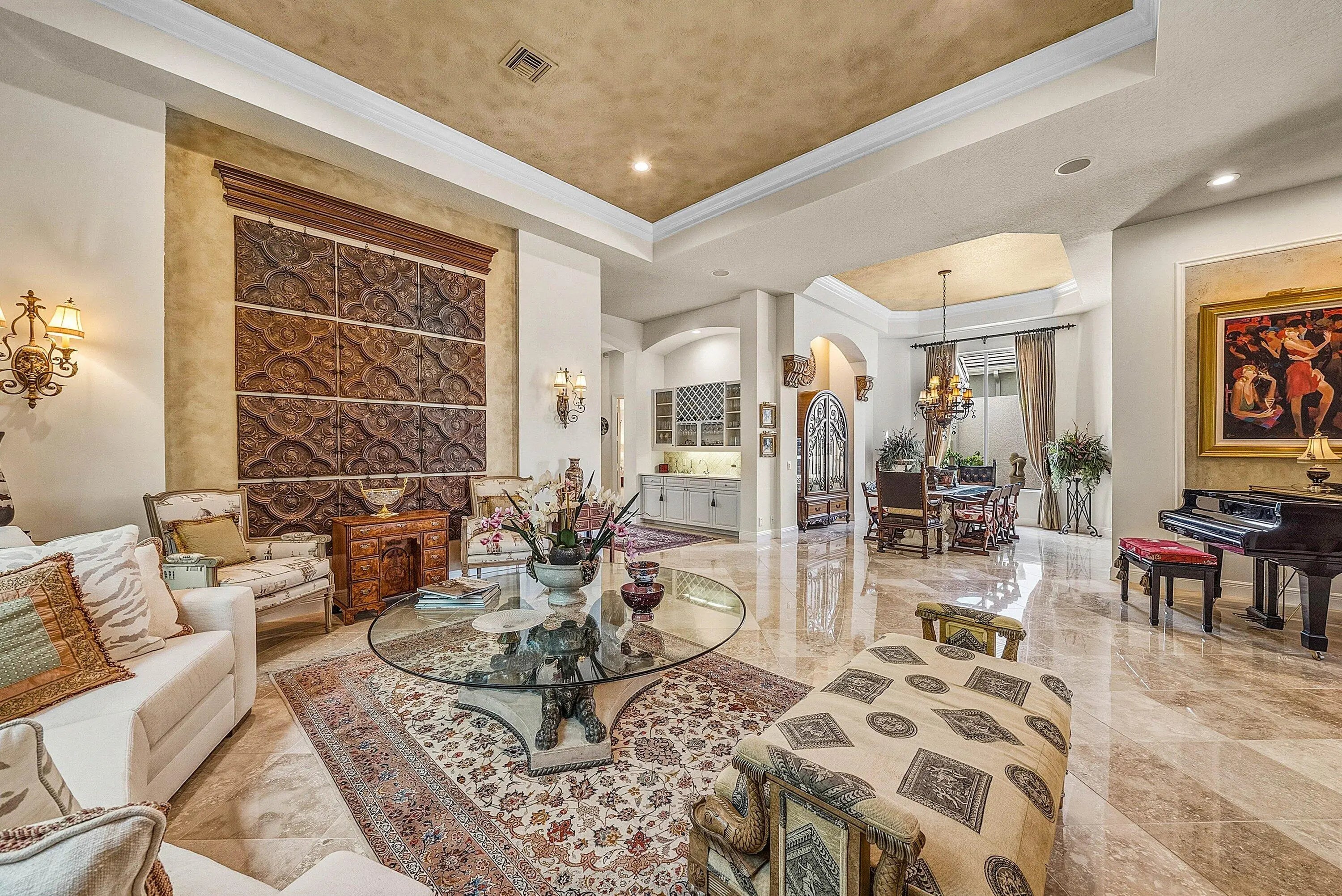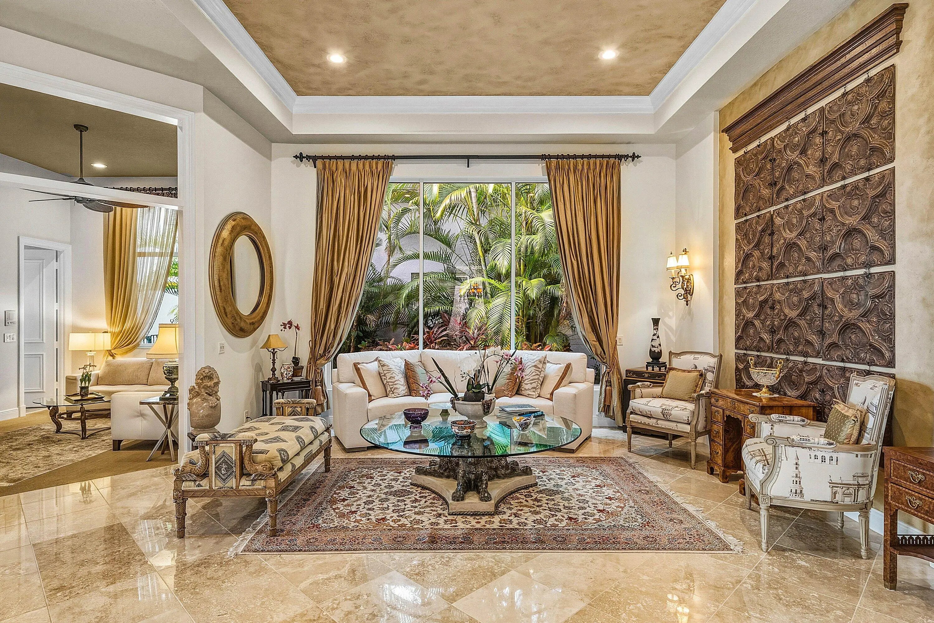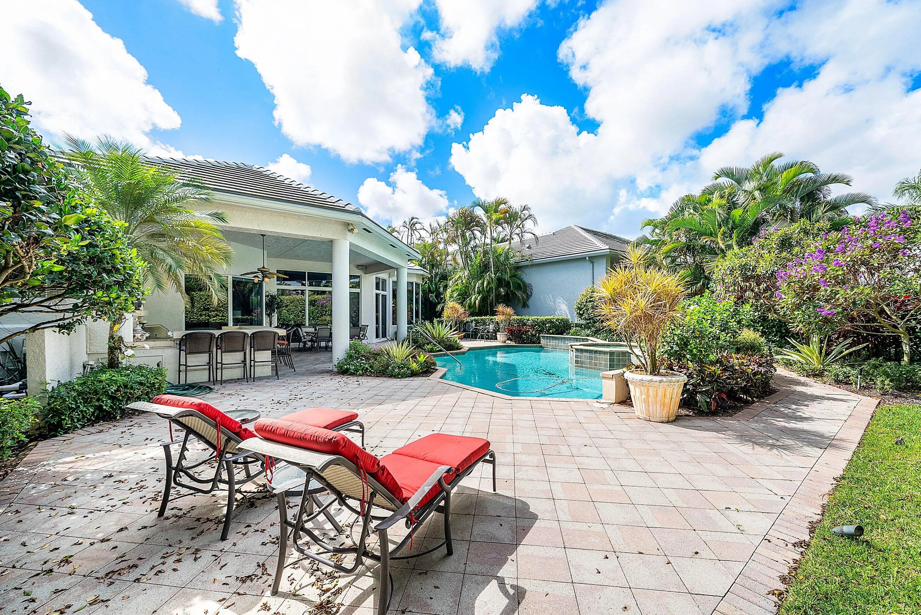 Exceptional single-story residence available in Ballenisles, offering over 4,100 sq ft of living space. This spacious home features 3 bedrooms plus an office and 4.5 bathrooms. Rackets membership is available for purchase with this home or immediately upgrade to Sports membership. Upon entry, you are welcomed by a grand foyer highlighted by impressive 15 foot ceilings and gleaming marble flooring. The home offers an inviting and spacious layout ideal for both everyday living and entertaining, featuring a wet bar, a generous family room just off the kitchen, and a wall of windows along the rear of the home that showcases the picturesque vistas. Detailed moldings, graceful archways, soaring ceilings, and timeless décor enhance the elegance throughout. The expansive primary suite is a peaceful retreat, featuring tray ceilings and a private sitting area overlooking the tranquil pool and garden views. Separate his and her bathrooms offer comfort and convenience, with his also serving as a cabana bath. The suite is complete with a separate soaking tub, glass-enclosed shower, and two oversized custom walk-in closets. The guest accommodations are equally impressive, offering spacious ensuite bedrooms. Guest bedroom two features a charming interior courtyard, allowing natural light to fill the space and adding a unique outdoor element. Step outside to the private patio where lush hedges frame beautiful views of the rolling fairways of the South Course's 14th hole. The outdoor living area is perfect for entertaining, featuring a covered patio, summer kitchen, and a custom heated pool and spa designed for year-round enjoyment. Ballenisles Country Club is recognized as a 5-star platinum rated club offering world class amenities and facilities with three championship golf courses, a top rated tennis & pickleball facility, beautiful renovated clubhouse and sports complex, six dining options, fitness center, spa & salon, community pool, dog park, walking paths, and so much more.