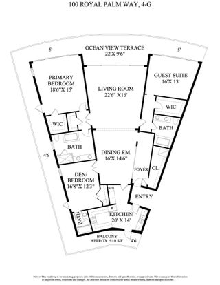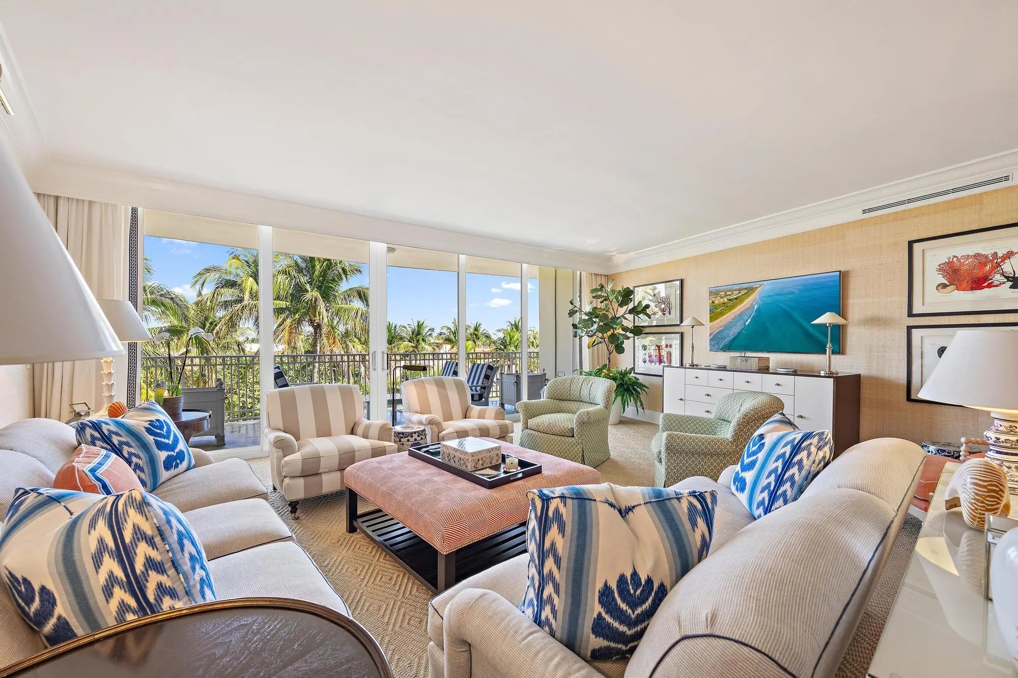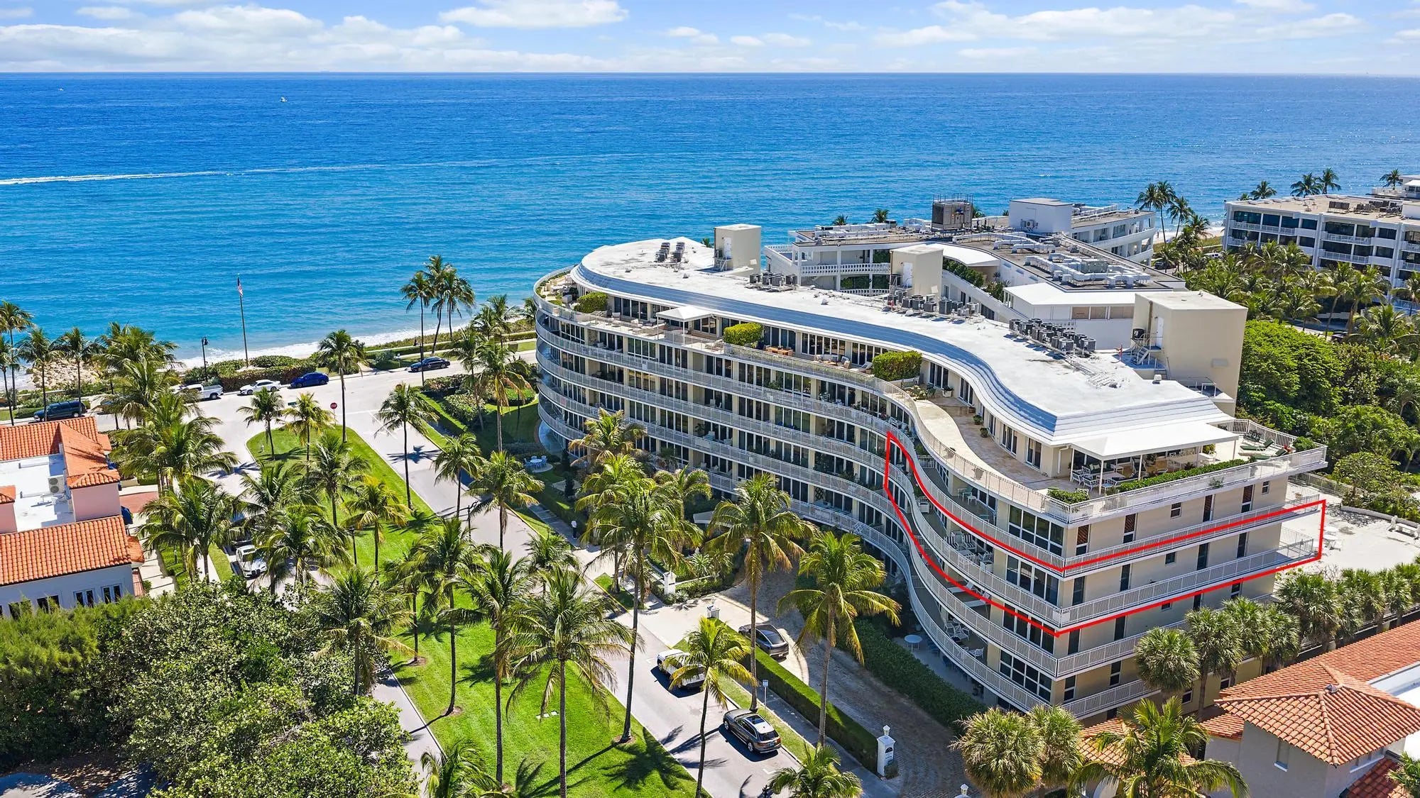 Experience refined Palm Beach living in this beautifully appointed residence at 100 Royal Palm Way, an iconic Howard Chilton Art Moderne, ocean front boutique building. With tropical views and a generous, well-designed layout, this three-bedroom, three-bath condominium, with over 3000 total square feet, offers an inviting blend of comfort, style, and coastal sophistication. The spacious living room and semi-formal dining area create an ideal setting for both everyday living and entertaining, while the eat-in kitchen--with its convenient service entrance--adds practicality and ease. Wood flooring enhances the main living spaces, and each bedroom features an en-suite bath, and ample closet space. A large balcony extends the living area outdoors, providing the perfect spot to enjoy the ocean breeze and morning light. Set within a prestigious doorman building, residents enjoy exceptional amenities including garage parking, a pool, a fitness center, and the support of a full-time on-site manager. Perfectly positioned across from the beach and just moments from world-class shopping, dining, and the scenic Lake Trail, this residence offers an unparalleled combination of luxury, convenience, and Palm Beach lifestyle.