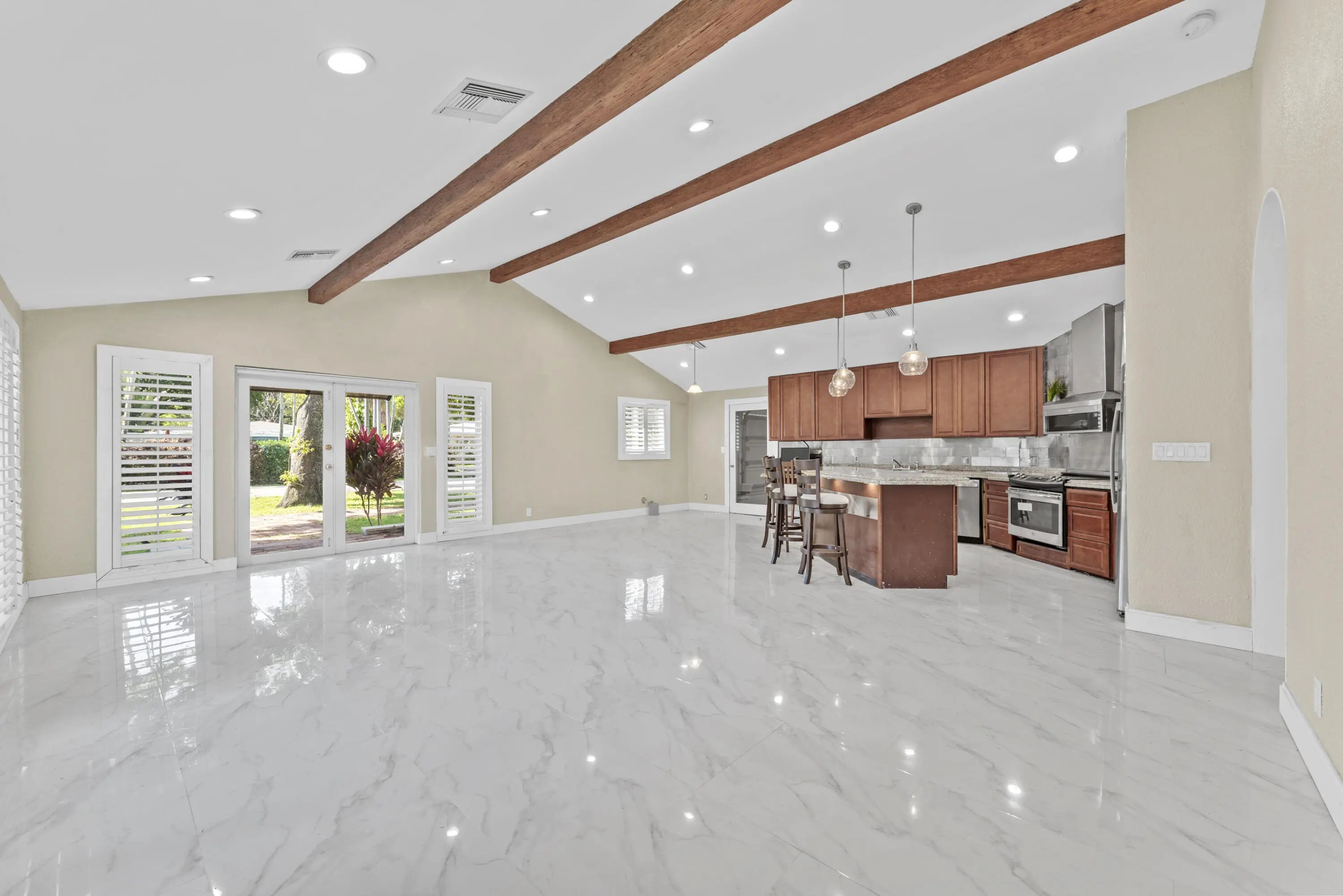 Welcome to this beautifully updated home located in the highly sought-after Shady Banks neighborhood of Fort Lauderdale, just minutes from Las Olas, downtown, I95, FLL airport, and the beach. This property perfectly combines classic South Florida charm with modern finishes. Property Highlights 2 Bedrooms, 2 Bathrooms Spacious open-concept living area with abundant natural light, plantation shutters, cathedral ceiling with beams. Modern kitchen featuring granite countertops, stainless appliances, and a large island. Primary suite with bath, Impact windows and doors for energy efficiency, lg attic. NO HOA, Enjoy the tranquility of a quiet street lined with mature trees, walk to Hortt Park, playground, workout stations, tennis, volleyball, basketball, and ball field. "Hidden gem"neighborhood