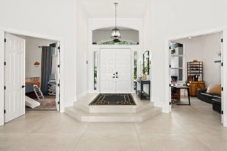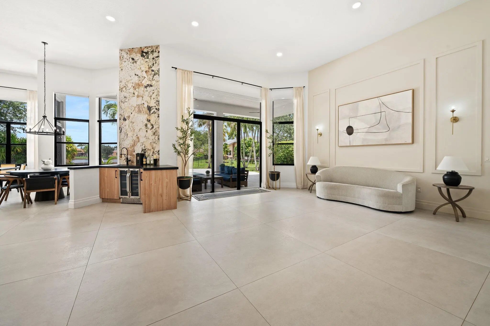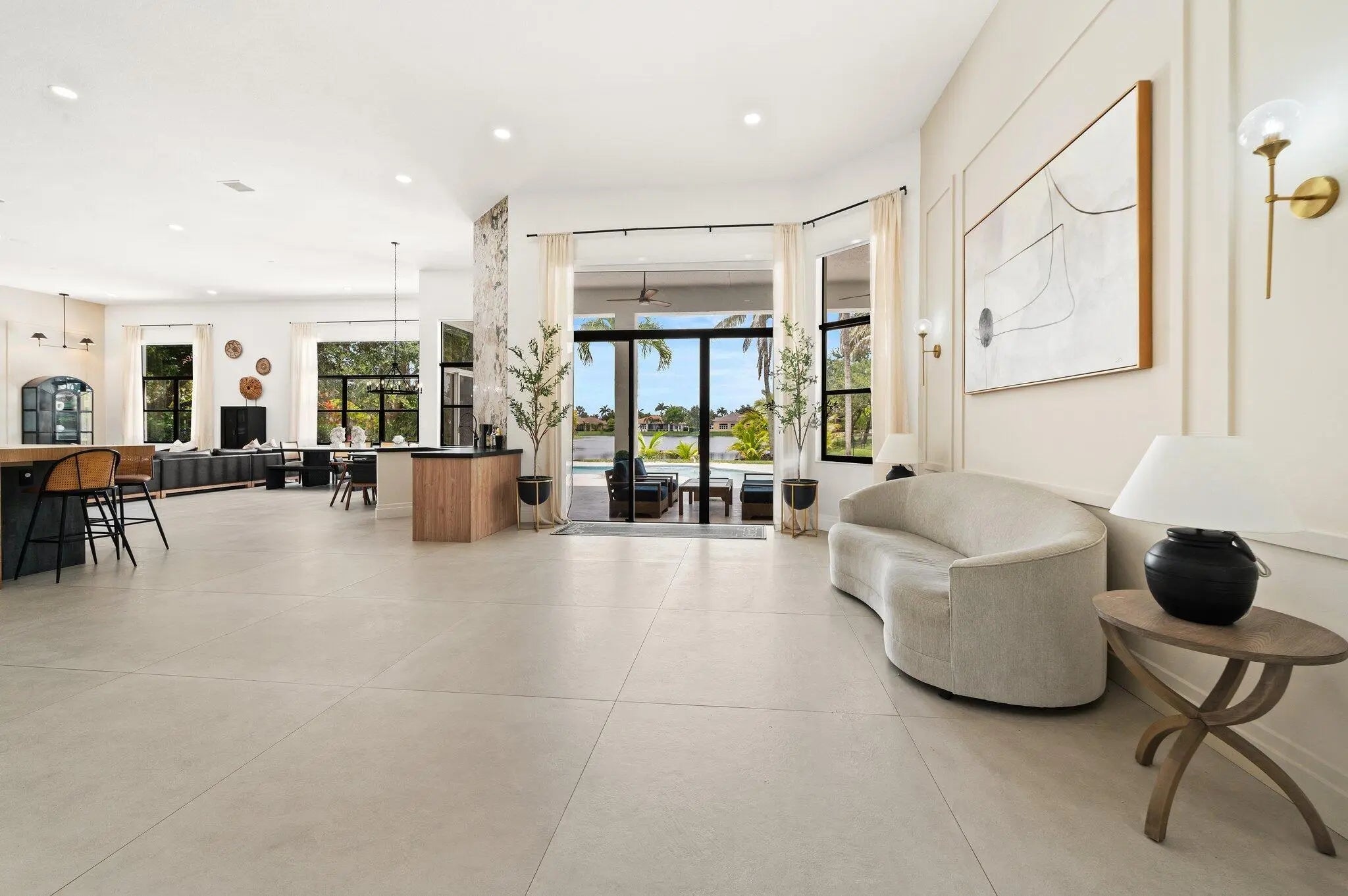 Fully renovated and professionally designed lakefront 6BR/4BA home in a private gated community in Davie, offering modern luxury and resort-style living. Bright open layout with 14-ft ceilings, abundant natural light, and sleek Italian porcelain flooring. Chef's kitchen features custom cabinetry, high-end appliances, spacious pantry, and generous counter space. Primary suite with hardwood floors, dual custom walk-in closets, and spa-style bath with double rain showers. Enjoy seamless indoor-outdoor living with a renovated saltwater pool, new marble deck, lake views, and a fully equipped outdoor kitchen. Bonus room ideal for office/gym + renovated epoxy-finished garage. Move-in ready with high-end finishes in one of Davie's most desirable gated