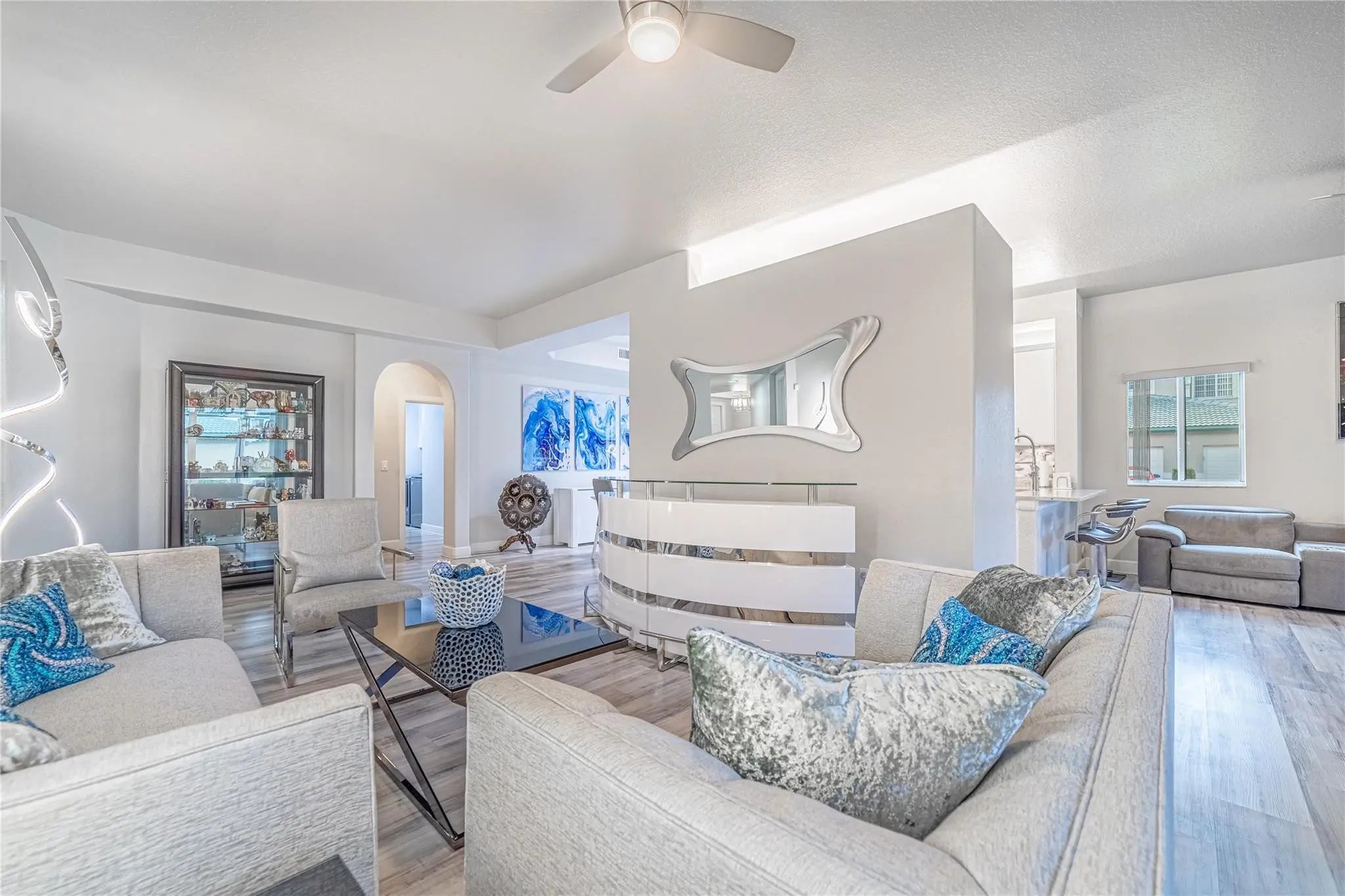 Welcome to this fully turnkey residence in the highly sought-after Kings Point community. No detail has been overlooked in this beautifully renovated home. Enjoy elegant laminate flooring throughout & a stunning kitchen featuring custom cabinetry with pull-out shelving, exquisite quartz countertops, & SS appliances. The bar countertop has been thoughtfully redesigned to a comfortable height & enhanced with waterfall edges. Both bathrooms have been tastefully updated completely. Additional upgrades include a new AC, WH & full-size W&D. All windows are tinted for energy efficiency & dressed with attractive vertical treatments. Remote-controlled ceiling fans are installed throughout the home for added comfort. Experience refined living in this beautifully maintained 55+ community!!!