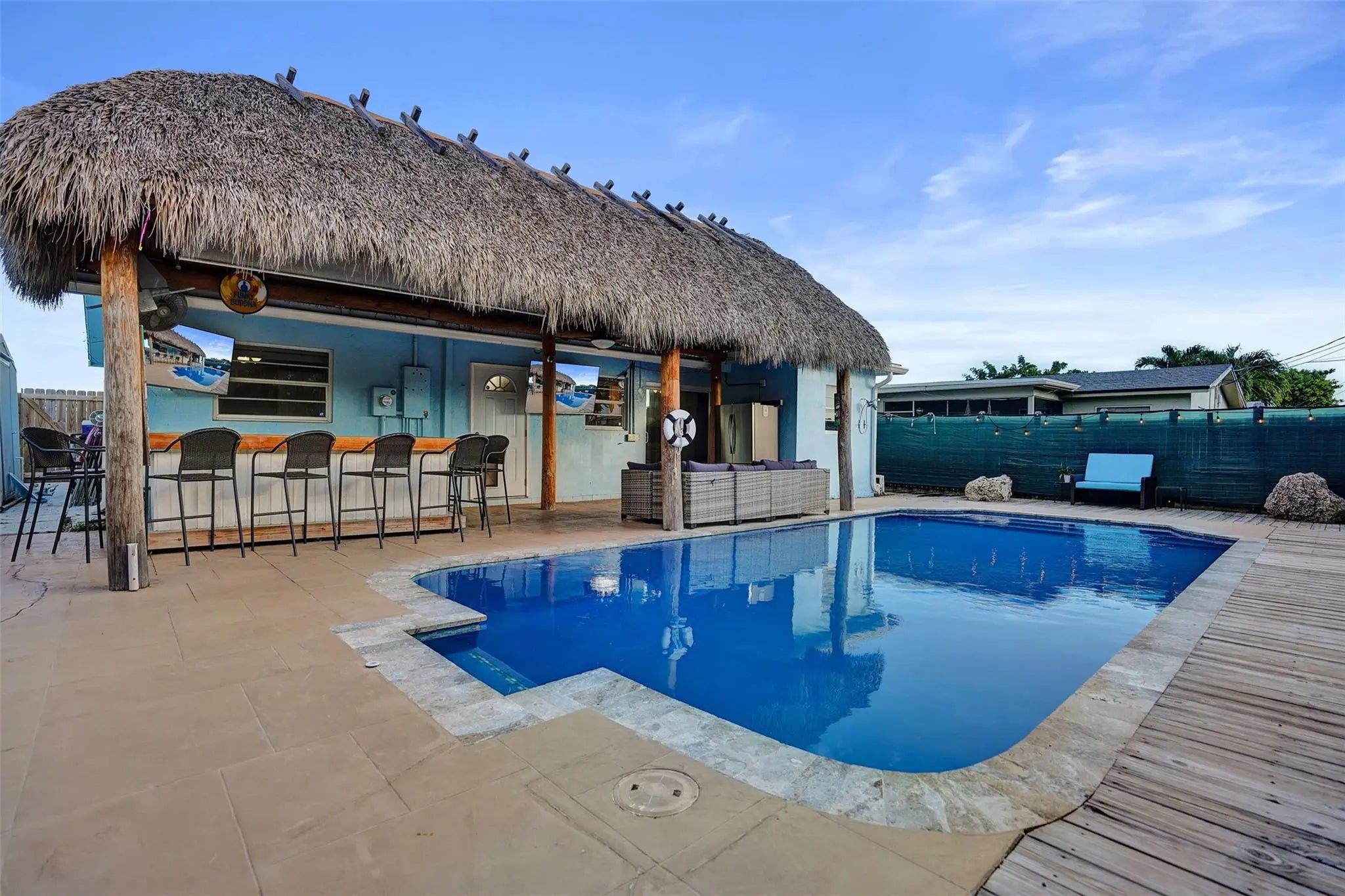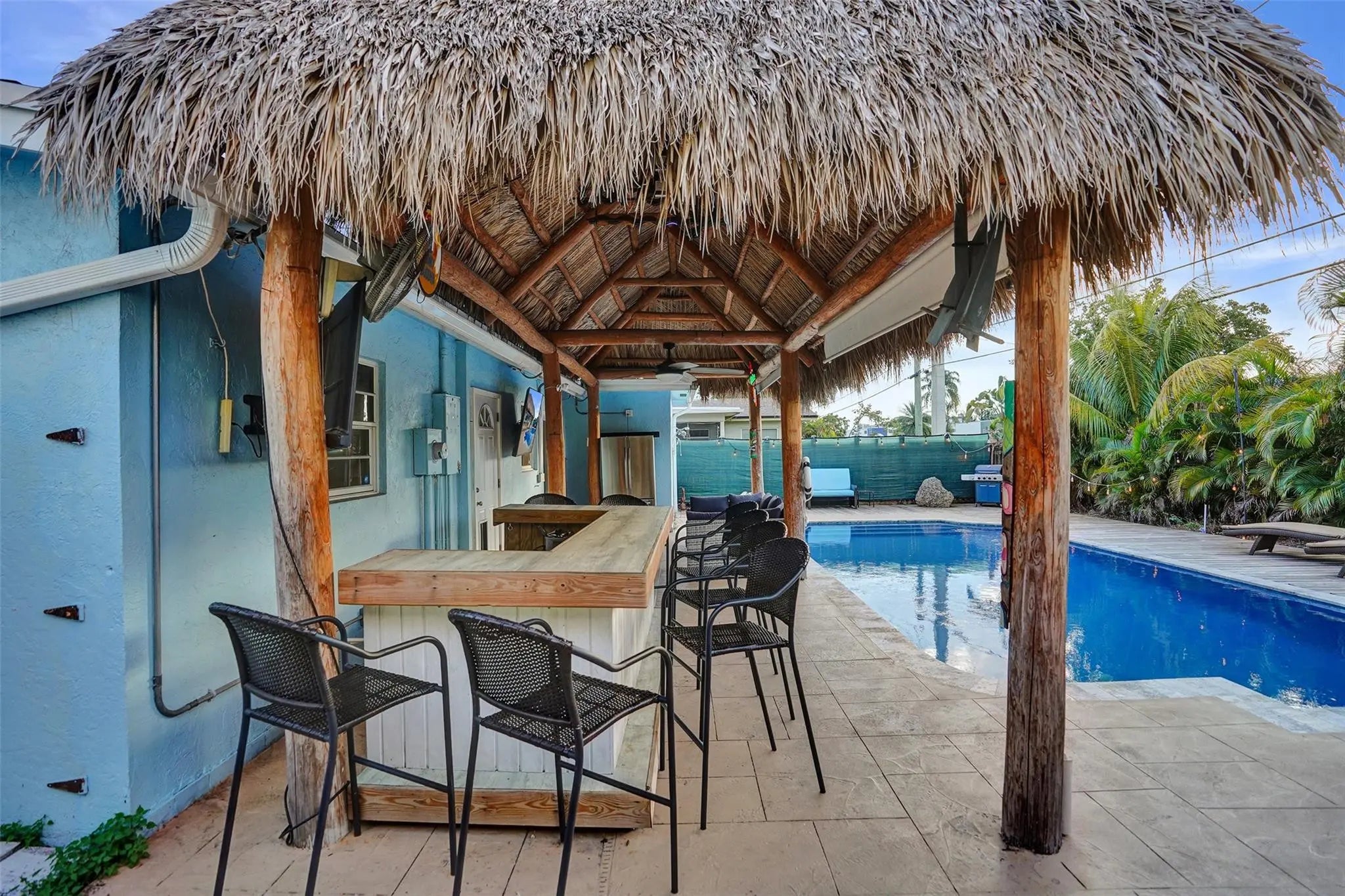 Discover your private tropical retreat in this 3 Bedroom, 2 Bathroom home in desirable East Oakland Park. The backyard offers a resort-style escape with a sparkling pool and an expansive tiki hut perfect for relaxing or entertaining. Inside, enjoy a bright open concept with a split floor plan for both flow and privacy. The kitchen and living areas connect seamlessly, complemented by a 2023 roof and interior laundry room. The primary suite opens directly to the backyard, while two additional bedrooms offer versatile use. A one-car garage provides added storage or potential flex space, with side yard space offering room to park a boat. Minutes to the beach, downtown Oakland Park, Wilton Drive, and top local dining this home blends comfort, style, and the South Florida lifestyle.