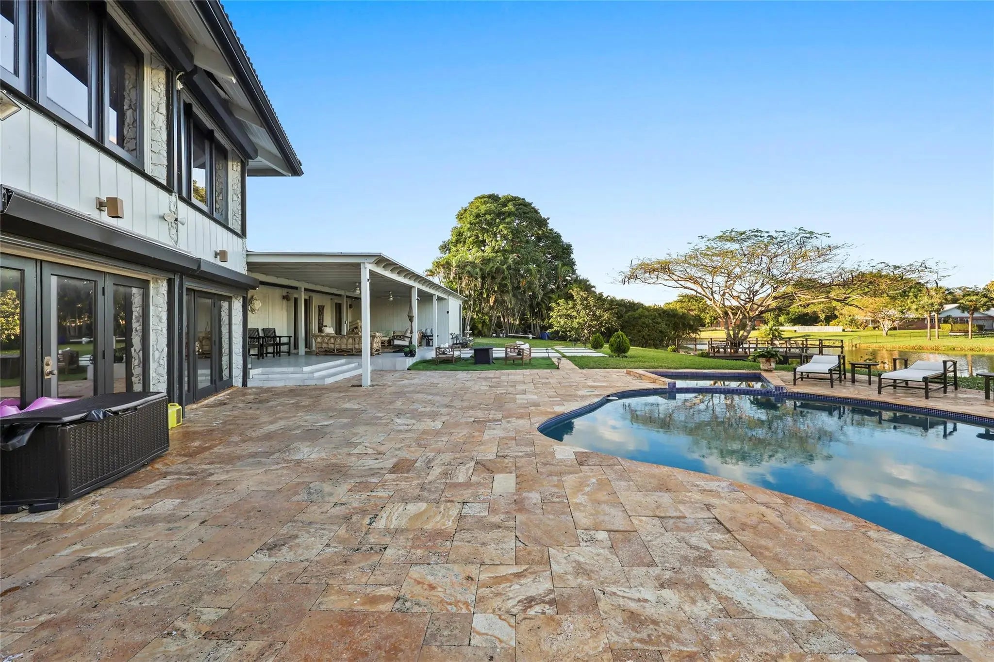 Exclusive private estate on an impressive 1.7 Acre lot in a prime location. This 6-bedroom, 5 bath residence sits up on a hill tucked away on a private cul-de-sac in the prestigious Running Brook Hills of Coral Springs. The spectacular property features its own tennis court, a remodeled pool with travertine deck overlooking a massive lake. The modern open kitchen features a massive 20ft island and integrated fridge and freezer, with hidden butler room/pantry. The oversized primary suite offers a separate soaking tub, walkthrough shower and a huge walk-in closet. Additional highlights include a dramatic circular great room with soaring 26-foot ceilings, a lofted library, skylights providing abundant natural light, and a large formal dining room. No HOA.