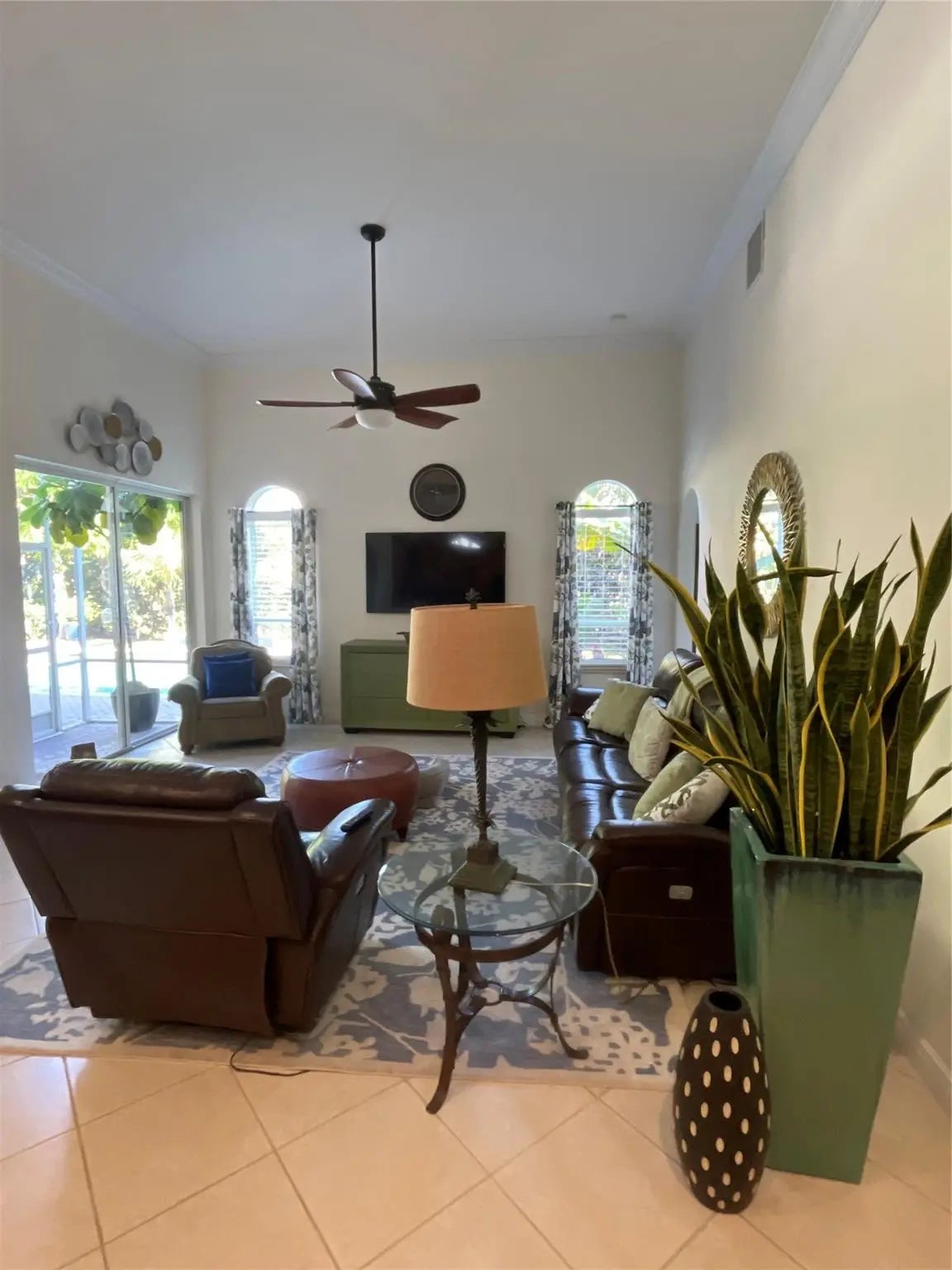 Welcome to your new home. Beautifully appointed 4-bedroom, 3-bathroom home with an additional den/office/library. Home features elegant crown moldings and baseboards throughout. Tiled throughout common areas, Wood / Laminate flooring in bedrooms. Spacious screened back patio. The home boasts two recently remodeled bathrooms and is located in the desirable, gated Windsor Bay community.Set on an expansive 11,000+ square-foot lot, the lush outdoor space is a true tropical retreat, showcasing exotic fruit trees along with vibrant tropical flowering plants.