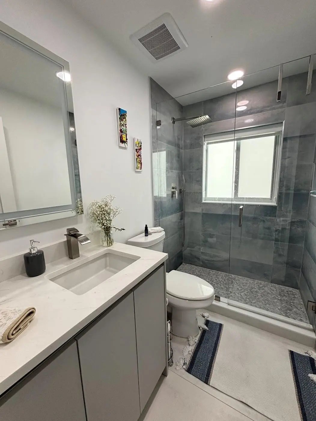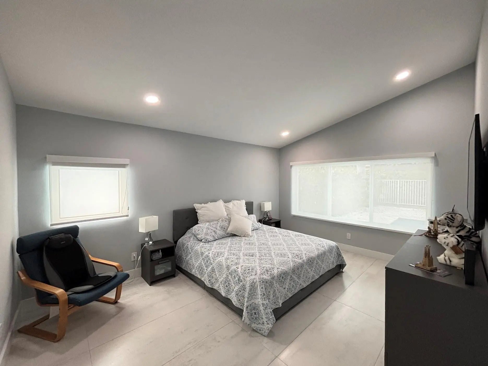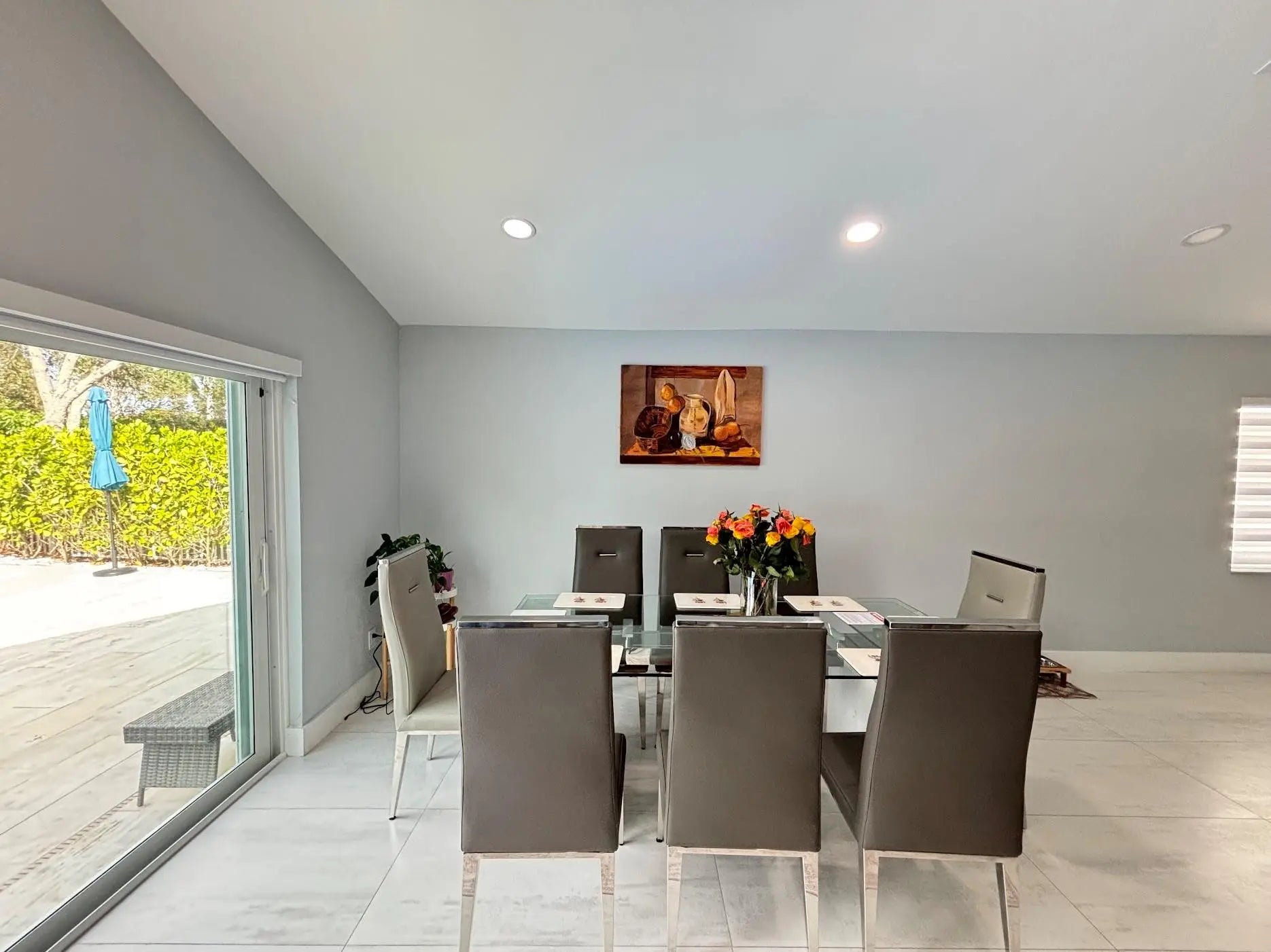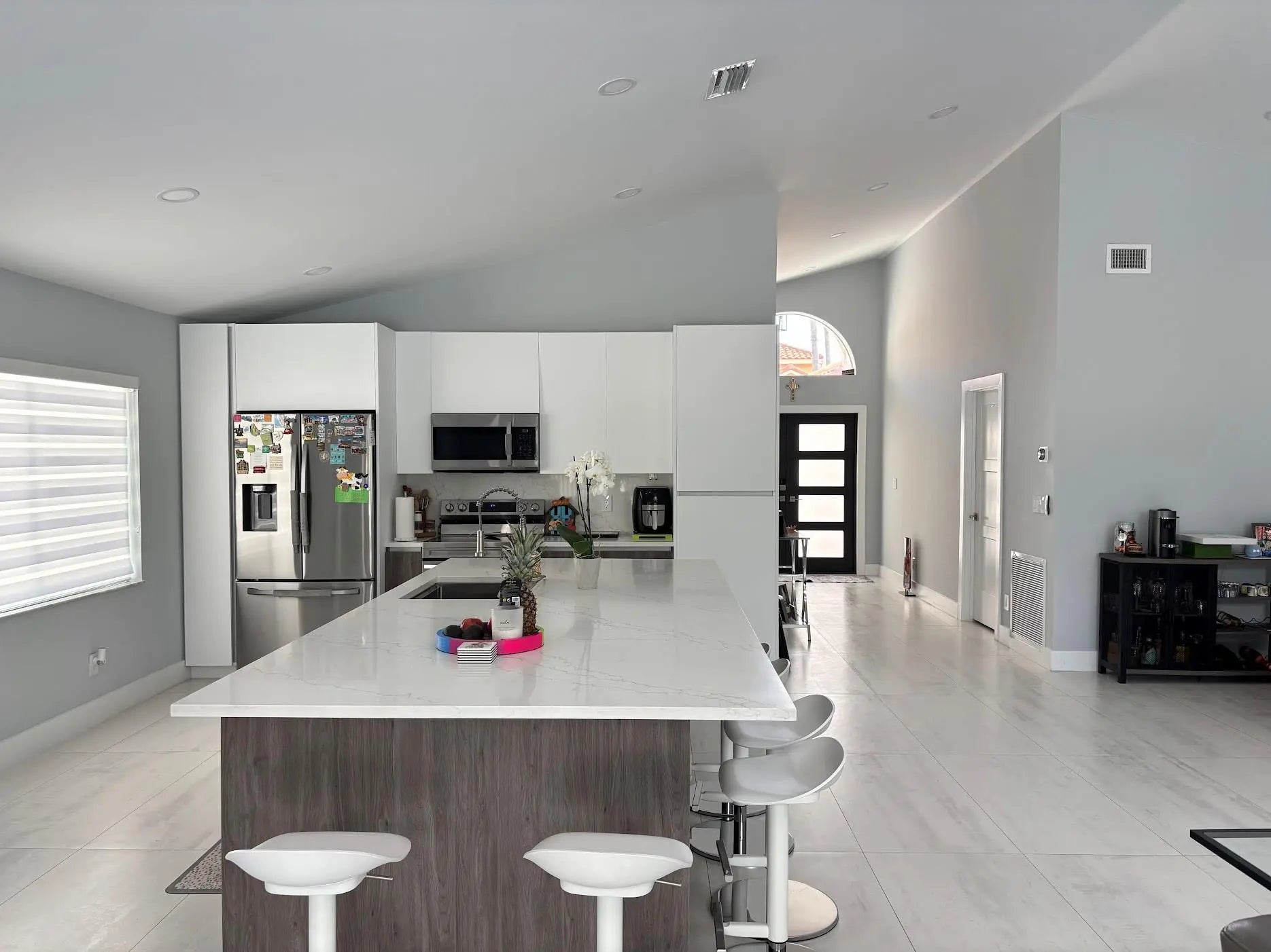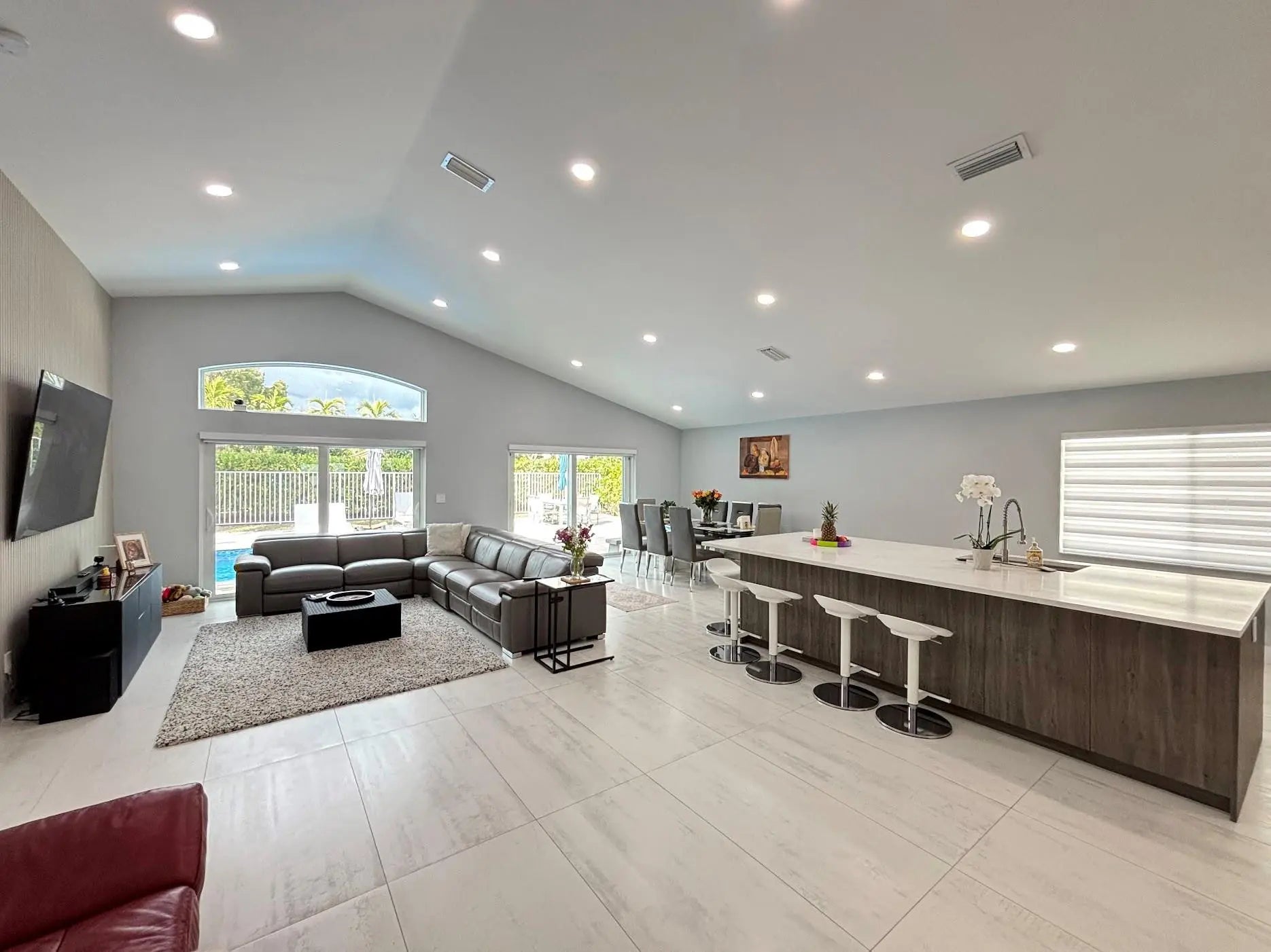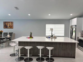Beautiful single family 3 bedrooms 2 full bathrooms with two car garage. Completely renovated! Featuring a gourmet kitchen with, quartz counter-tops, white cabinetry, stainless steel appliances, and an amazing island accented with walnut wood cabinetry. An elegant foyer, with vaulted ceilings brings the sophisticated aspects of an open floor plan. Porcelain tile throughout the entire house, primary bathroom and guest bathroom displays an elegance with a stand up showers and enclosed frameless glass doors. There is a lot of natural light. Impact windows and customized blinds and shades, living room window and dining room sliding door blinds have motors with remote controls. Swimming pool recently built with a marble deck floor, fully fenced, A/C 4 years. This is absolutely breath taking!