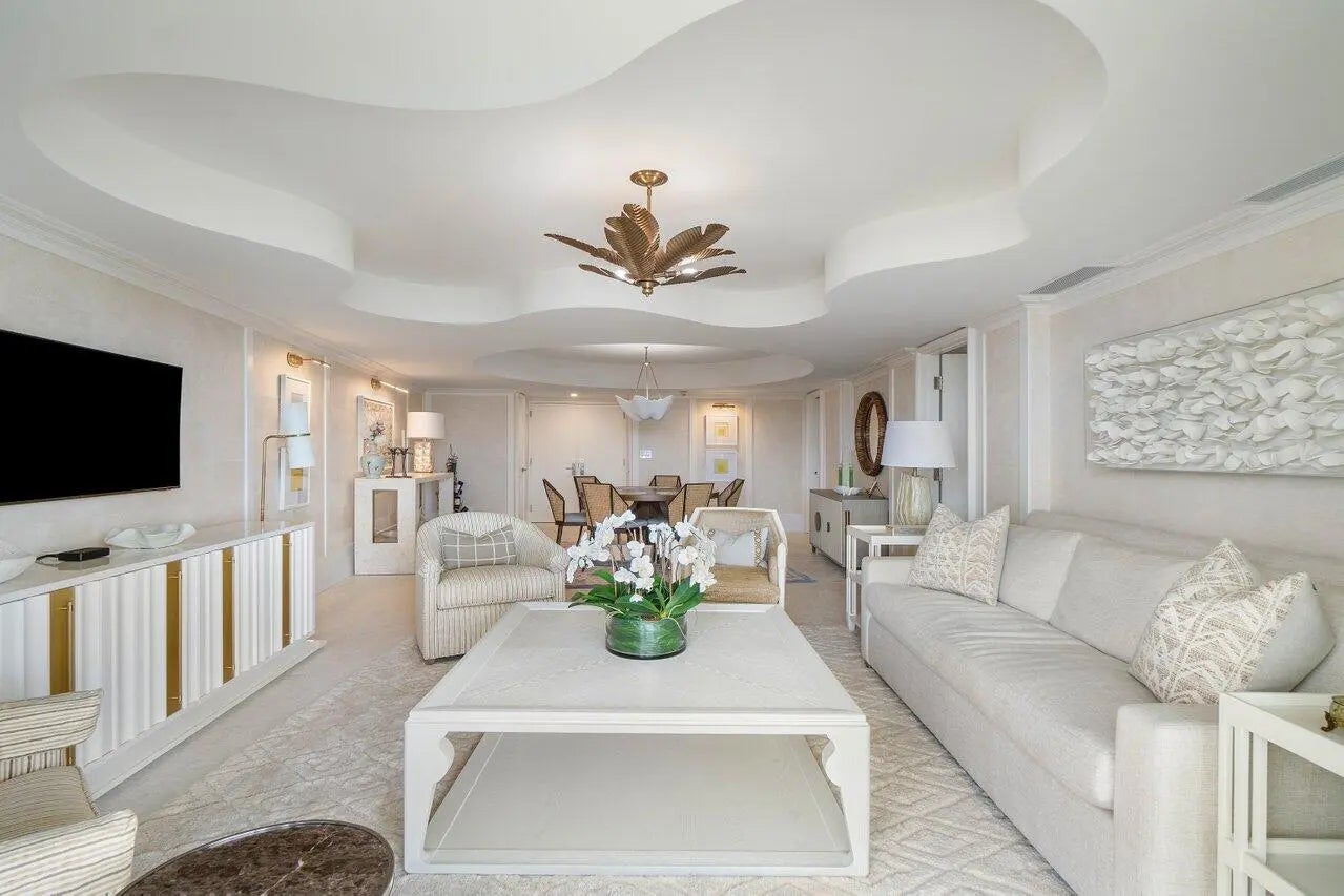 Expertly renovated by award-winning designer James Michael Howard, this high-end, generously proportioned, 1-bedroom, 1.5-bathroom condo sits gracefully on the 6th floor, boasting expansive, breezy panoramic vistas of the city within one of Palm Beach's most sought-after full-service residential buildings, Sun & Surf, making it an ideal choice. The modern interiors showcase exquisite craftsmanship, featuring custom millwork gracing every corner, elegant limestone and white oak floors throughout and linear diffused AC. A herringbone porcelain tile backsplash adds a touch of sophistication to the quartzite kitchen and is equipped with high-end appliances, perfect for culinary enthusiasts. Both bathrooms are adorned with luxurious terrazzo countertops, while the primary bathroom includes dual sinks along with a soaking tub and a separate shower. The impact windows and doors not only provide security but also enhance the sleek design. Offering a prime location and a host of superior resort amenities, residents can enjoy access to a state-of-the-art gym, pool with dedicated attendants, private beach access, convenient valet parking, attentive concierge services, and the added allure of a recently revamped lobby and common areas. Only for the discerning.