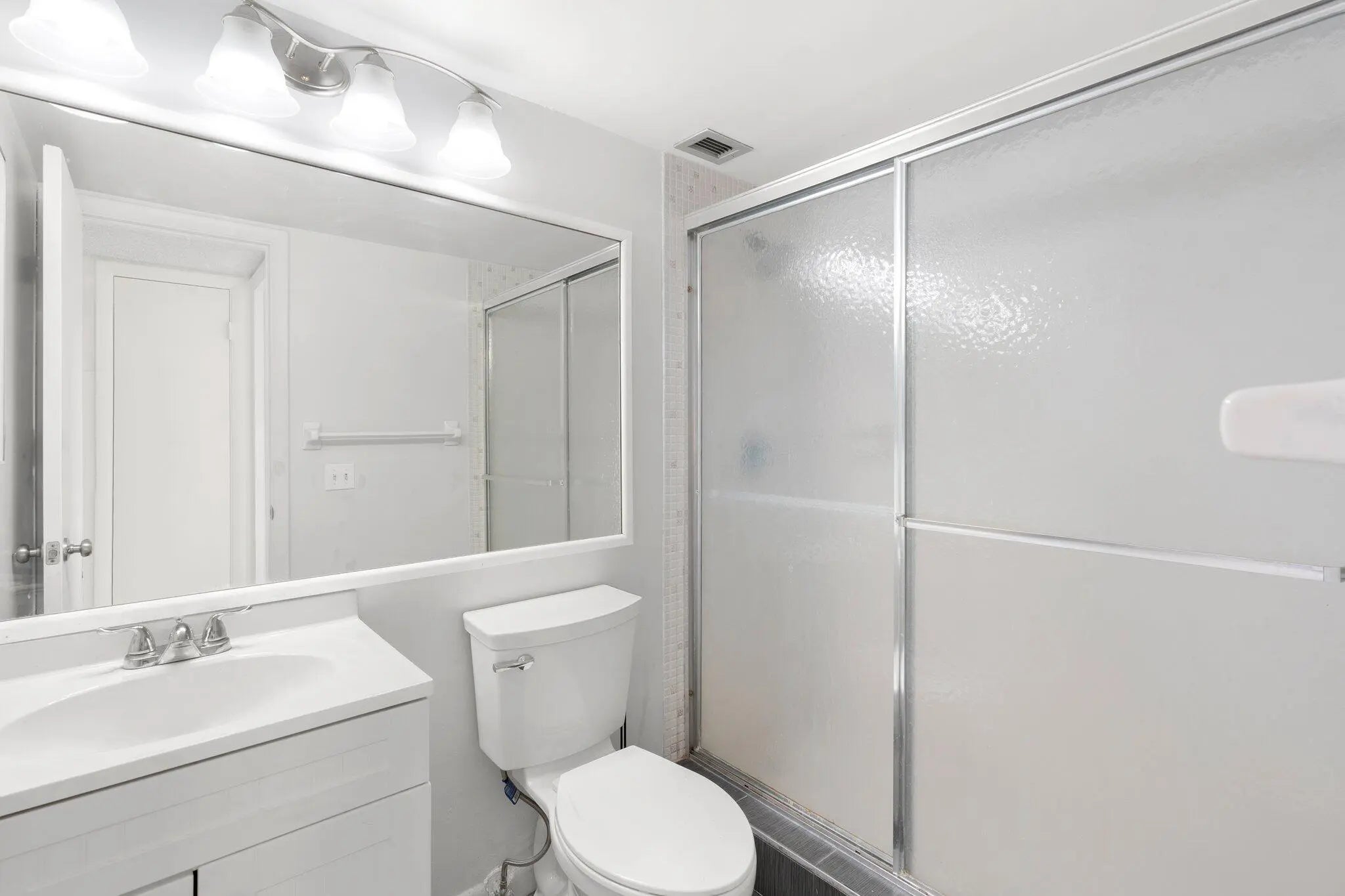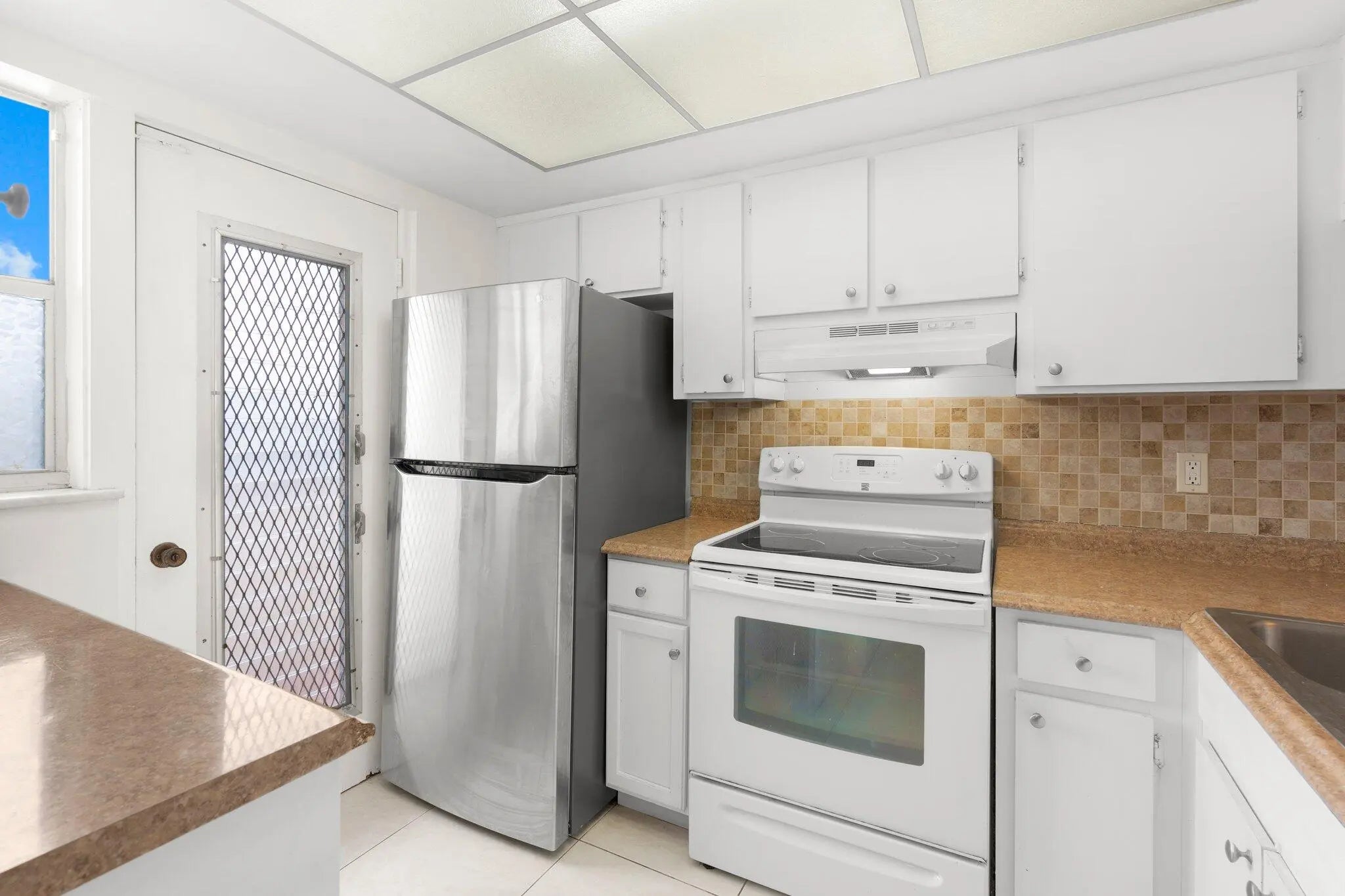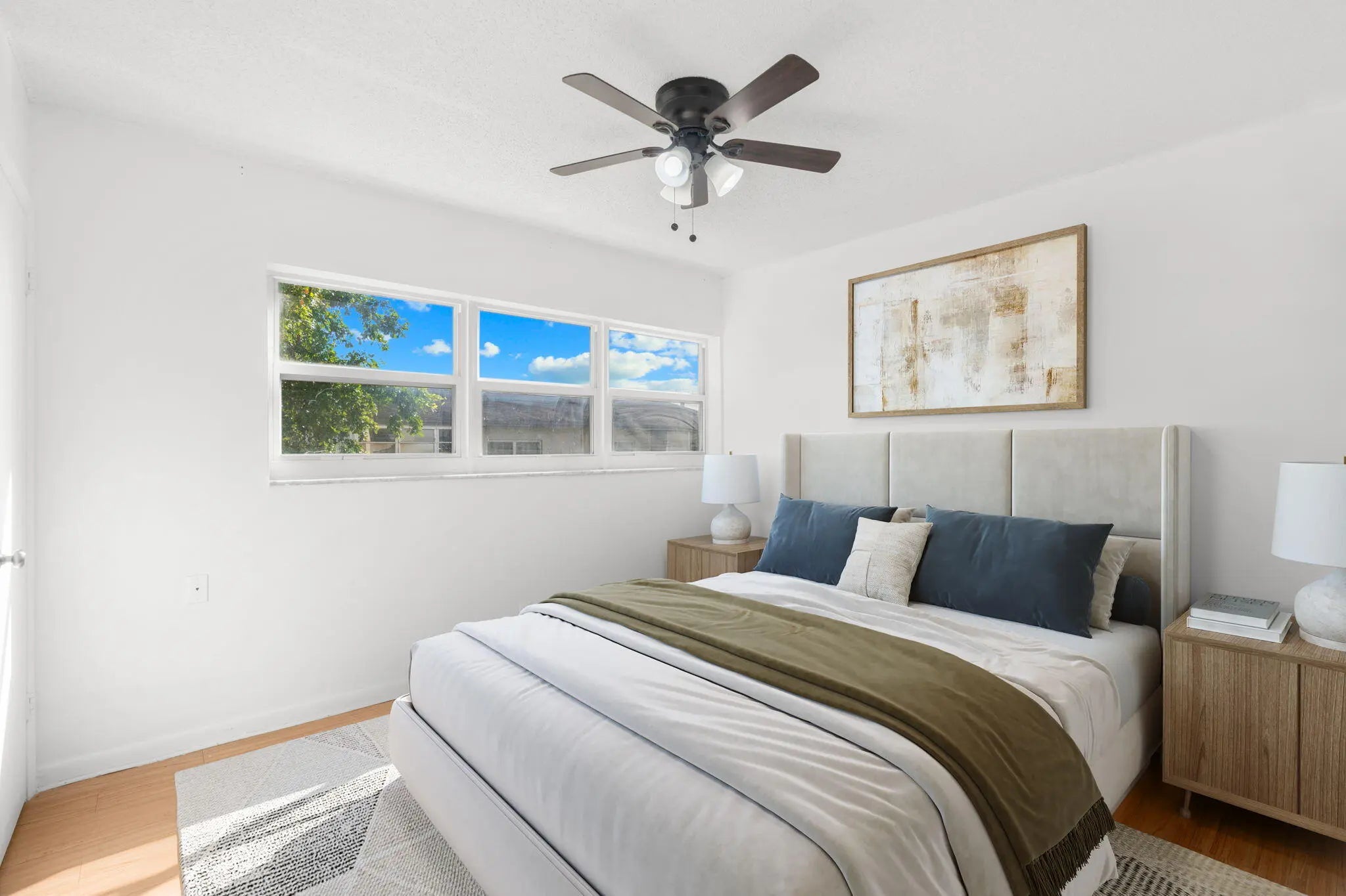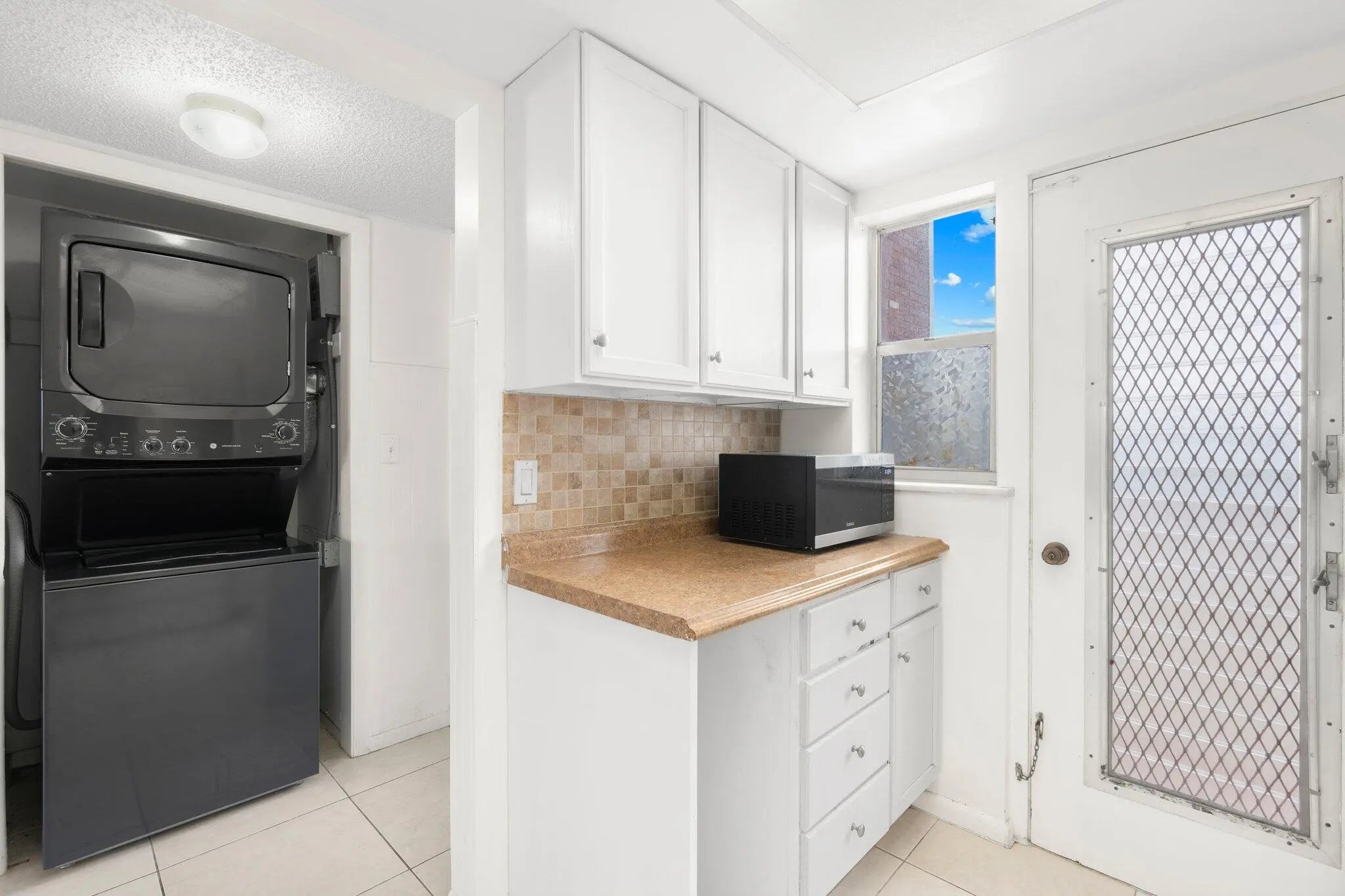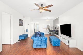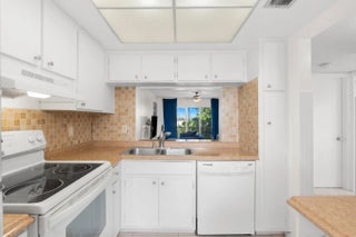 Step into this bright and spacious two-bedroom, two-bathroom corner unit perfectly situated in a welcoming all-ages community. Located on the third floor, this home is filled with natural light and opens onto a screened balcony where you can relax and enjoy calming waterfront views. Inside, you'll find thoughtful upgrades throughout: hurricane-impact windows in both bedrooms, designer light fixtures and ceiling fans, updated bathrooms, and a mix of sleek tile and laminate flooring. The primary suite stands out with its decorative shiplap accent wall, walk-in closet, and private additional storage. A newer AC ensures year-round comfort, and the unit includes a washer and dryer plus one assigned covered parking space. The community adds even more value with a sparkling pool, laundry facilities, and an extra storage locker conveniently located on the same floor. Just minutes from shopping, dining, and major highways, this home combines comfort, style, and convenience. Don't miss your chance to make it yours!