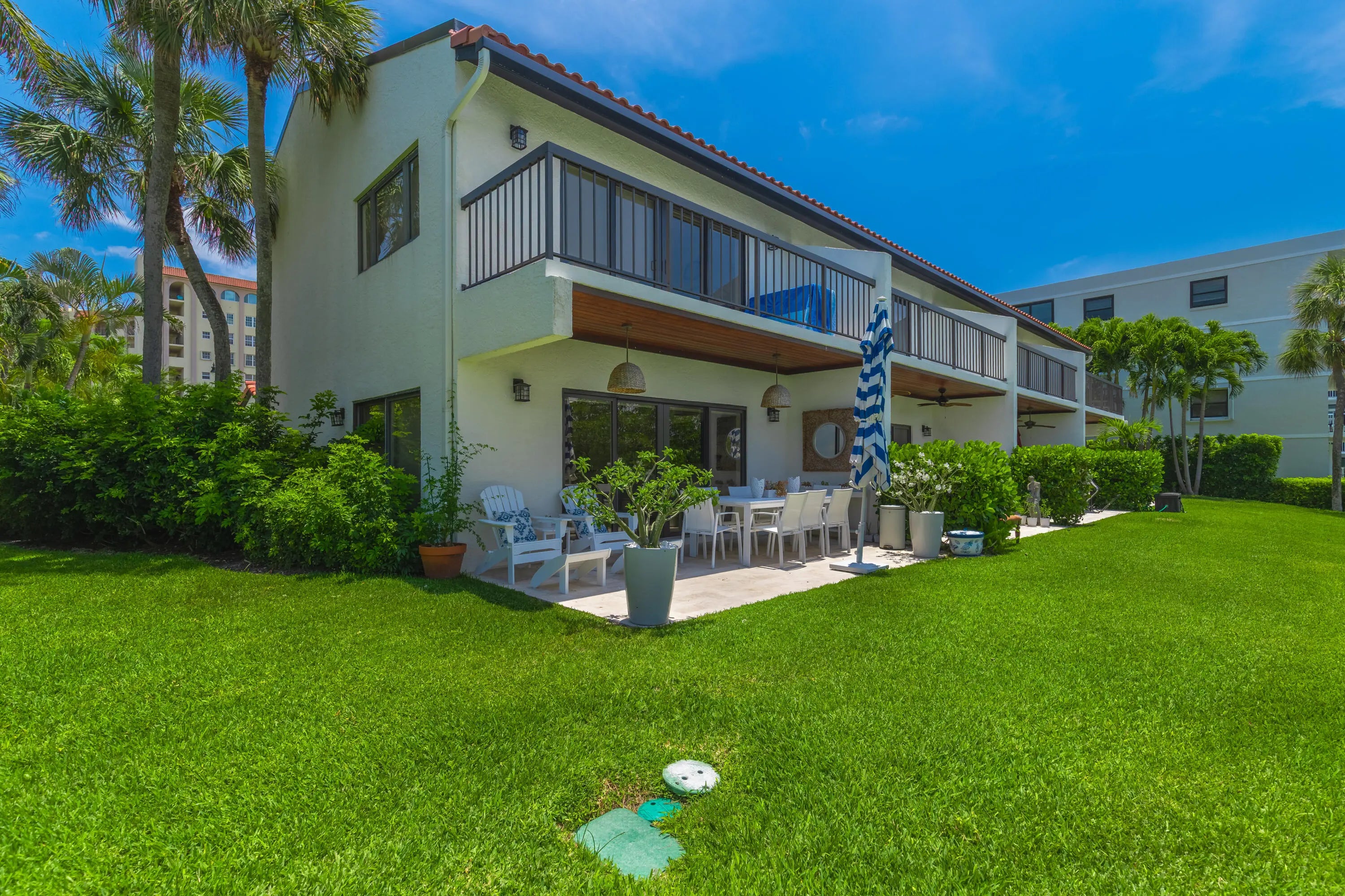 Don't miss out on this exceptional seasonal rental opportunity! Available for a minimum of 4 months, this beautifully furnished and decorated 2-bedroom, 2-bath townhouse is located directly on the Intracoastal and offers the perfect blend of comfort, style, and waterfront living. Step inside to stunning marble floors throughout and a bright, open-concept layout. The brand-new kitchen is a chef's dream—spacious, modern, and seamlessly connected to the living and dining areas, making it ideal for both relaxing and entertaining. Enjoy two private patios, offering plenty of outdoor space to unwind or host guests. The east patio is newly tiled and features stylish outdoor furniture along with a thriving herb garden—perfect for picking fresh ingredients to enhance your meals. Upstairs, the primary suite is a tranquil retreat with a king-size bed, walk-in closet, and even a convenient coffee barso you can enjoy your first cup without going downstairs. Step out onto the private balcony to take in the beautifully manicured lawn and serene Intracoastal views. The guest bedroom includes two twin beds, a walk-in closet, and an adjoining bathroom, making it perfect for visiting family or friends. Additional highlights include a full-size washer and dryer with built-in cabinetry under the stairsoffering both function and style. This is truly one of the finest seasonal rentals available. Secure your stay nowthis opportunity won't last!