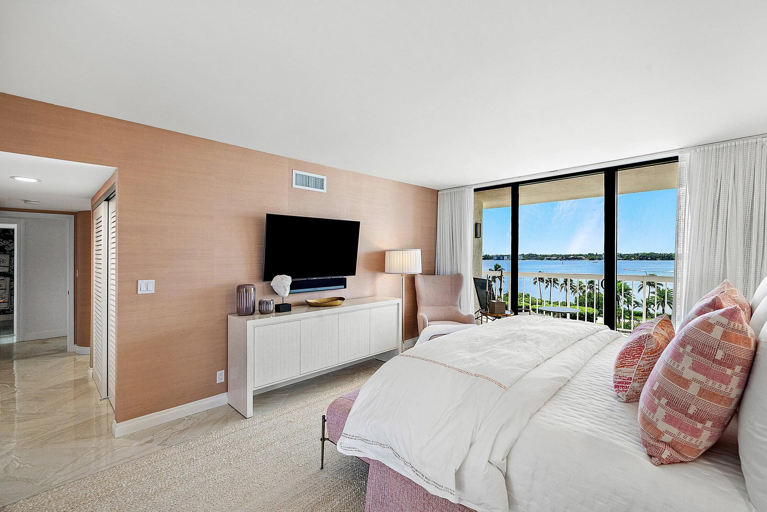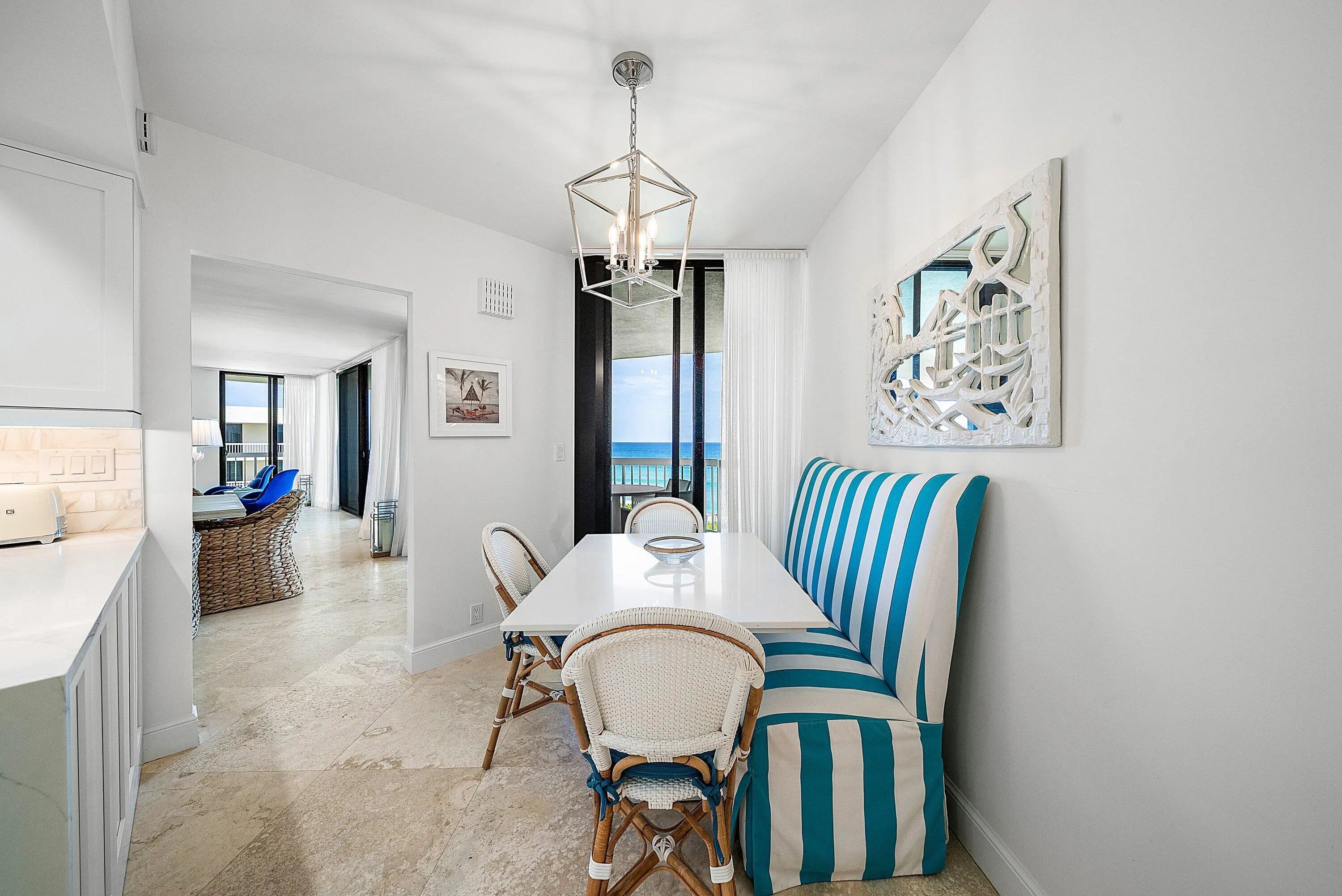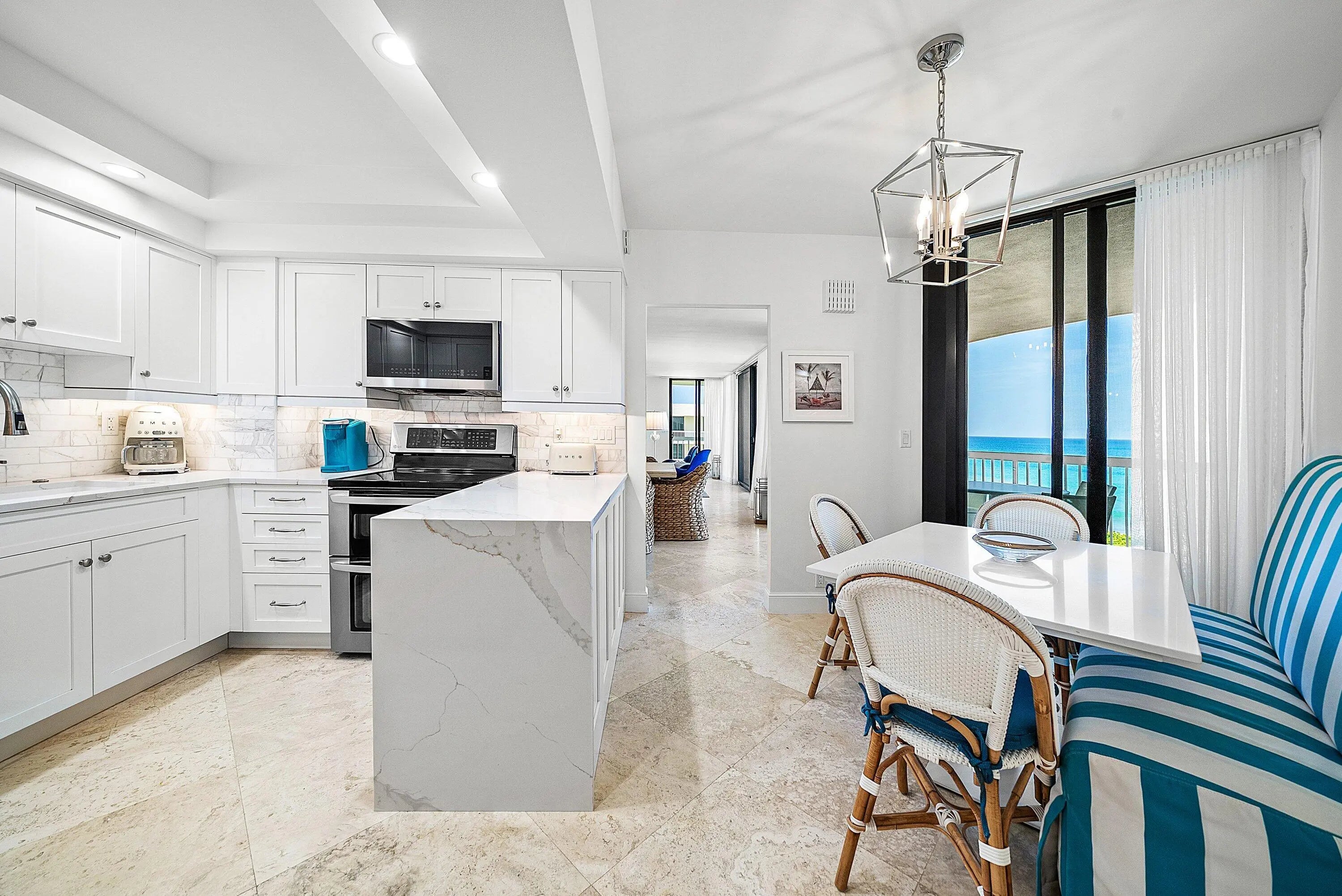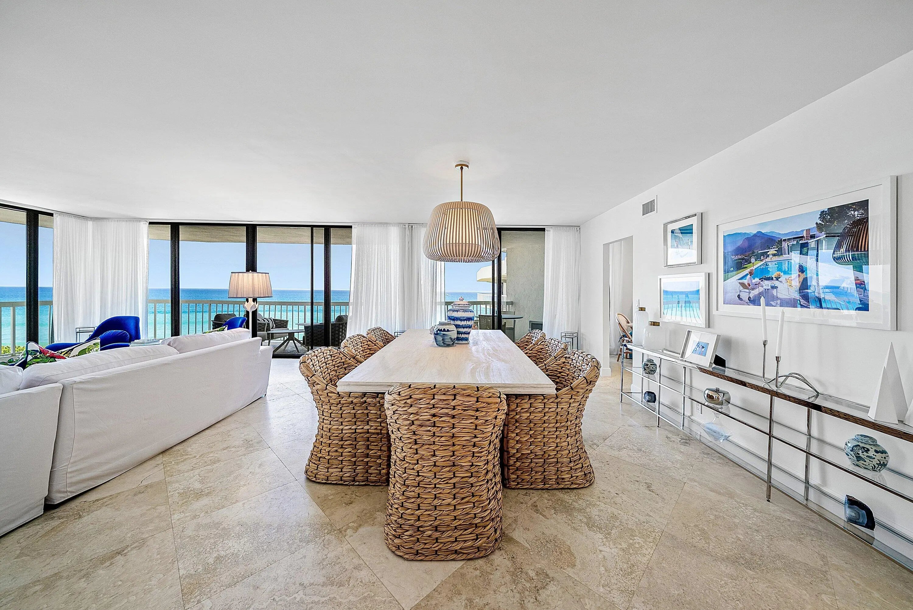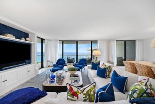 Ocean Front Penthouse with the water views everyone wants! This 3 bedroom, 2.5 bath residence is spacious and gracious & renovated, with 2 balconies that provide east and west exposures offering an abundance of light to showcase the beautiful, colorful interiors furnished by an international interior designer and is offered fully furnished/''turnkey''. The outdoor seating on the balconies offers additional living areas to enjoy the ocean views, breezes and westerly sunsets. The Meridian has completed the Milestone requirements, has a newly renovated pool area and spa on the ocean with a stairway to the beach, Entry gate is manned 24 hours, full time manager, tennis courts, garage parking. Meridian offers the best of luxury living!