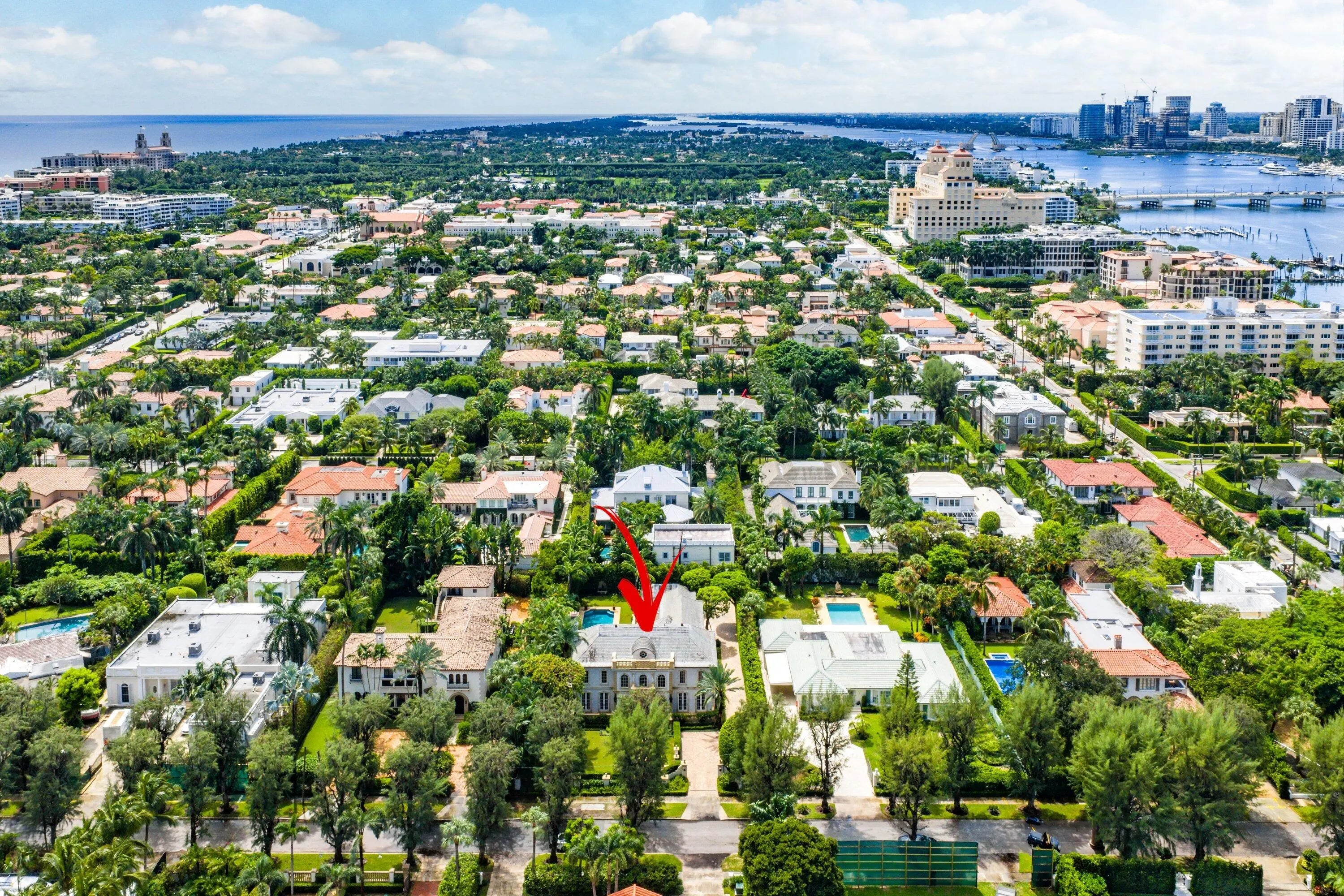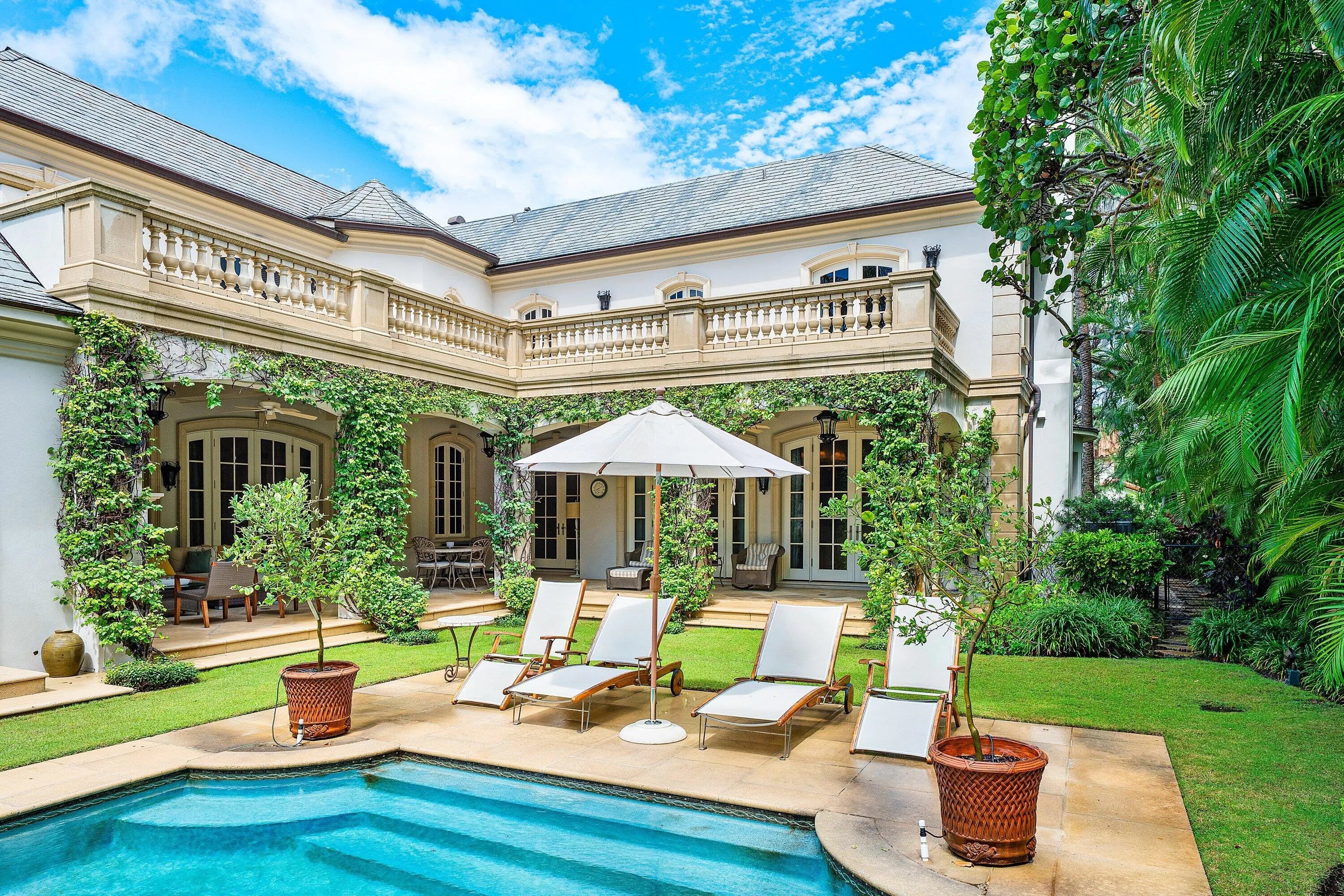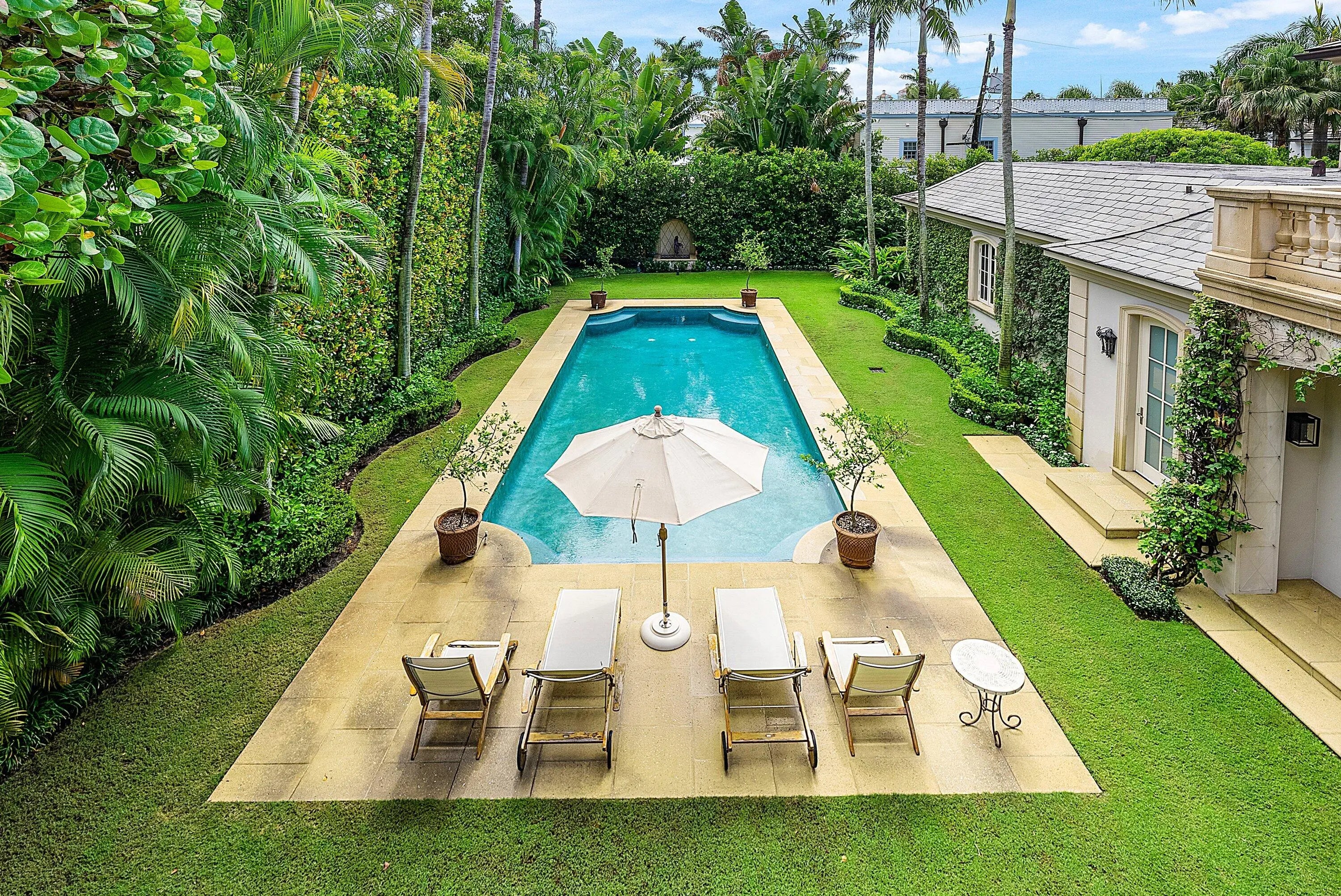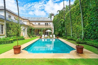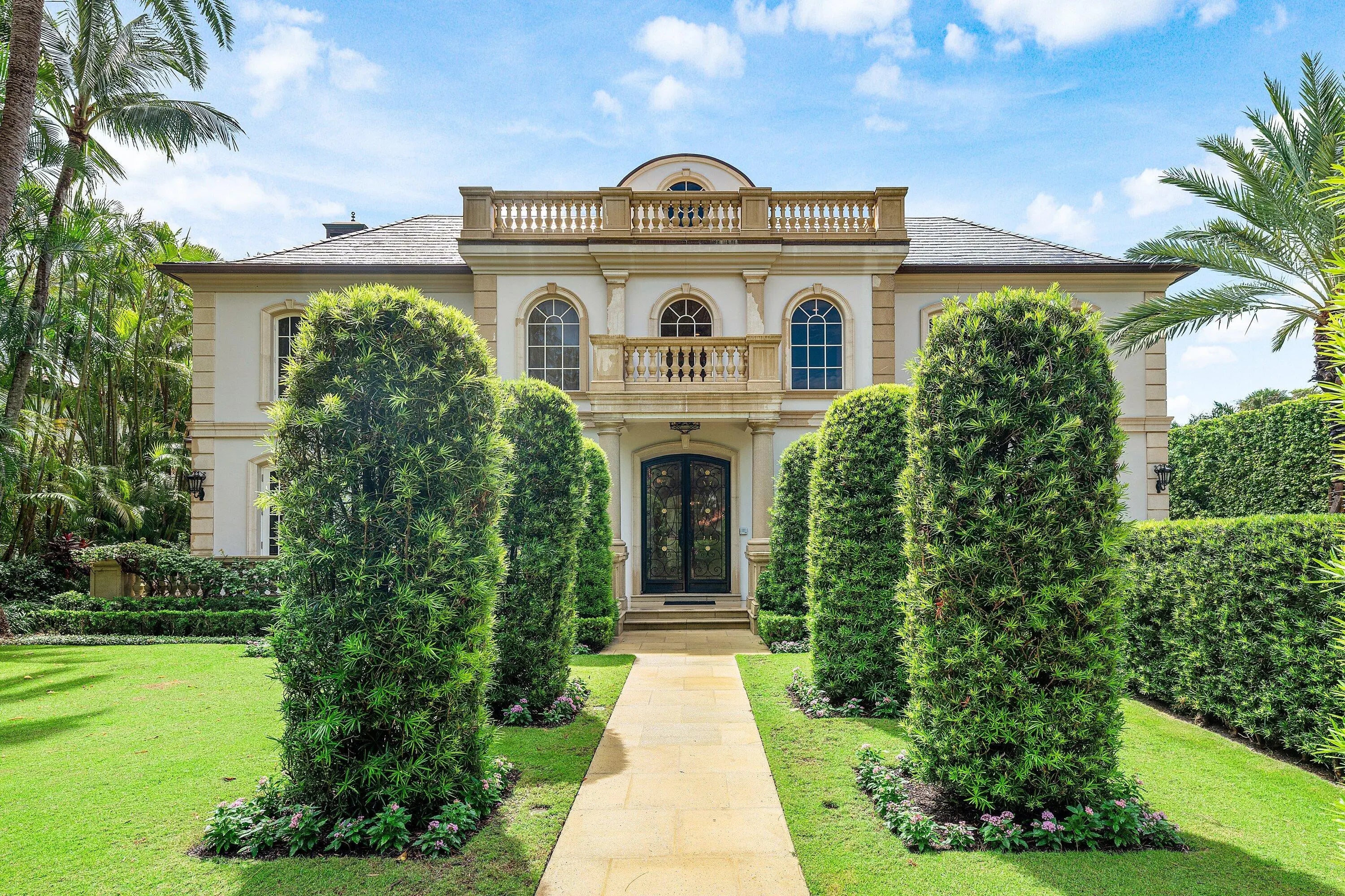 This extraordinary estate at 242 Wells Road combines classic French Provincial architecture with timeless elegance, offering an unparalleled lifestyle on one of Palm Beach's most prestigious streets. This magnificent 7,460 total sq. ft. French Provincial masterpiece is nestled on a sprawling 19,500 sq. ft. lot in the heart of Palm Beach. This stately manor, with its steep-pitched slate roof, symmetrical façade, and stone surrounds, exudes Old World charm and impeccable craftsmanship. The home's architectural grandeur is enhanced by graceful balustrades and meticulously sculptured landscaping, creating a serene and sophisticated retreat. Step inside to find luxurious interiors adorned with gleaming hardwood and marble floors showcasing exceptional attention to detail. A grand staircase, a stunning centerpiece of the foyer, welcomes you with its sweeping elegance, complemented by a private elevator. The residence offers 4 spacious bedrooms, 6 beautifully appointed bathrooms, and one half bath, fully furnished for effortless move-in elegance. The crown jewel is the expansive primary suite, featuring an expansive balcony overlooking the breathtaking pool and lush, professionally curated gardens. This serene retreat includes his-and-hers walk-in closets, separate opulent bathrooms with high-end finishes, and an elegant sitting room, perfect for quiet relaxation or intimate gatherings. A generously appointed guest suite also boasts its own balcony, offering stunning views of the tranquil outdoor oasis. Entertain with unparalleled style in the formal dining room, ideal for grand gatherings, seamlessly connected to a large butler's pantry and wet bar equipped for effortless hosting. The eat-in kitchen, a chef's dream, blends modern functionality with classic design, featuring top-tier appliances and ample space for casual dining. A stately fireplace anchors the formal living room, while a refined library provides an ideal space for work or leisure. Step outside to the large wraparound loggia or the luxurious balconies off the primary and guest suites, all offering captivating views of the expansive pool and gardens. The estate is complete with a 3-car garage with ample storage.
