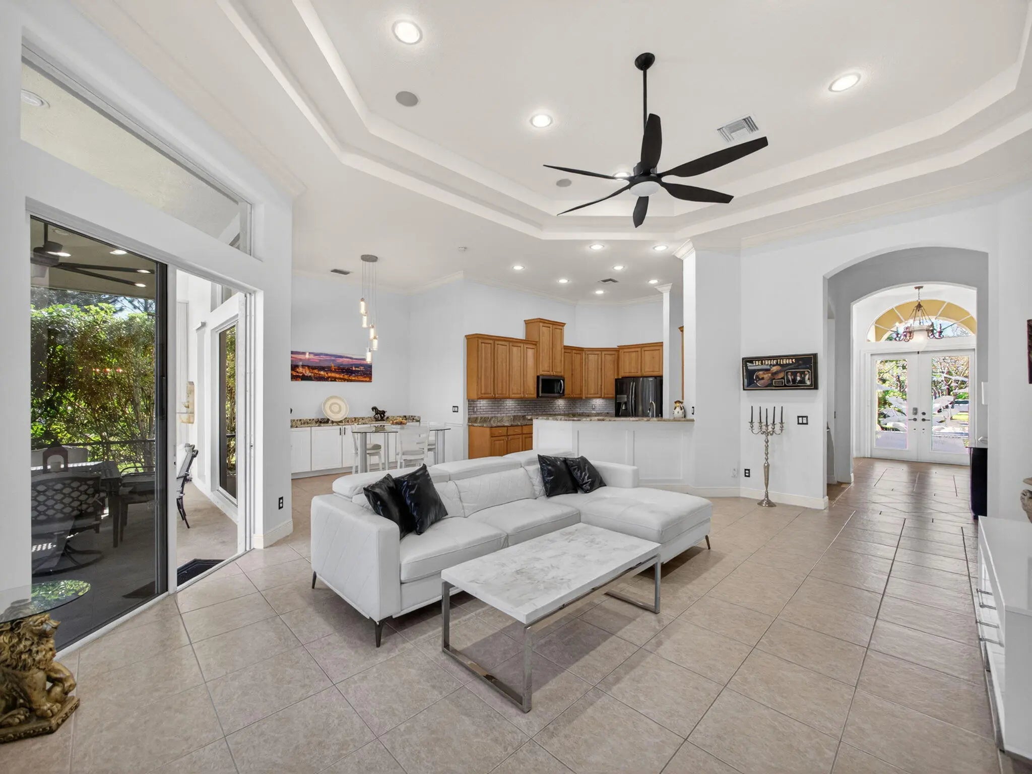 Tucked away on a rarely available, exceptionally private lot at the end of a quiet cul-de-sac near the front of PGA Village, this beautifully maintained 3-bedroom + office, 3.5-bath pool home features a freshly painted interior (2026), a brand-new kitchen backsplash, a new modern chandelier in the dining room, a new master bedroom A/C unit, and a gas-heated pool and jacuzzi. Additional highlights include a saltwater pool system (2024), a new A/C system (2024), a newly painted front door (January 2026), and the longest driveway on the club side, offering parking for up to eight vehicles. Designed for both luxury and flexibility, the home blends thoughtful upgrades, everyday convenience, and exceptional privacy in a truly tranquil setting. The inviting kitchen showcases granite countertops, stainless steel appliances, and a sunlit breakfast area that opens seamlessly to the expansive great room ideal for both casual living and entertaining. The elegant formal dining room makes a striking impression and can easily be converted into a home office or additional bedroom to suit your needs. A custom designer bar adds the perfect touch for hosting memorable gatherings. Timeless architectural details, including crown molding, picture-frame molding, and wainscoting, add refined character throughout the home. Each bedroom features its own private ensuite bath, providing superior comfort and privacy for guests. Step outside to your private backyard oasis and enjoy the peaceful surroundings of this expansive lot with minimal neighboring exposure a rare find offering exceptional seclusion. Despite its serene setting, the home is just minutes from championship golf courses, resort-style amenities, top-rated dining, shopping, entertainment, the vibrant Tradition area, and everyday local conveniences.