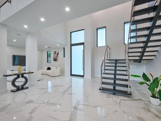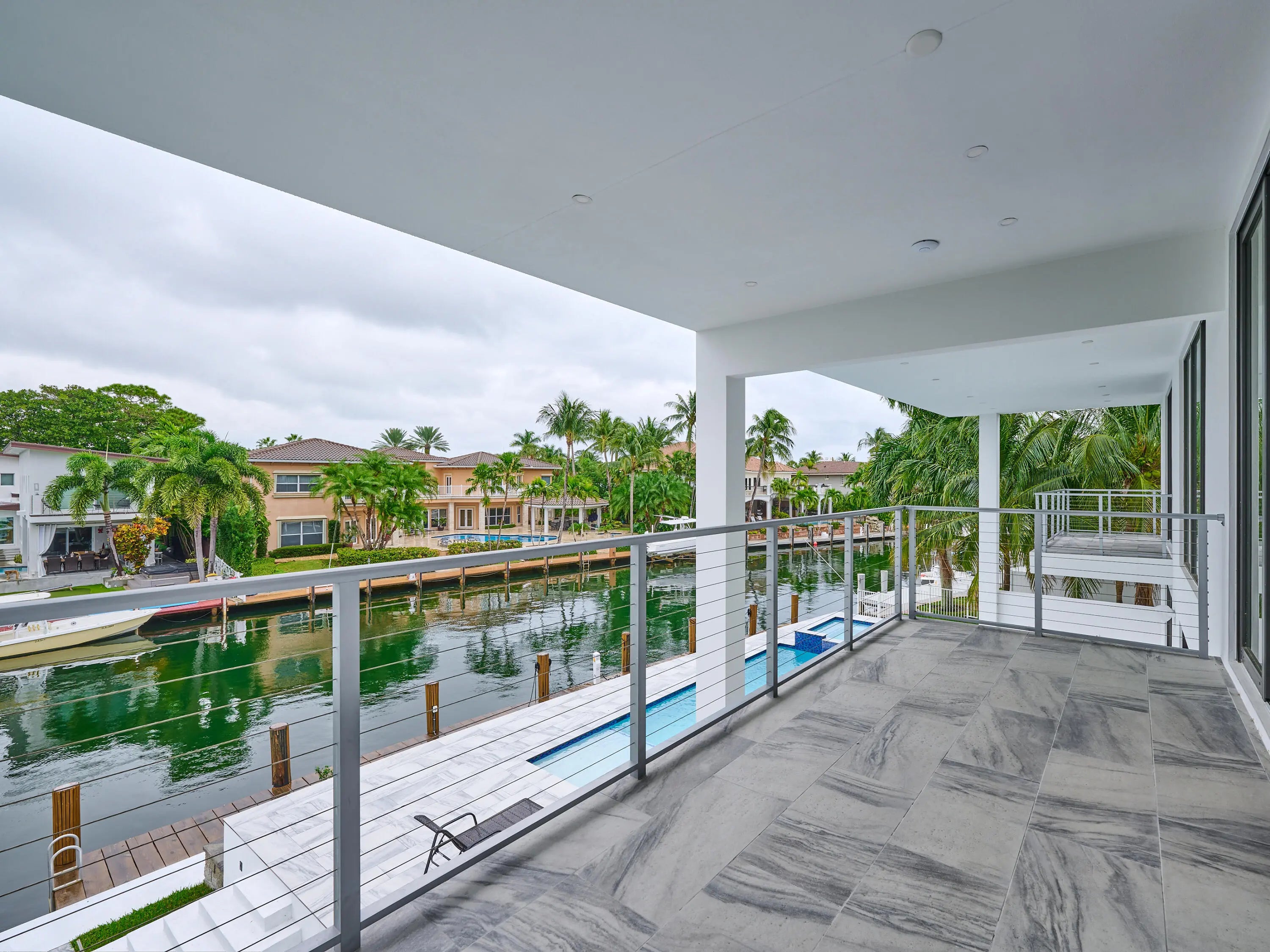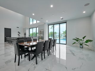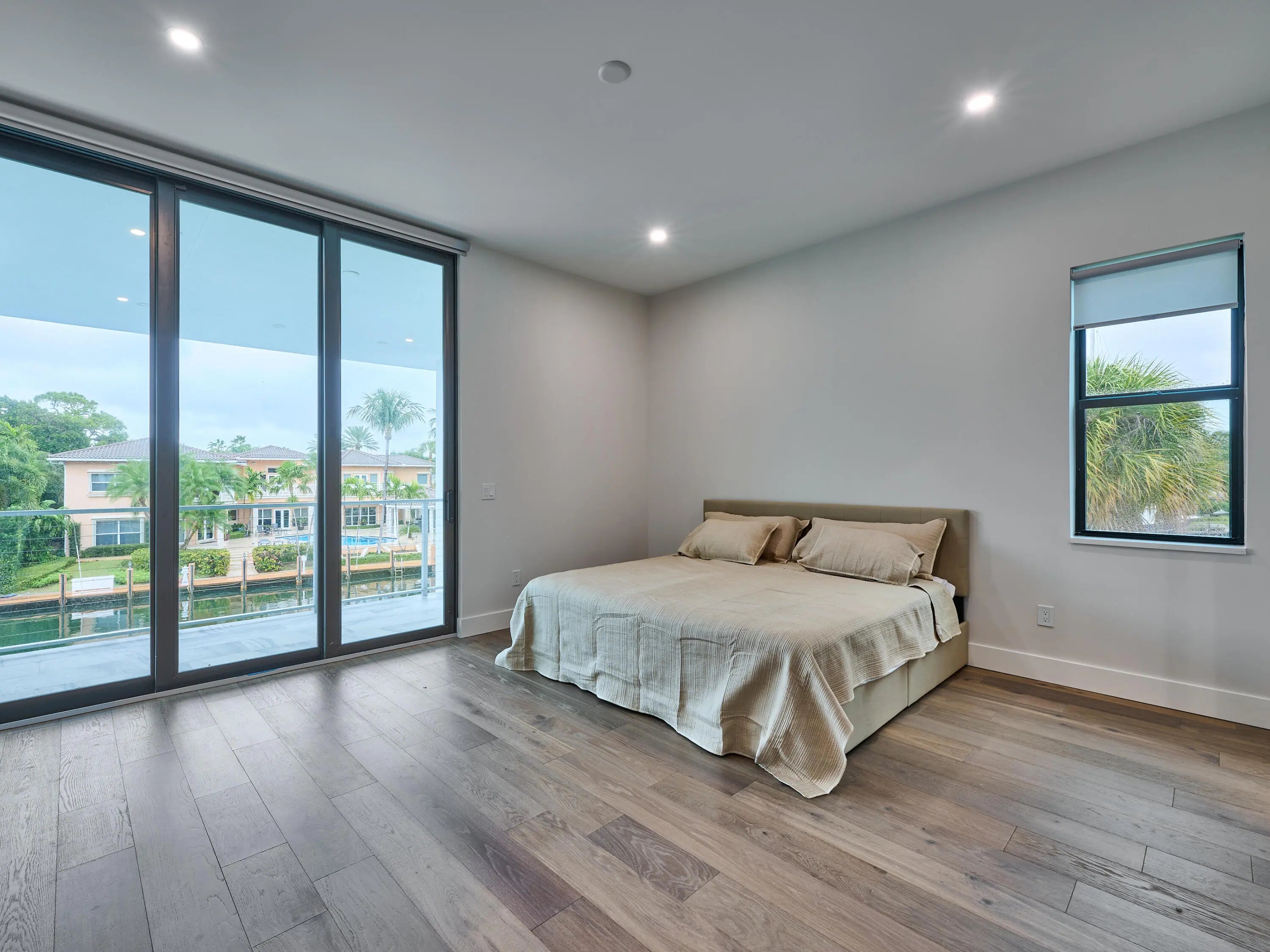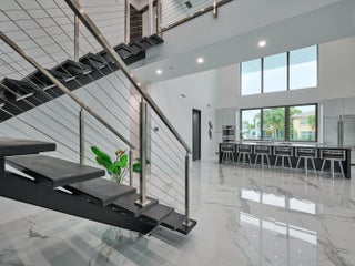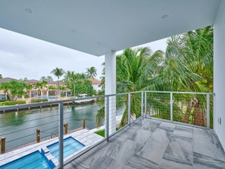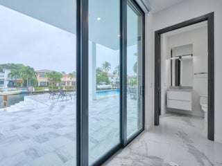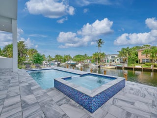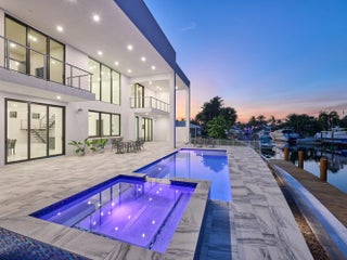 This exquisite, just-completed 2025 modern waterfront masterpiece offers turnkey coastal luxury in the heart of South Florida. Spanning approximately 4,500 square feet over two sunlit levels, the home delivers breathtaking ocean-access water views from nearly every room, seamlessly integrating indoor and outdoor spaces for a private resort-like experience. Soaring ceilings, expansive floor-to-ceiling impact-resistant glass, and automated motorized shades flood the interiors with abundant natural light. The gourmet chef's kitchen serves as the home's centerpiece, boasting an oversized double-slab black island, top-tier professional appliances, a gas cooktop, and elegant design perfect for intimate meals or large-scale entertaining. Upstairs, warm hardwood flooring leads to the luxurious primary suite, complete with a private sitting area, spa-like bathroom featuring dual sinks, dual showers, a lavish free-standing tub, and a sophisticated bidet; an expansive walk-in closet; and a covered balcony overlooking the canal. All generously sized bedrooms feature en-suite bathrooms and walk-in closets, with two opening onto private balconies showcasing wide-water views. On the main floor, enjoy a convenient cabana bath ideal for pool guests and a stylish powder room. The additional bedrooms each include private full baths with built-in tubs. A dedicated mudroom comes fully equipped with washer, dryer, utility sink, and ample cabinetry, offering excellent organization and the potential for conversion into maid's or nanny's quarters. Transition effortlessly to expansive covered terraces with pre-plumbed space for a summer kitchen, alongside a stunning infinity-edge pool and spa that blend harmoniously with the horizon. Boating enthusiasts will appreciate the brand-new elevated 80-foot deepwater dock, complete with full electric service and no fixed bridges, providing direct Intracoastal and open-ocean access. The crowning jewel, a spacious rooftop terrace, roughed-in and ready for customization promises unparalleled 360-degree views and an idyllic setting for unforgettable sunset soirées. This home is engineered for ultimate reliability and convenience, featuring a whole-house backup gas-powered generator, sustainable solar panels, and a premium Sonos sound system throughout the interior and pool area. Smart home integration places control at your fingertips via smartphone, managing the pool, spa, lighting, climate, and more. Comprehensive security is ensured with a full camera system surrounding the property. Uncompromising in quality and design, this residence defines the pinnacle of contemporary South Florida waterfront living and is ready for immediate enjoyment.