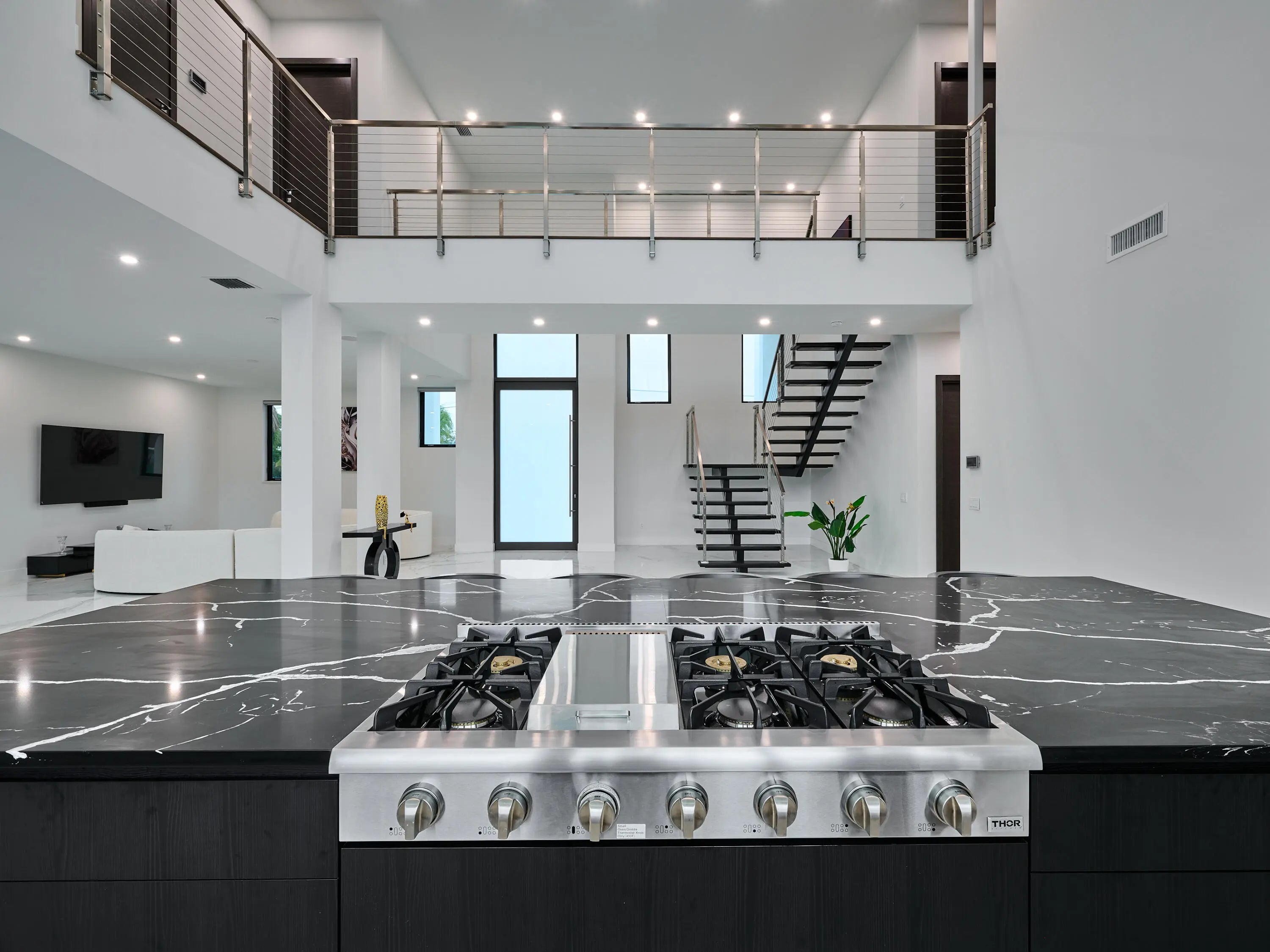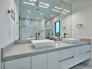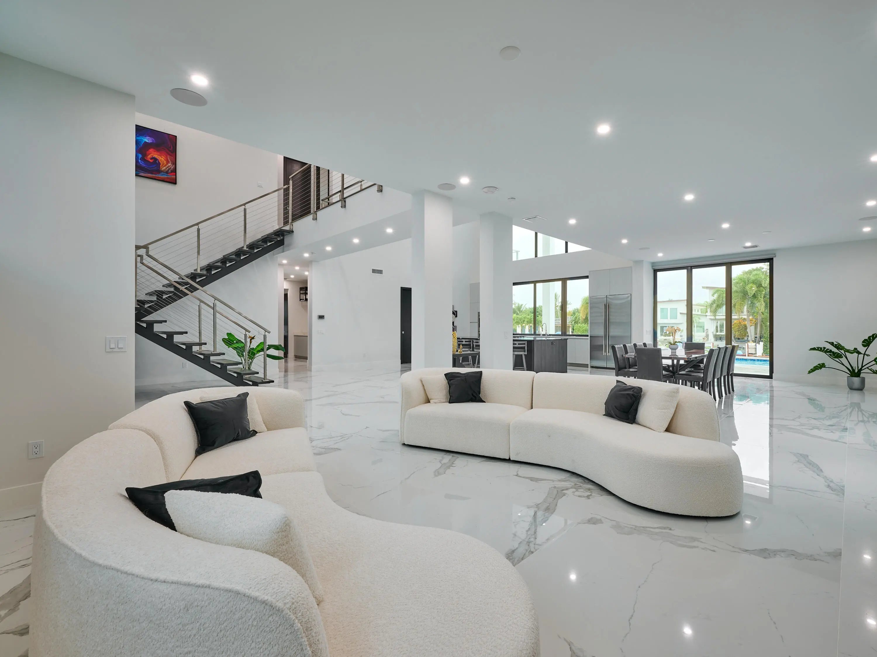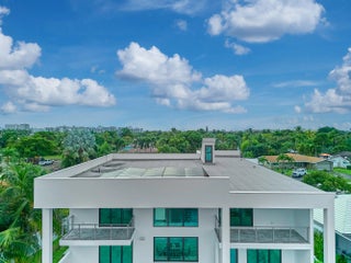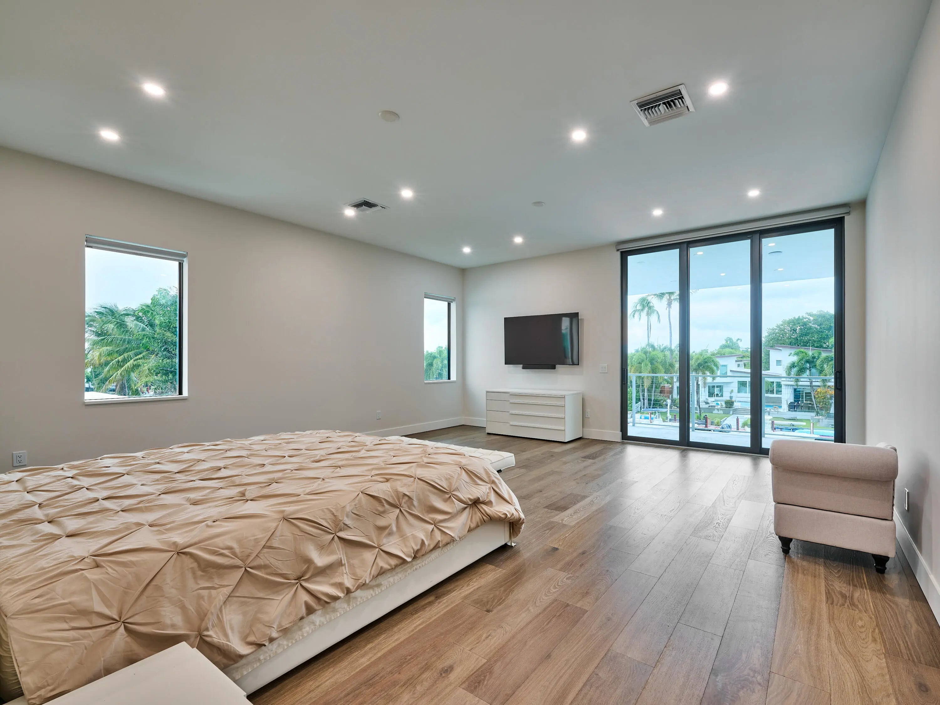 This exquisite, just-completed 2025 modern waterfront masterpiece offers turnkey coastal luxury in the heart of South Florida. Spanning approximately 4,500 square feet over two sunlit levels, the home delivers breathtaking ocean-access water views from nearly every room, seamlessly integrating indoor and outdoor spaces for a private resort-like experience. Soaring ceilings, expansive floor-to-ceiling impact-resistant glass, and automated motorized shades flood the interiors with abundant natural light. The gourmet chef's kitchen serves as the home's centerpiece, boasting an oversized double-slab black island, top-tier professional appliances, a gas cooktop, and elegant design perfect for intimate meals or large-scale entertaining. Upstairs, warm hardwood flooring leads to the luxurious primary suite, complete with a private sitting area, spa-like bathroom featuring dual sinks, dual showers, a lavish free-standing tub, and a sophisticated bidet; an expansive walk-in closet; and a covered balcony overlooking the canal. All generously sized bedrooms feature en-suite bathrooms and walk-in closets, with two opening onto private balconies showcasing wide-water views. On the main floor, enjoy a convenient cabana bath ideal for pool guests and a stylish powder room. The additional bedrooms each include private full baths with built-in tubs. A dedicated mudroom comes fully equipped with washer, dryer, utility sink, and ample cabinetry, offering excellent organization and the potential for conversion into maid's or nanny's quarters. Transition effortlessly to expansive covered terraces with pre-plumbed space for a summer kitchen, alongside a stunning infinity-edge pool and spa that blend harmoniously with the horizon. Boating enthusiasts will appreciate the brand-new elevated 80-foot deepwater dock, complete with full electric service and no fixed bridges, providing direct Intracoastal and open-ocean access. The crowning jewel, a spacious rooftop terrace, roughed-in and ready for customization promises unparalleled 360-degree views and an idyllic setting for unforgettable sunset soirées. This home is engineered for ultimate reliability and convenience, featuring a whole-house backup gas-powered generator, sustainable solar panels, and a premium Sonos sound system throughout the interior and pool area. Smart home integration places control at your fingertips via smartphone, managing the pool, spa, lighting, climate, and more. Comprehensive security is ensured with a full camera system surrounding the property. Uncompromising in quality and design, this residence defines the pinnacle of contemporary South Florida waterfront living and is ready for immediate enjoyment.