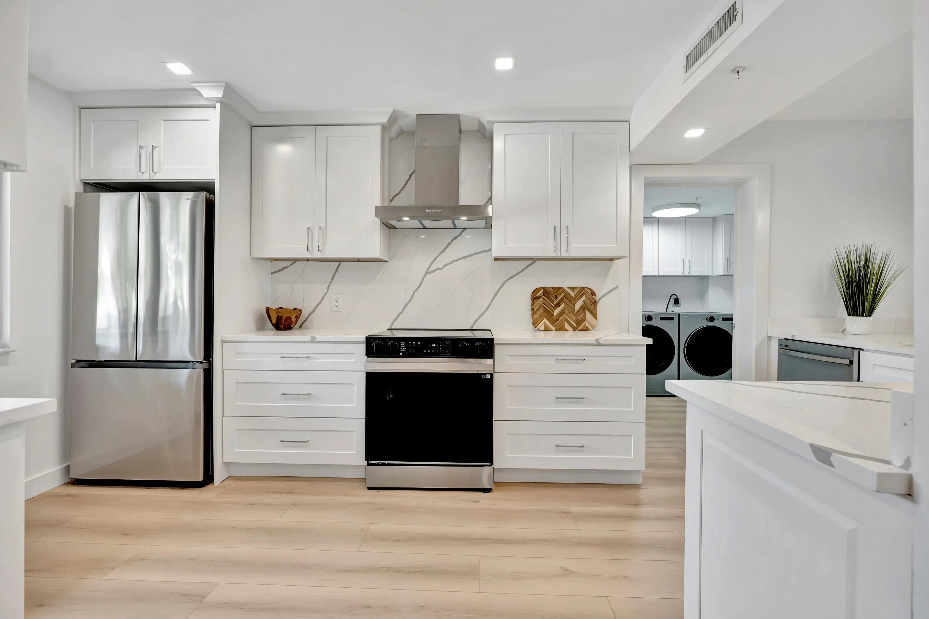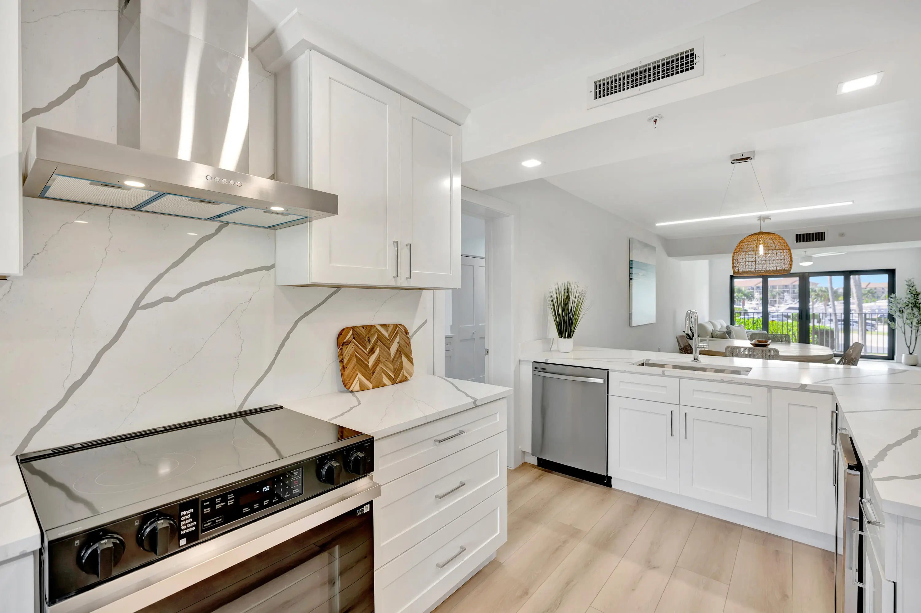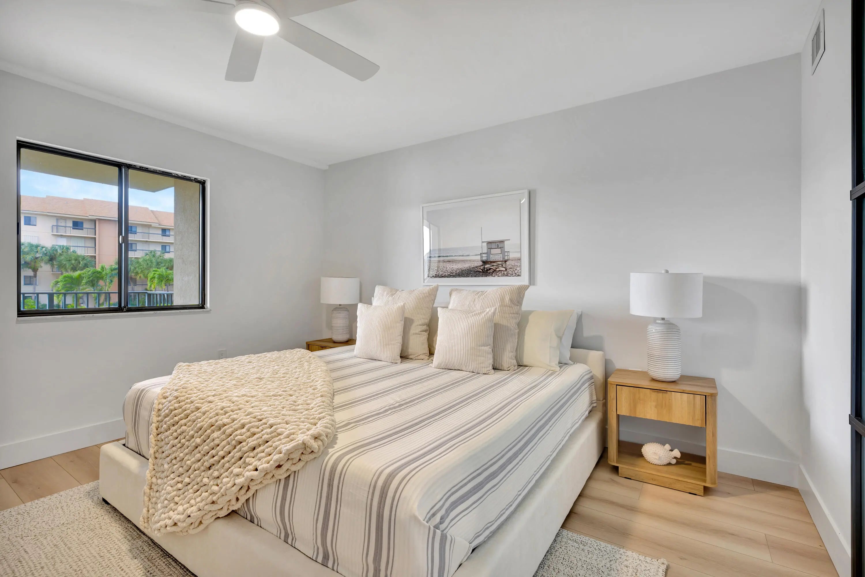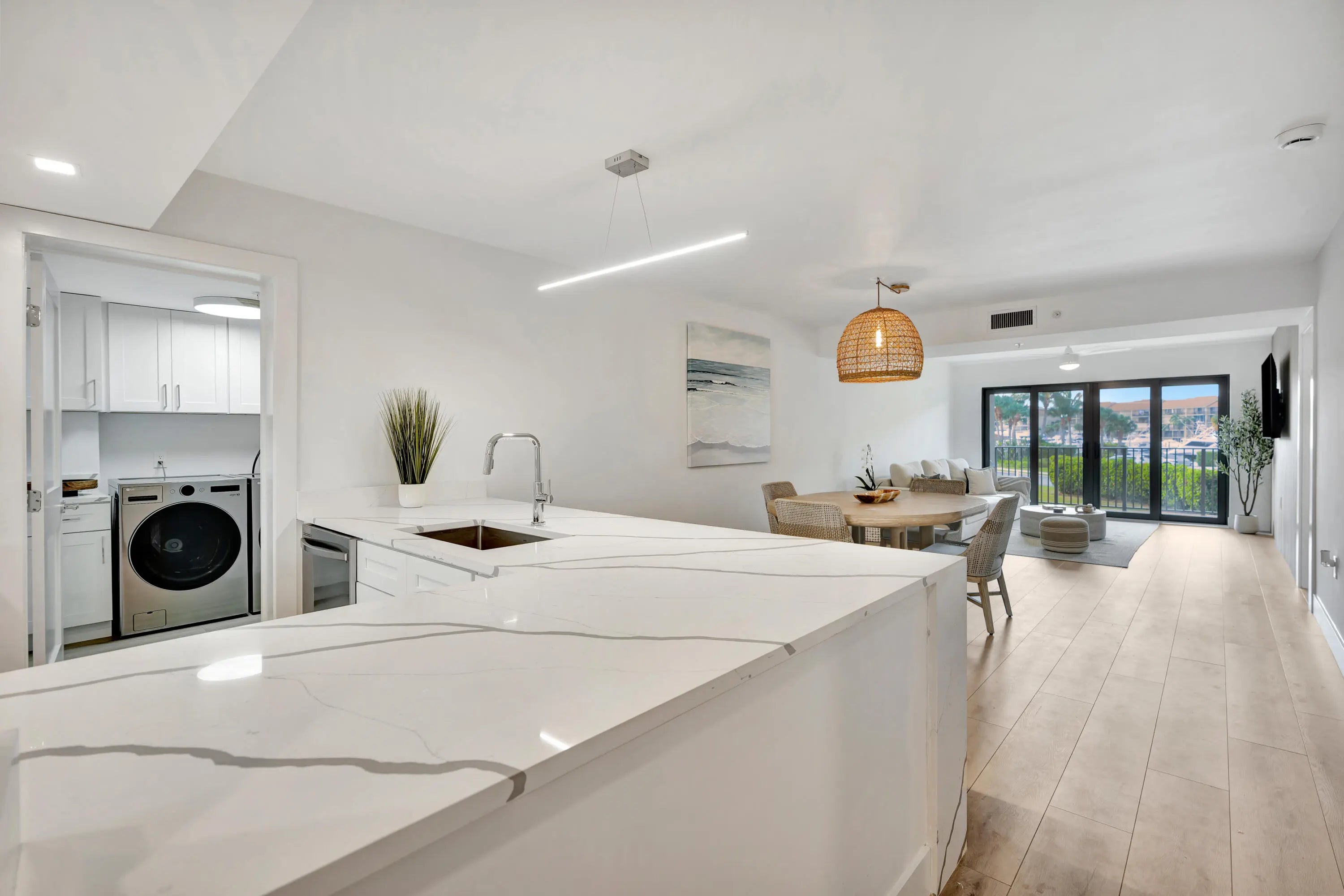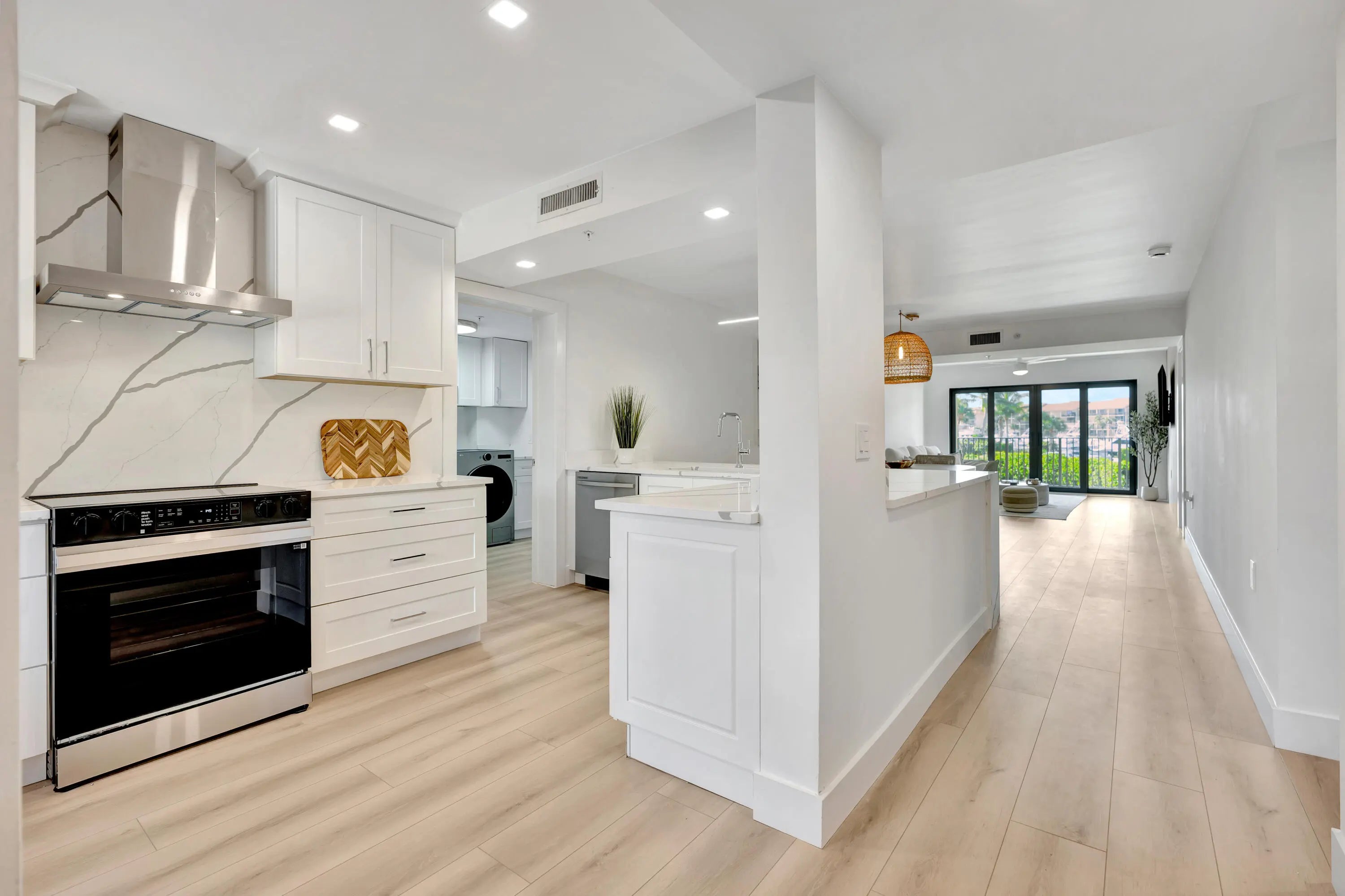 Marina Bluffs is Florida living at its best. Walk to beaches, parks and shopping. With 4 pools, tennis, pickleball & bocce courts enjoy a sun filled day of activity without leaving home. This unit was completely renovated top to bottom in 2025. The kitchen features stainless appliances including a built-in wine fridge, custom wood cabinetry, high end quartz counters with matching backsplash. and a ventless exhaust hood. Kitchen has also been extended from original layout. and includes breakfast bar with seating for 4. Entire unit has been refinished with luxury White Oak vinyl flooring. Bathrooms have been luxuriously modernized with Italian porcelain tile, frameless shower doors, floating vanities, high efficiency fixtures and LED mirrors. Impact sliders to the balcony & panoramic views Both bathrooms are also equipped with bluetooth enabled speakers built into the exhaust fans. New 2025 A/C, Nest Thermostat and All New Electric Panel finish off this highly detailed oriented renovation. Laundry room/storage closet is large enough to be used as a guest room or home office. Brand new ventless washer and dryer, quartz counters and cabinetry matching the kitchen. This is a true turnkey unit waiting for its new owners to come and enjoy this lifestyle. Roofs were completely redone in 2022 and elevators were upgraded in 2024. All assessments have been paid in full and new owners shouldn't be in for any surprises anytime in the near future. Just half a mile to the beach and Juno Beach fishing pier, as well as the convenience of a Publix shopping center right on the corner with Walgreens, TOO Jays, and other restaurants and cafes. Just a short drive from Love St, a collection of waterfront restaurants and nightlife directly across from the Jupiter Lighthouse. Conveniently located 10 minutes from I95 and less than 25 minutes to Palm Beach International Airport in West Palm Beach. Jupiter has become the center of the golfing world in recent years as many PGA tour pros call it home and its surrounded by World Class golf courses and country clubs. For the fishing enthusiast Jupiter boasts some of the best fishing in the country due to the deep waters only miles offshore. Many charters and fishing tours are located at any of the many Marinas that can be found throughout Jupiter.