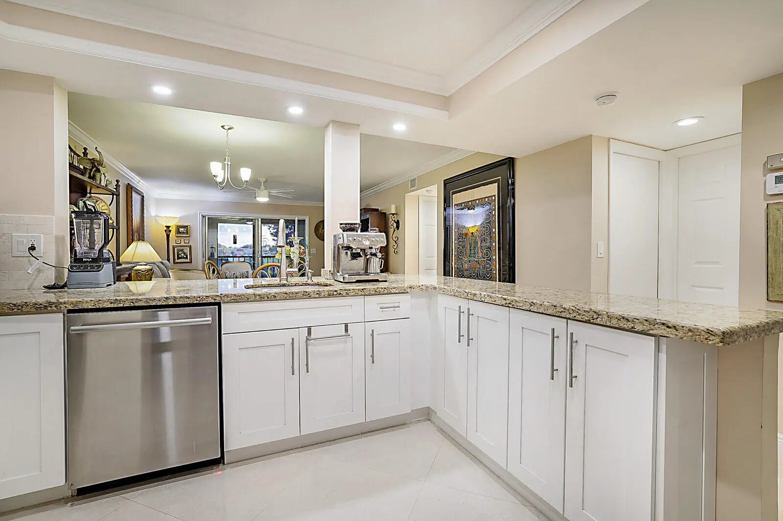 MOVE IN READY!! Beautiful 2-bedroom, 2-bath condo with tile flooring throughout, crown molding, recessed lighting, an open concept kitchen, stainless steel appliances, white shaker cabinets and granite countertops. Bathrooms are tastefully updated along with primary closet provides custom built shelving to add for more organization. This condo is move in ready. The pool is right out back from the building, and the clubhouse is 2 minutes away. Huntington Lakes is a sought-after community located next to shopping, entertainment, dining and 15 minutes from the beach.