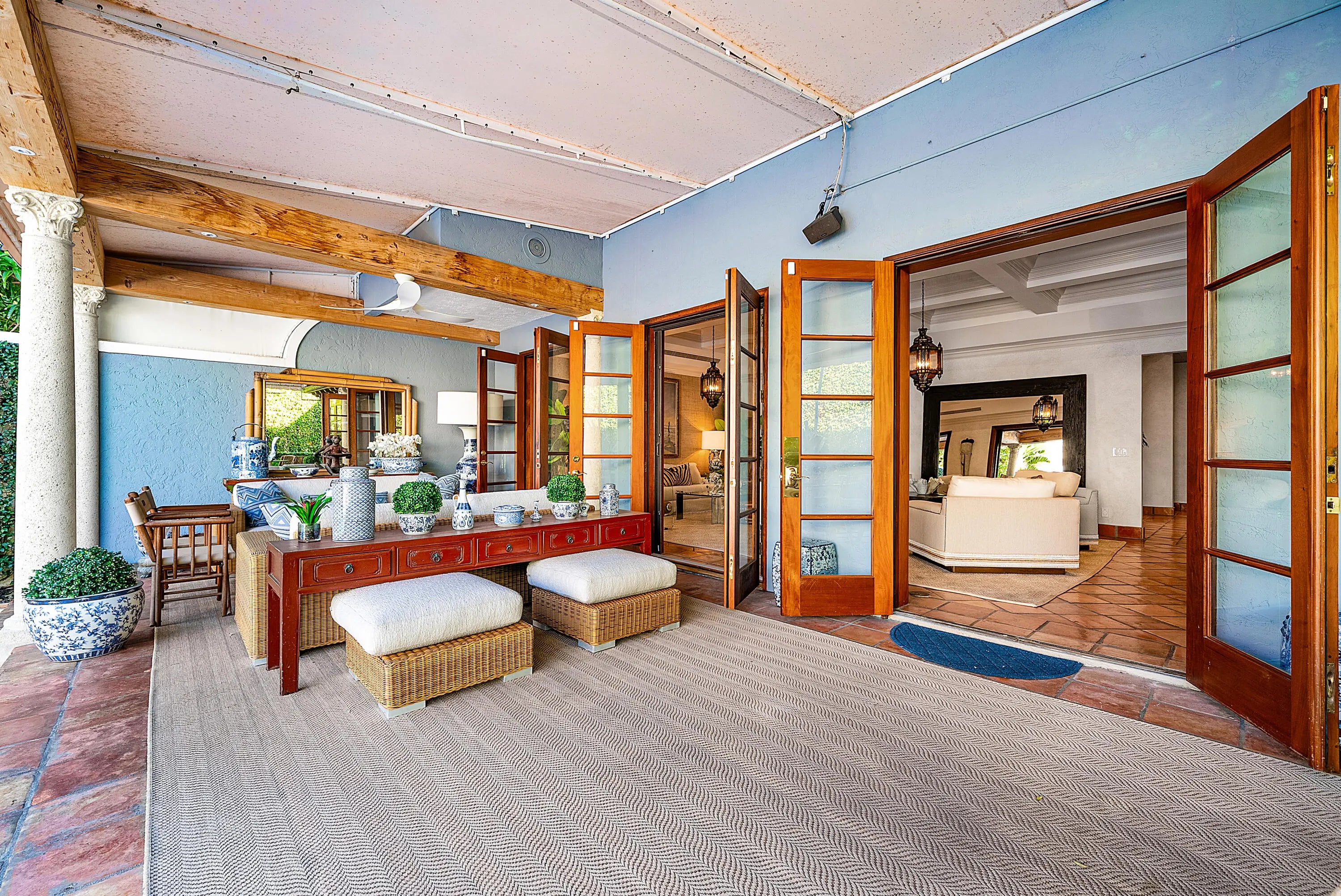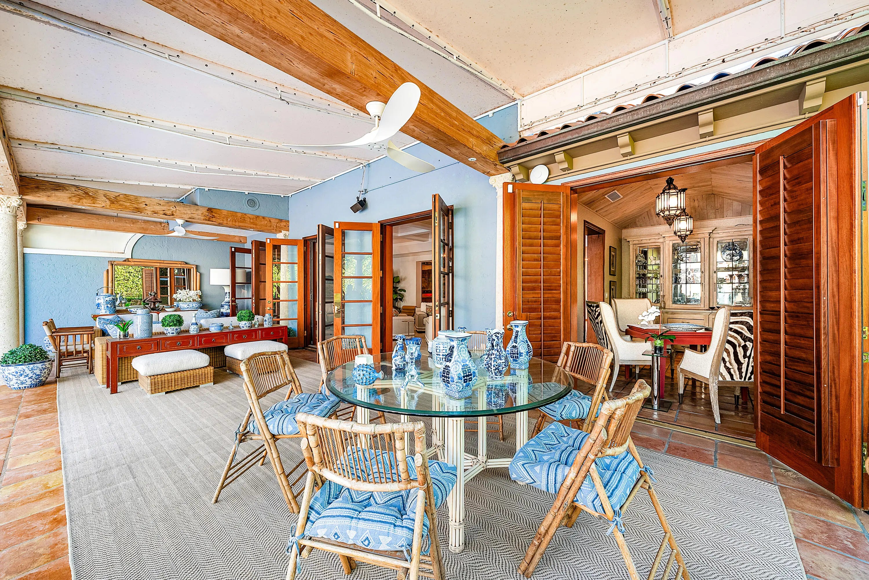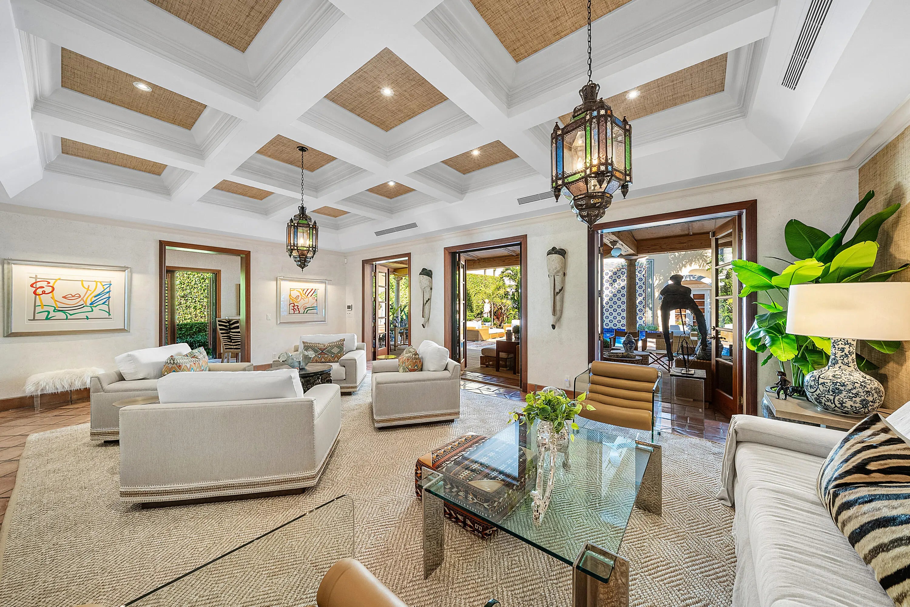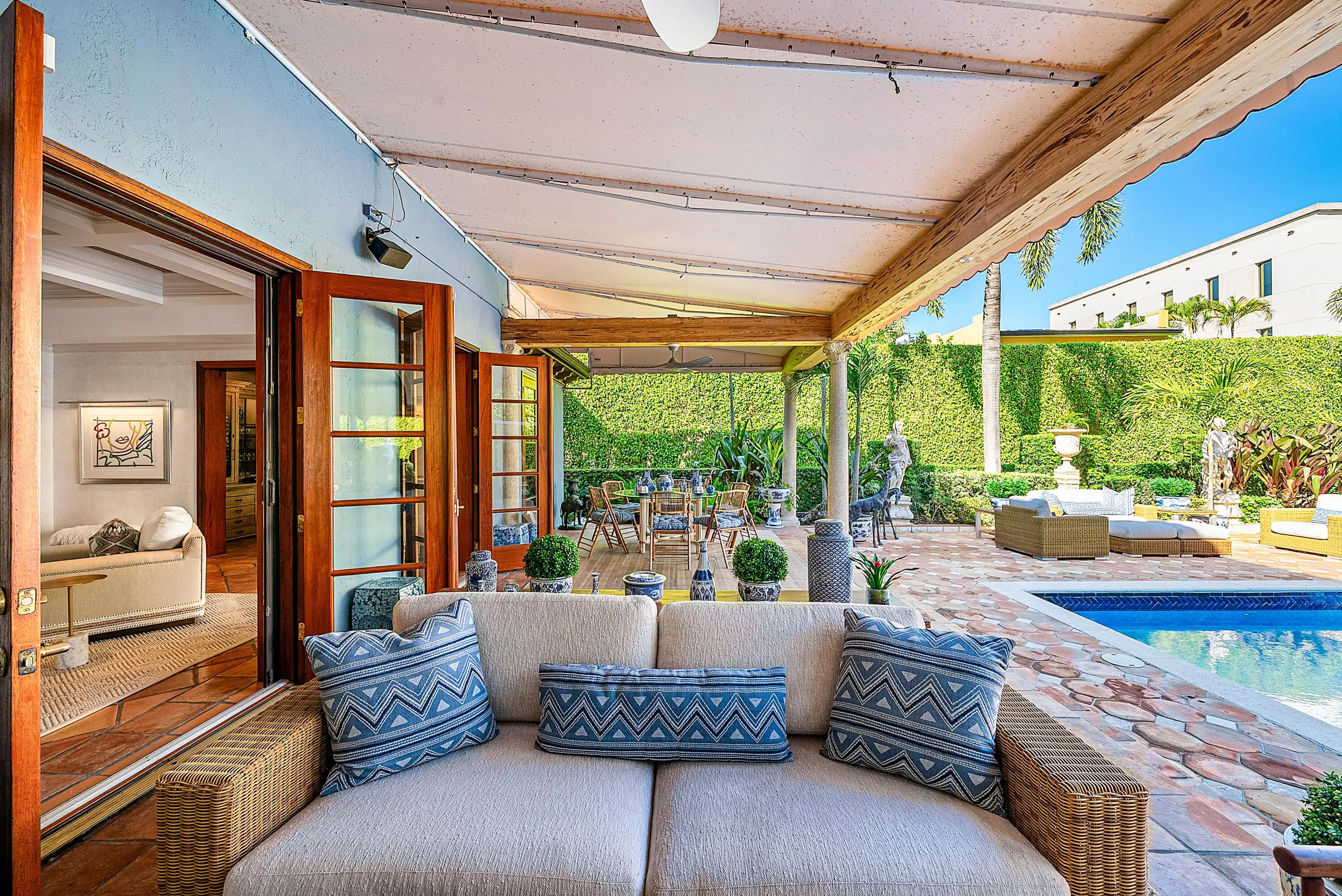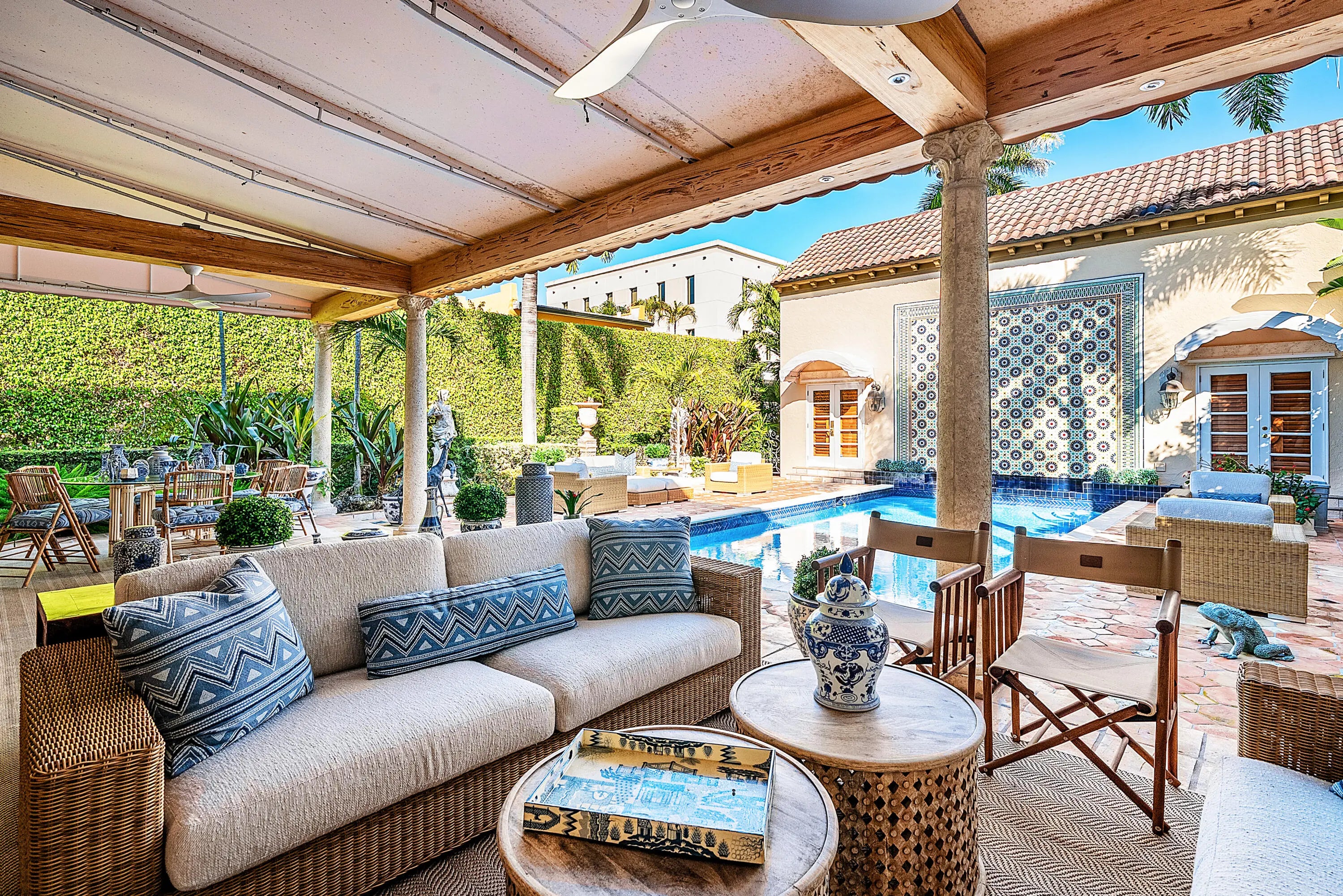 Quintessential Palm Beach living--tucked behind lush hedges in a coveted island setting. This beautifully updated residence with a separate guesthouse sits on an exceptional 180' deep property, offering remarkable privacy and scale. The guesthouse features two bedrooms with ensuite baths, a living room, and a full kitchen--ideal for hosting family and friends. The main residence offers approximately 6,000 SF of living space (6,500 SF total) and is defined by high ceilings, gracious proportions, and light-filled interiors, creating an effortless blend of comfort and sophistication. Designed for indoor-outdoor living, the residence opens to a lush backyard with a 20' x 40' pool, expansive entertaining patios, and covered outdoor living areas. Located near Worth Avenue shopping, Four Arts, Located near Worth Avenue shopping, Four Arts, dining, tennis, dog park, recreation center, beach, and marina. A rare opportunity to own a private, turnkey Palm Beach townhouse.