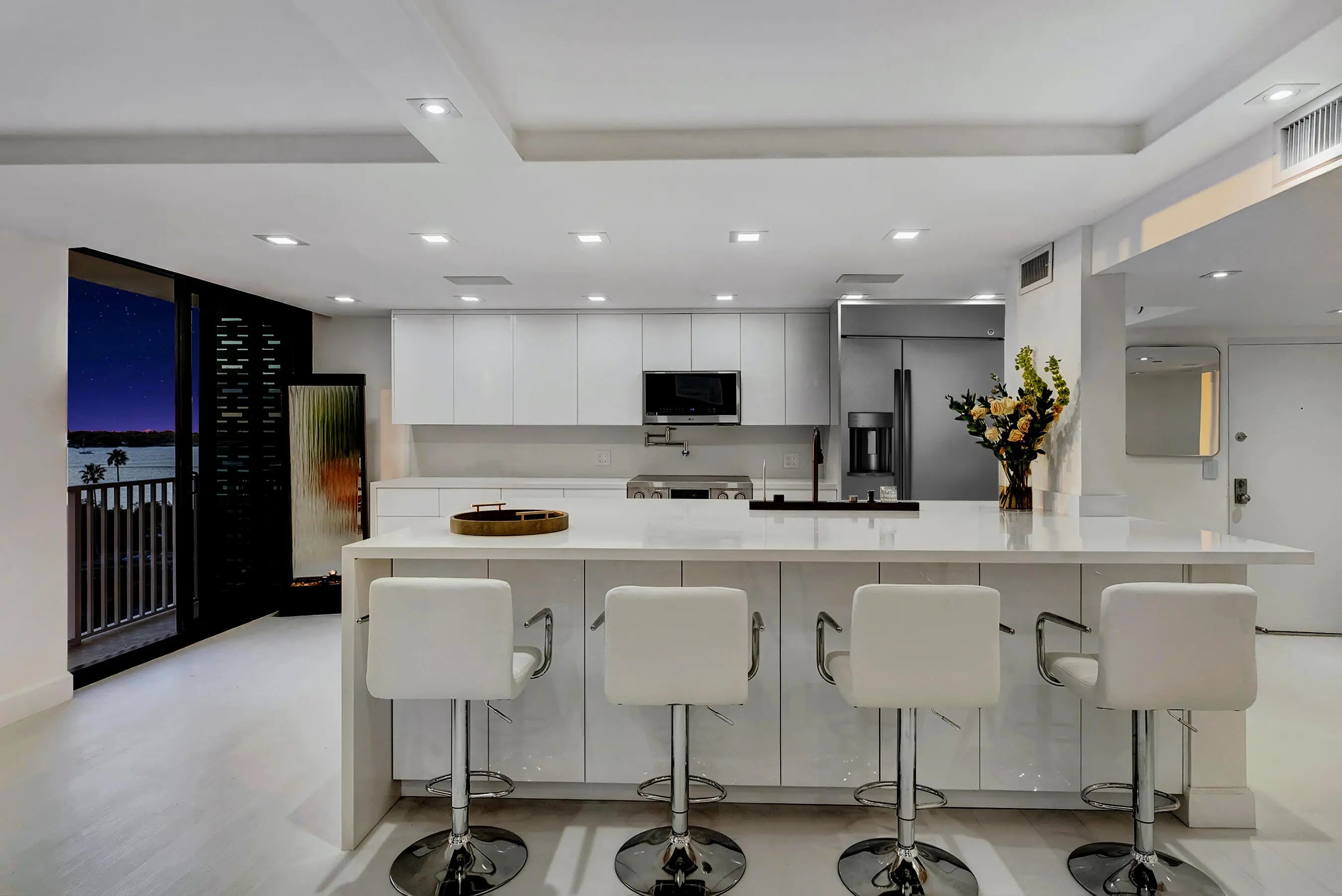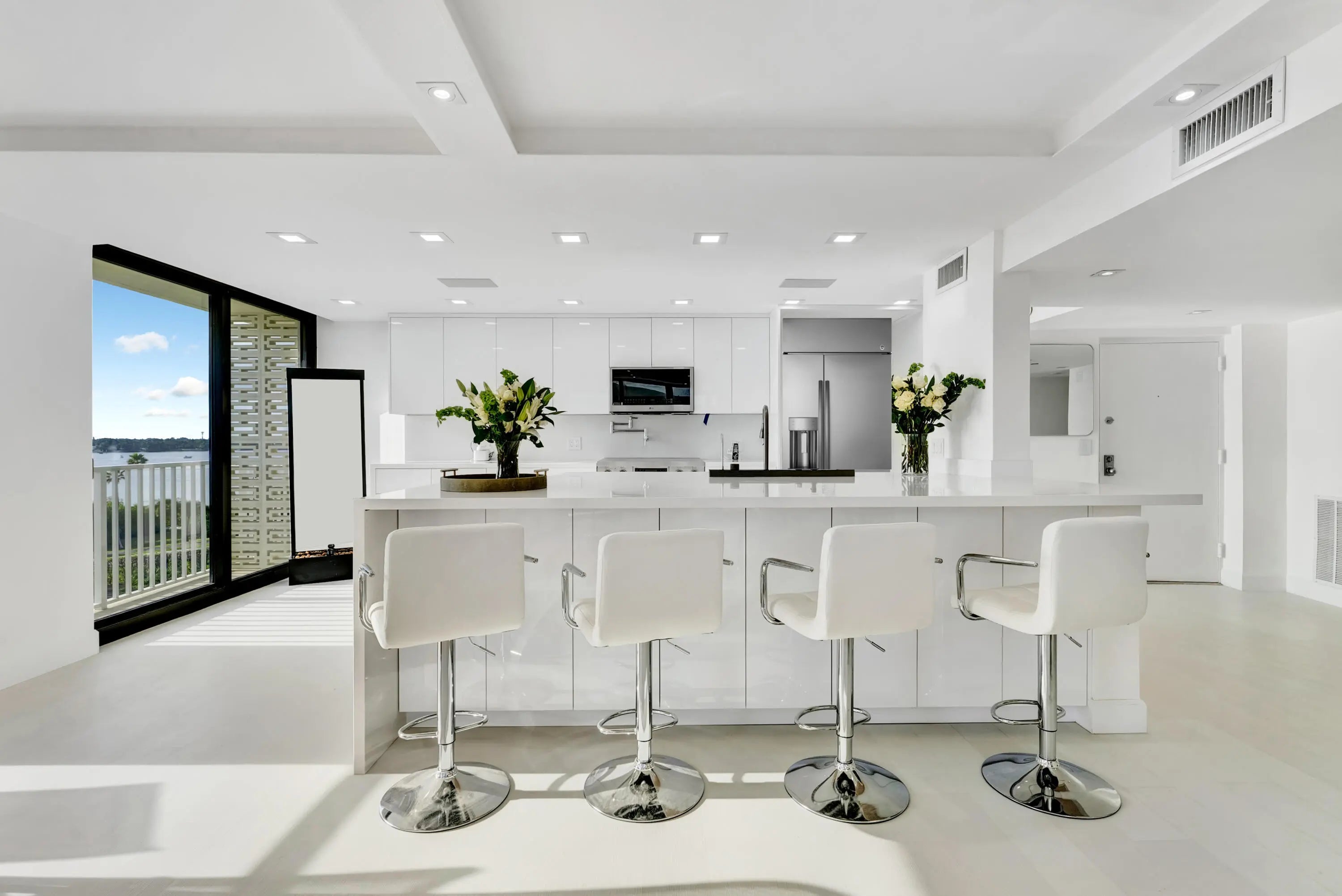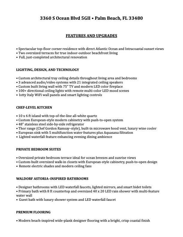 First offering in an exclusive series of high-tech luxurious Palm Beach oceanfront renovations. Also Listed For Sale! See ShorelineCondoCollectionPB. Steps to the family's Tideline Resort & Spa. Sweeping ocean-to-Intracoastal views in a brand-new modern waterfront residence. Southern exposure provides sunlit interiors where walls of glass open to two oversized terraces for ideal indoor-outdoor living. Chef kitchen w/ 10x6 island, custom cabinetry, premium appliances & 5-feature culinary sink & water filtration. Two spacious bedrooms, custom walk-in closets & Waldorf Astoria inspired bathrooms. Smart features include 3 immersive audio/video systems plus spectacular LED lighting transforming the home for entertaining. Luxury living that is truly unforgettable. See feature sheet & video.