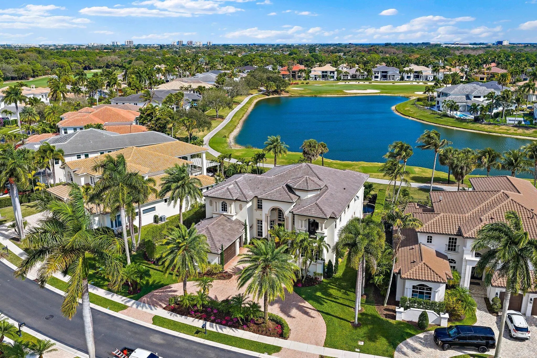 Experience the premier Frenchman's Reserve lifestyle in this coveted Villa Rosa estate, situated just a block away from the Club in the heart of Palm Beach Gardens. Set on an exceptional lot with unrivaled lake and Arnold Palmer championship golf course views, this home offers a brand-new roof (2025) and is an extraordinary opportunity to personalize a luxury residence in one of the area's most exclusive country club communities. From the moment you open the double doors, soaring 24' ceilings and a wall of floor-to-ceiling windows fill the home with natural light and showcase stunning views of the tranquil lake and golf course. This luxury residence offers 5 bedrooms, 5 full bathrooms, 2 half bathrooms, a spacious loft, a separate library, and a dedicated home theater/movie room. The kitchen flows seamlessly into the family room and casual dining area, creating an open-concept space perfect for entertaining. A wet bar with bar seating completes the formal living and dining room entertaining areas. The elegant loft overlooks the main living room, adding openness and architectural drama to the heart of the home. The primary suite features the same breathtaking golf, water and pool views, his-and-hers walk-in closets with custom built-ins, and an adjoining room that can serve as a gym, office, or dressing area, with dual bathrooms for ultimate convenience. First floor also includes a private guest bedroom with ensuite bath and 2 half baths. Upstairs, four gracious guest suites provide private retreats, including a secondary primary suite with a private balcony, walk-in closet, and an oversized spa bathroom. A circular driveway and 2-car + golf cart garage provide both striking curb appeal and functional convenience. EV charger ready! Outdoor living includes a heated pool, spa, and expansive gated patio for year-round enjoyment. This home is more than a residence-it's a lifestyle. Residents of Frenchman's Reserve enjoy world-class amenities including golf, tennis and pickleball courts, a state-of-the-art fitness center, resort-style clubhouse with fabulous dining options and a Kids Club. A social/sports membership is required, with the option to join the golf exchange program for additional golfing privileges.