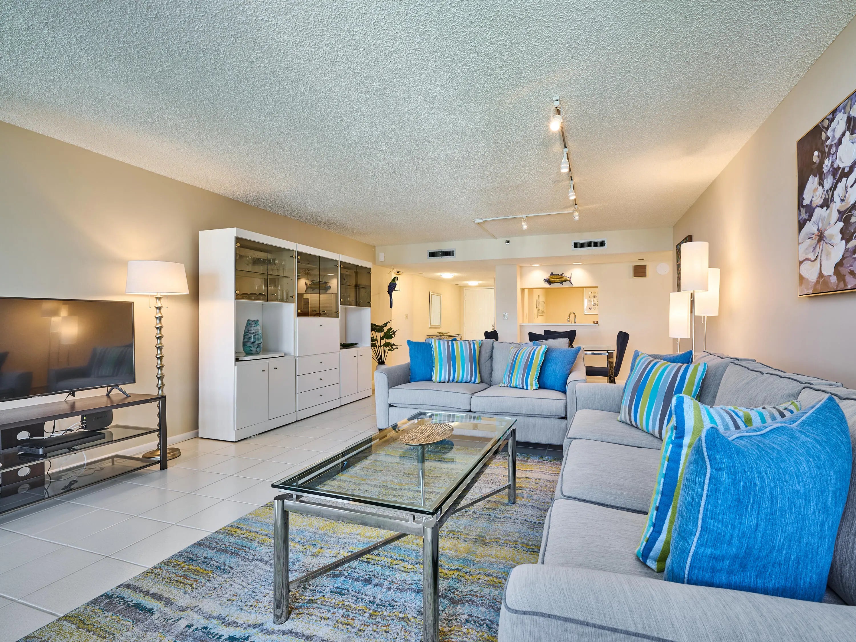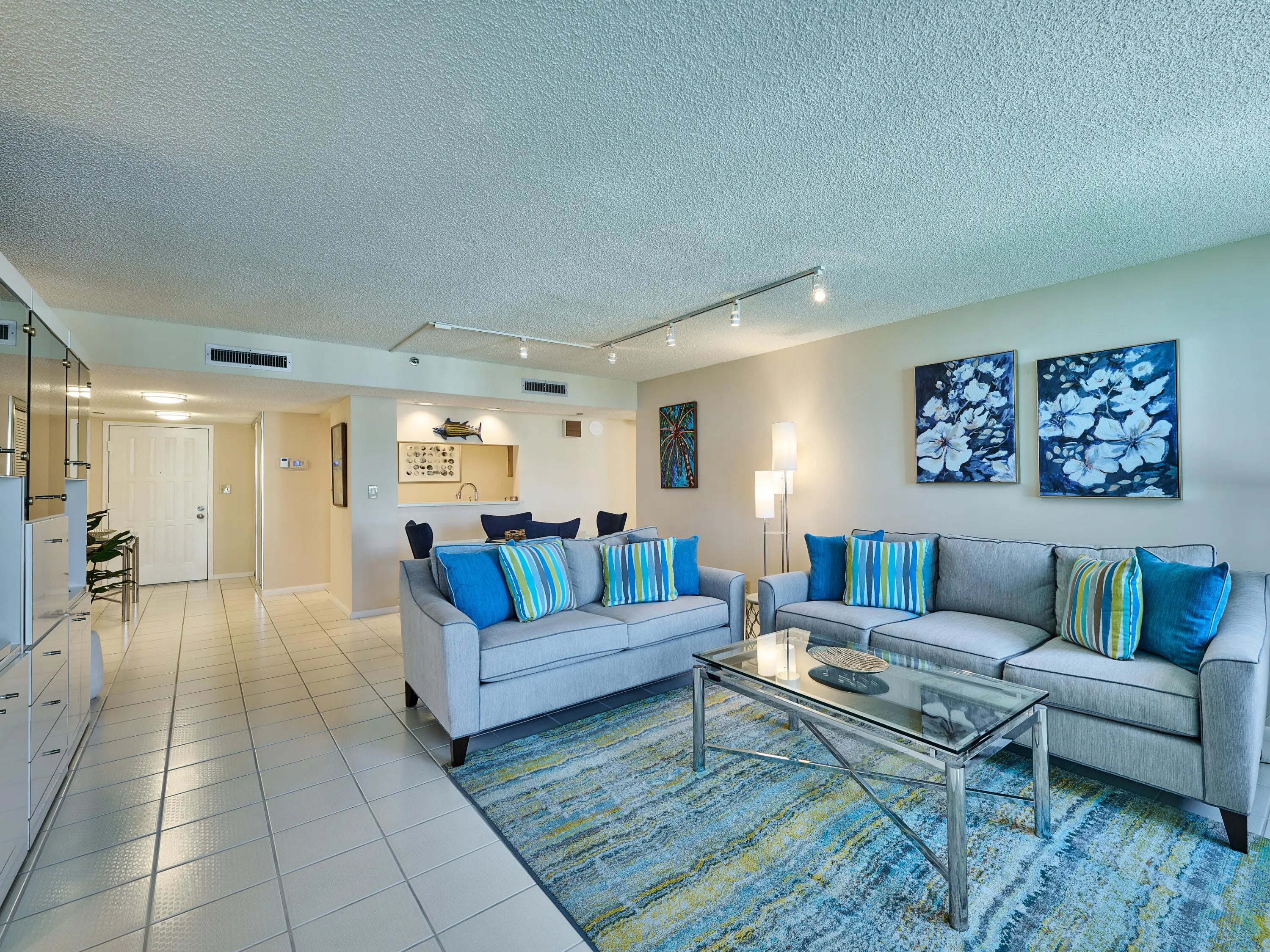 Enjoy the ocean view from your spacious lanai , perfect for relaxing or entertaining. Outfitted with chaises, cocktail tables, a dining table, and a cozy chair set, this outdoor space features a remote-controlled ceiling fan with three light temperatures. Inside, the living room boasts a newly furnished Cindy Crawford furniture package, and both the dining area and second bedroom have brand-new furniture as well. Sliding doors from the living room and both bedrooms open directly onto the lanai, while solar shades in the living room filter the afternoon sunlight. ***Available for Annual at $3,900 per month Seasonal minimum 4 months $8,000 per month*** Both bedrooms are fully furnished with Smart TVs, ample storage, and vertical blackout blinds.