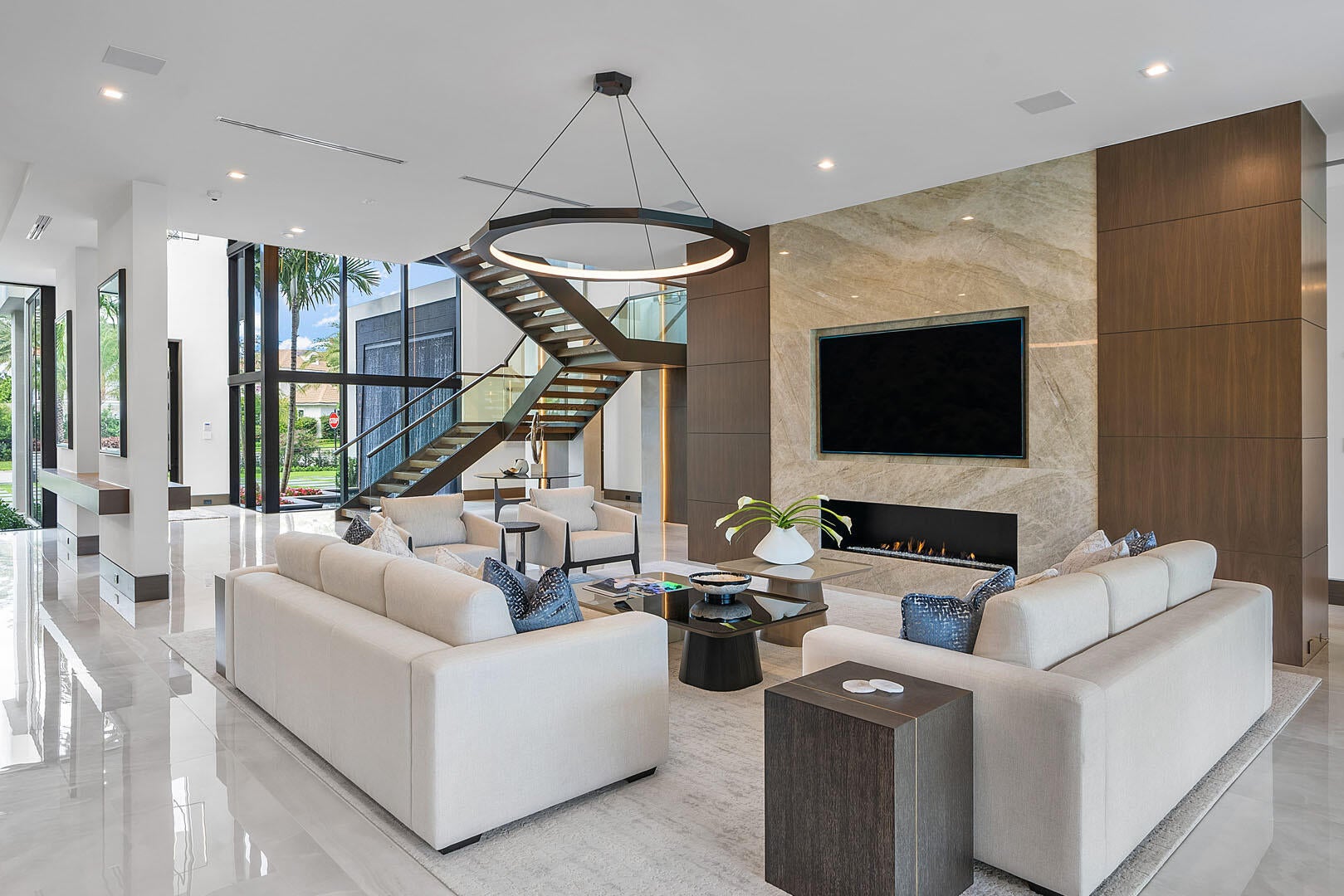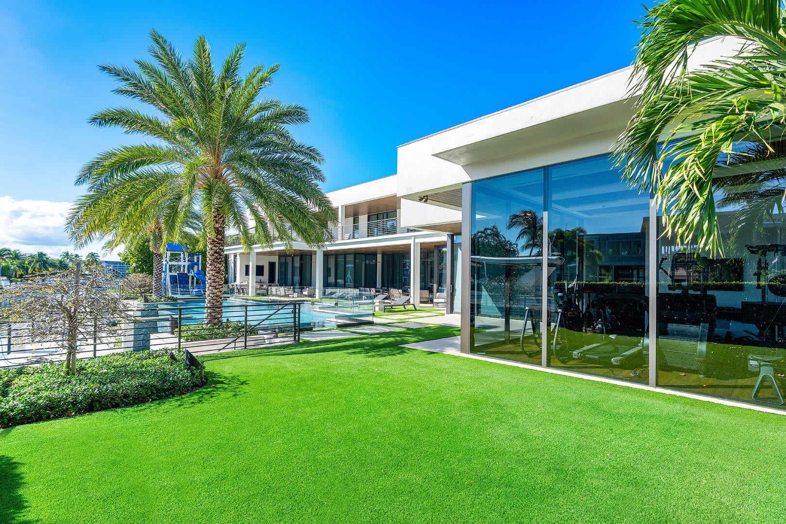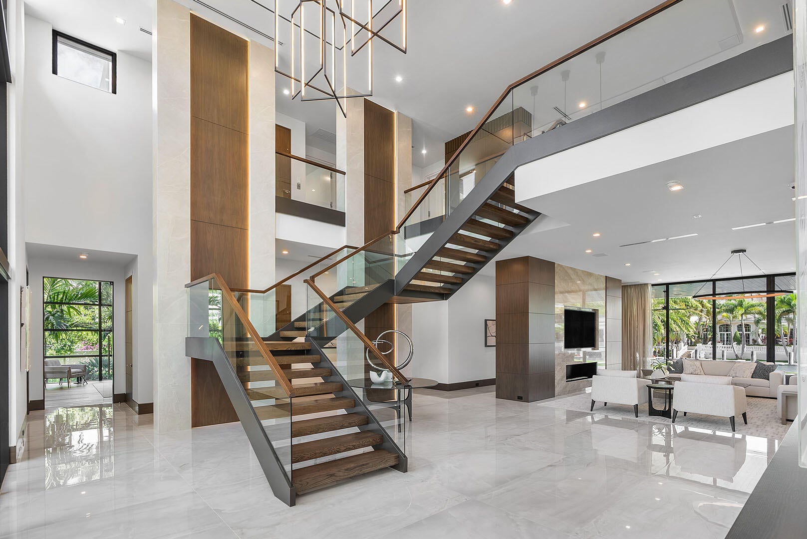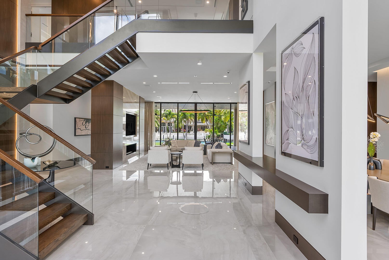 Immerse yourself in unparalleled luxury with this extraordinary furnished waterfront estate by SRD Building Corp. Spanning over 11,400 square feet of refined living space, this six-bedroom, eight full and two half-bathroom home is on 166 feet of deep-water frontage, offering a yacht-ready dock and southern exposure. A stunning waterfall wall fountain sets the tone as you enter the dual-entrance motor court driveway. The first-floor owner's wing is a private sanctuary with His & Her spa-like bathrooms, a dedicated wellness/gym with a full spa bath and steam shower, and a tranquil sitting room. For car enthusiasts, showroom-style garages with glass walls provide a striking display for your collection enjoyed from the private study.Designed by P&H Interiors for grand-scale entertaining, the sleek clubroom features a bar, billiards area, and a glass-enclosed wine room. The chef's kitchen, outfitted with premium appliances and a spacious eat-in dining area, ensures a culinary experience to match the home's sophistication. Outdoors, the resort-grade backyard is an expansive private oasis boasting a pool, spa, turf yards, and a tremendous covered terrace, perfectly oriented to capture the sun-soaked southern exposure. Cutting-edge Crestron smart-home technology and advanced security systems ensure effortless living at the highest level of convenience and safety. This exceptional residence is a rare opportunity to own a true masterpiece of modern luxury.