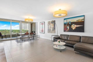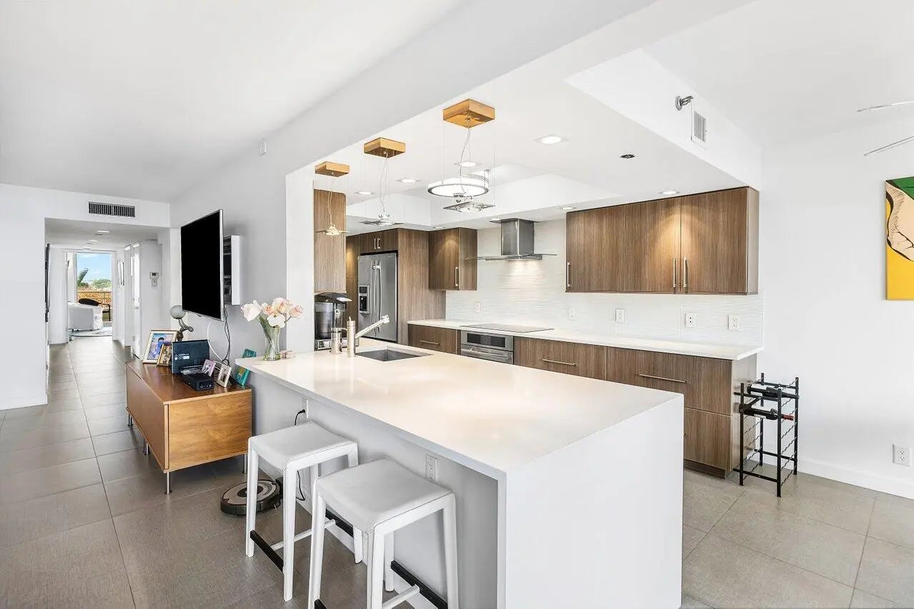 Stunning waterfront condo with both intracoastal and ocean views. Large sliding doors in the living room open onto the balcony with space for outdoor lounging and a dining area. From here, views of the ocean and the soon-to-be renovated community pool and spa are complemented by the refreshing sea breeze. Ocean views can also be enjoyed from the renovated kitchen. On the opposite side of the home, find both the primary bedroom and second bathroom, both of which enjoy Intracoastal views and a beautiful balcony. The primary suite boasts a luxurious bathroom with a soaking tub, a large walk-in closet, and a chic kitchenette with a wine fridge, making the space perfect for effortless relaxation and convenience. 1 parking and 1 dock space (40 ft).