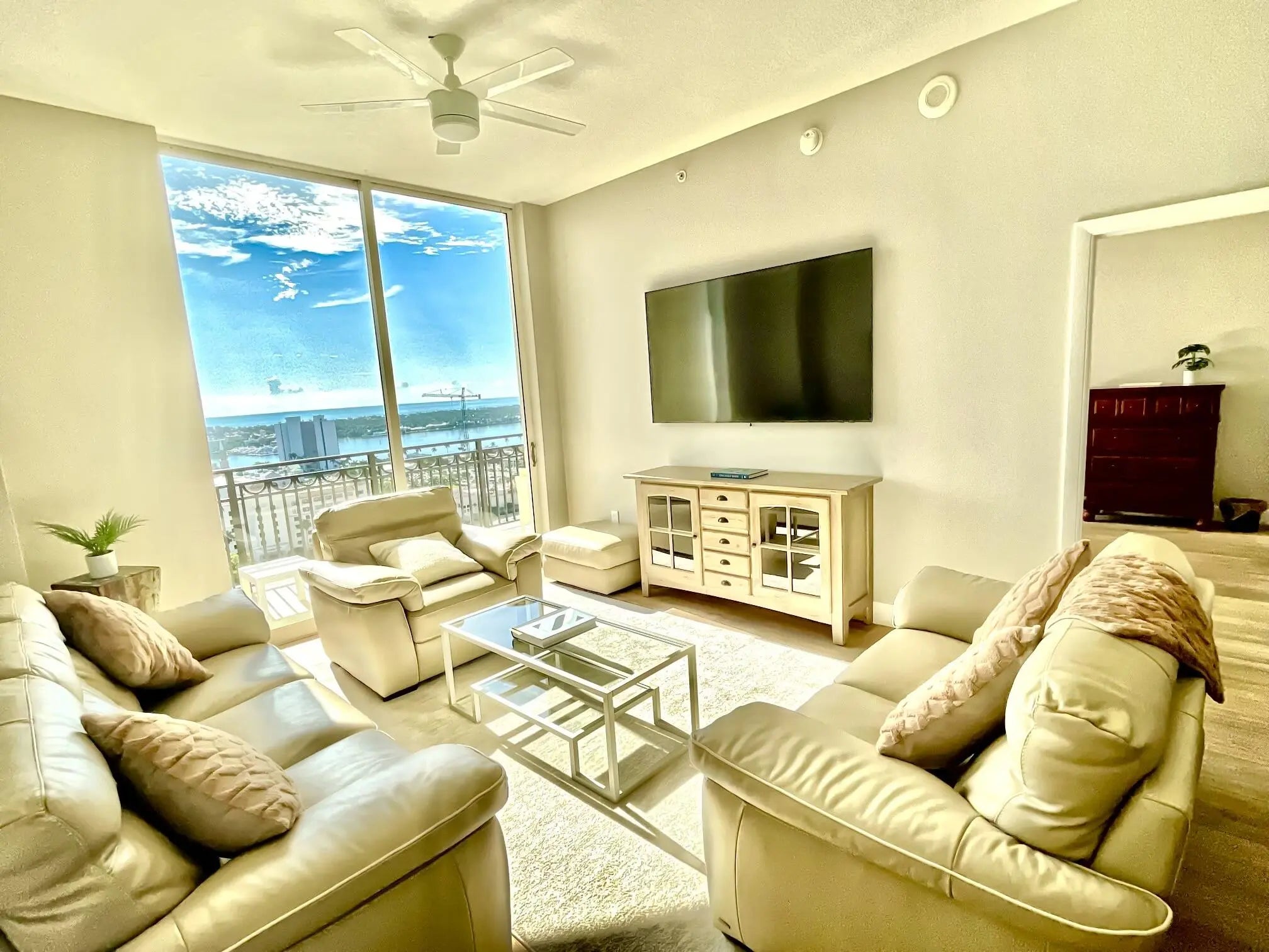 Wake up to ocean views in this spectacular fully-furnished penthouse. Located in the heart of downtown West Palm Beach, this unit is minutes from the beach, restaurants, bars, shopping, and everything that South Florida living has to offer. In addition to a balcony facing the ocean, it features a fully equipped open kitchen with stainless appliances and wine cooler, master bath with dual sinks, separate shower, jacuzzi tub,10 ft ceilings, two walk in closets, and W\D in unit. The luxury amenities available at CityPlace South Tower include valet parking, an infinity lap size pool, spa, steam room, hot tub, sauna, fitness center, massage room, club lounge, and summer kitchen. Lease dates are flexible. Avail May 1, 2025.