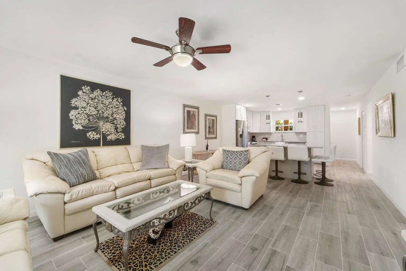 This stylish, ground-floor unit puts you just a short stroll from Jupiter Beach and right next to Carlin Park's heart trail. Whether you're into morning jogs, afternoon tennis, or sunset pickleball matches, it's all right in your backyard. Water included in rent!Step inside to a freshly renovated space with sleek porcelain tile, stone countertops, stainless steel appliances, and impact windows and doors throughout. Unwind on your covered, screened lanai or kick back with high-speed WiFi and two flat screen TVs already set up for you.Comfort meets convenience in one of Jupiter's most walkable, beachside communities. Just unpack and start living.