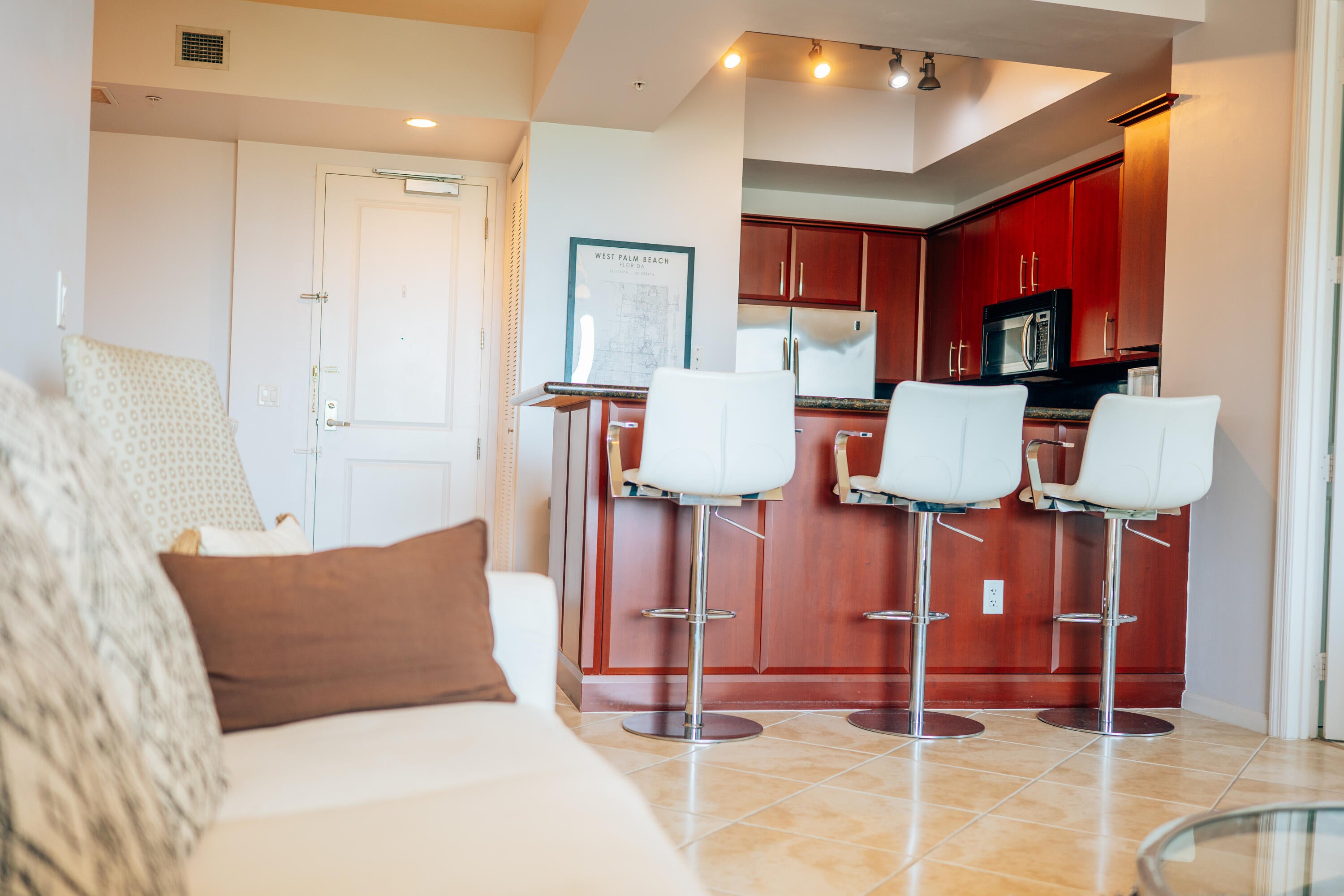 Penthouse living at The Metropolitan! Spacious 2BR/2BA, split floorplan, and private balcony overlooking city views. Elegant finishes include granite countertops, stainless-steel appliances, tile & plush carpet flooring, in‑unit laundry, walk‑in closets, and a luxurious dual‑sink bath with tub and separate shower. Includes 1 parking space.Enjoy resort-style living: 24‑hr concierge, rooftop pool/spa, fitness center, club room, business center, bike storage, secure entry and elevator access. Ideally located downtown, you're steps from the Kravis Center, Rosemary Square (formerly CityPlace), fine dining, entertainment, Publix and a short drive to Palm Beach and nearby beaches. Close proximity to I‑95, Palm Beach based hospitals, vibrant parks, and the wat