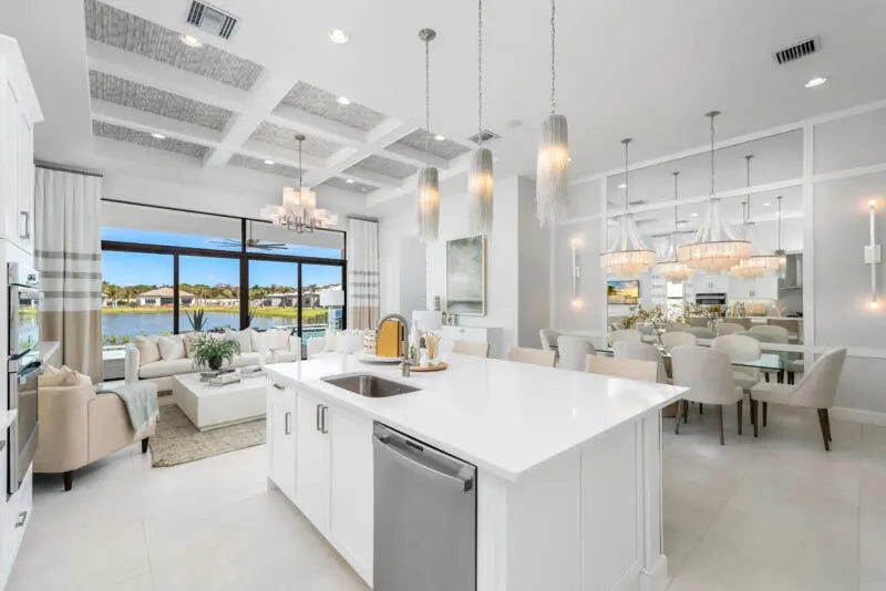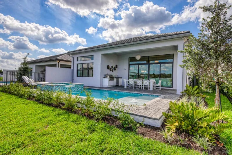 Rare opportunity to own the highly sought-after, designer curated fully furnished Venice Builder Model--luxury, location, and design in one. Situated on a premium lakefront lot w/ heated pool, spa, sun shelf, & summer kitchen. Features incl. a gourmet kitchen w/ oversized island, soaring ceilings, custom closets, designer window treatments, large-format porcelain tile+more. 3 Generous Bedrms, Plus Den/Office, Large Great Room, 31/2 Baths, Split 3-Car Garage, Heated Pool. Enjoy your private oasis+world-class amenities: full-service restaurant, 44,000 sq. ft. clubhouse with spa/salon, indoor/outdoor bar, indoor pickleball, tennis, multiple pools, & more. Closing cost incentives may apply-subject to change. Est delivery: 2nd quarter of 2026.
