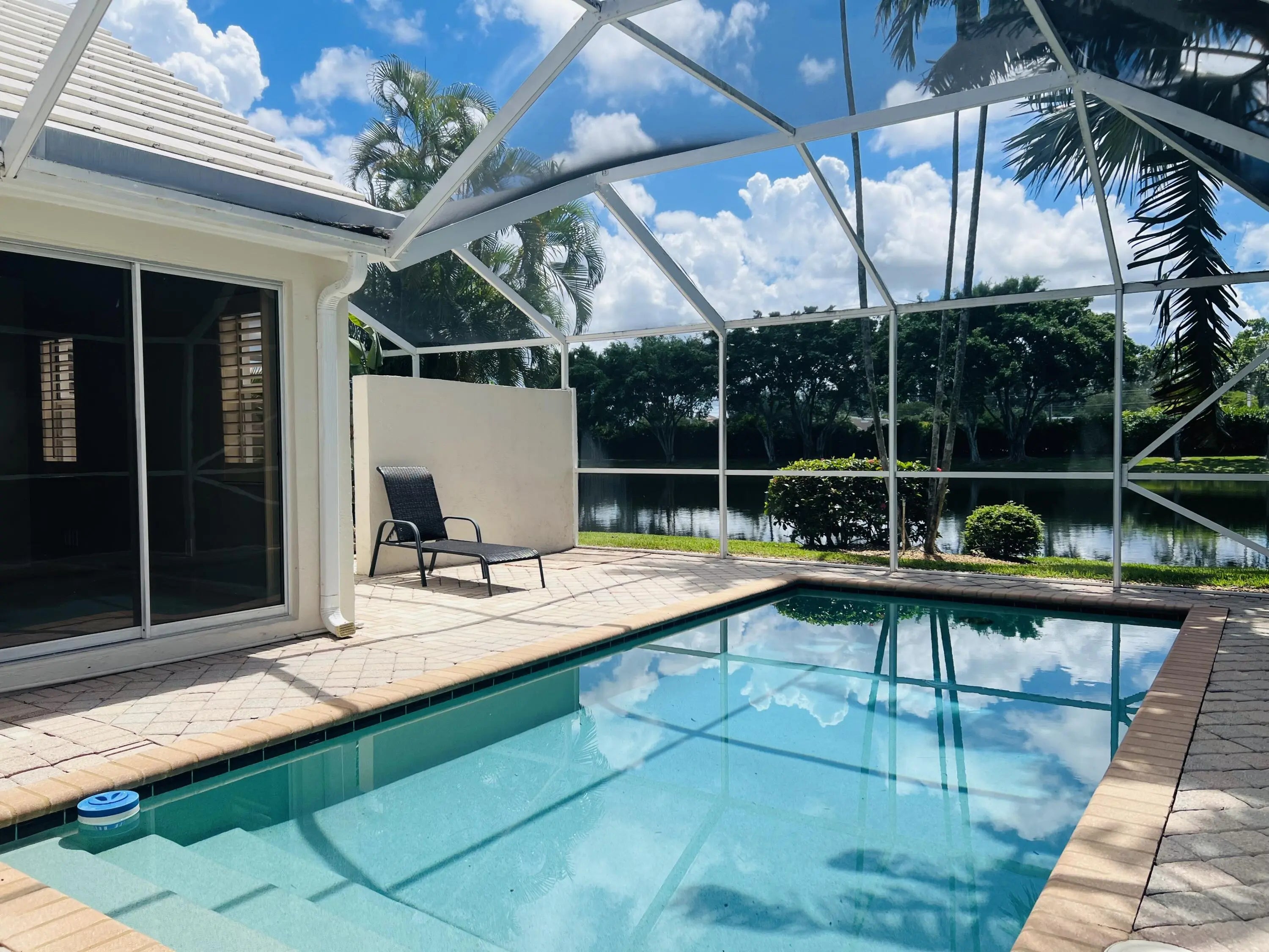 Welcome home to this 3 bedroom, 2 bathroom waterfront home in The Colony at Breakers West, where comfort, style, and a resort-inspired lifestyle come together. You'll love the open-concept layout, soaring volume ceilings, and coastal-inspired colors that create a bright, inviting atmosphere from the moment you walk in. The split floor plan provides privacy, while the main living area and primary suite showcase serene lake views and direct access to your private screened-in pool and spa. Picture mornings spent sipping coffee by the water, afternoons hosting cookouts at the built-in outdoor kitchen, and evenings unwinding in the spa. Breakers West is unique because club memberships are optional, giving you the freedom to enjoy the community without added commitments.