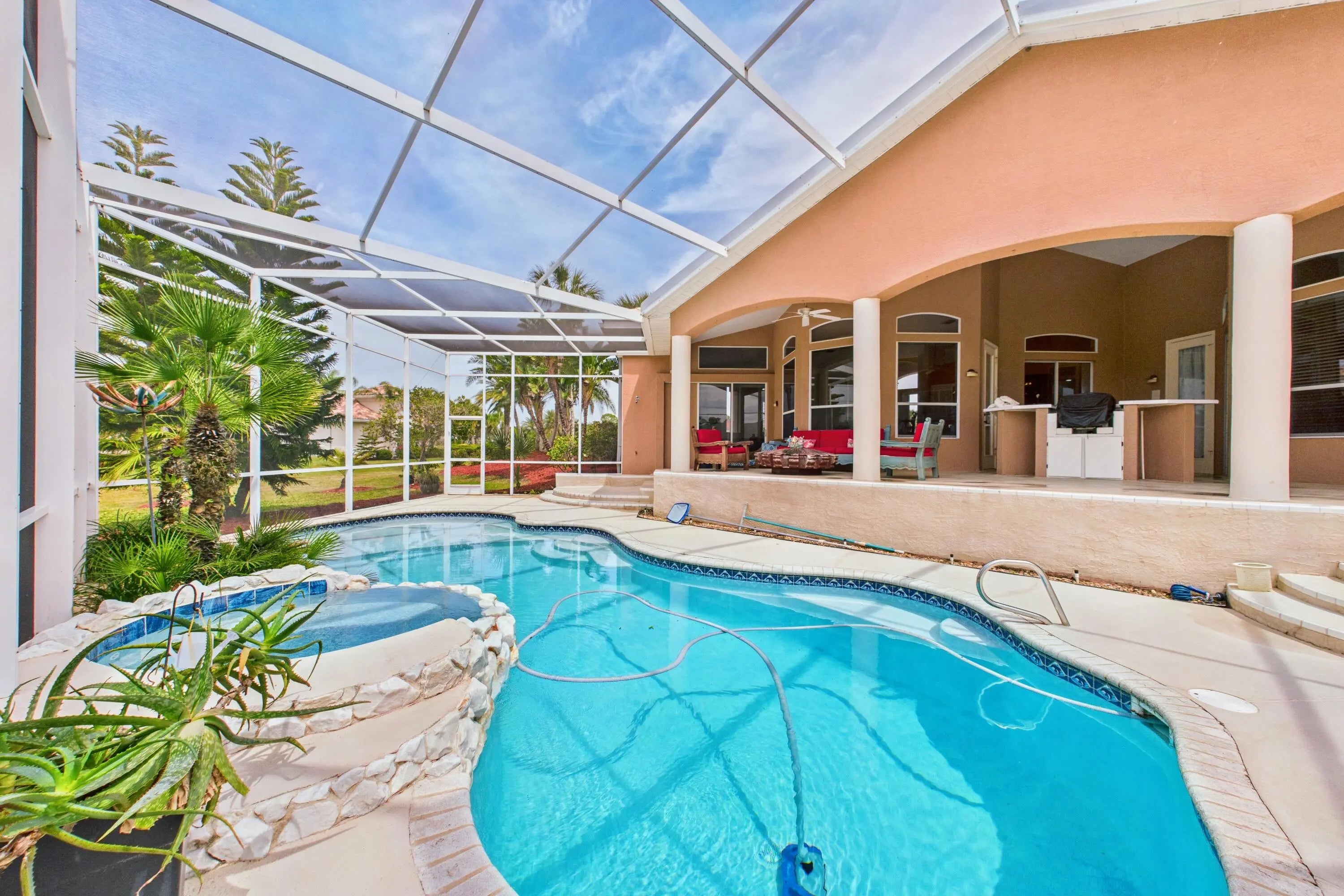 Experience elevated living in this exquisite estate home, set on over an acre within a prestigious gated community. Thoughtfully designed with Feng Shui influences, the residence offers a perfect blend of tranquility and luxury. Dramatic vaulted ceilings and expansive windows fill the space with natural light, creating a bright, open ambiance. The gourmet kitchen features high-end appliances and flows effortlessly into a spacious living area, ideal for entertaining. Step outside to a serene two-story covered patio overlooking a screened-in pool and hot tub--your private outdoor sanctuary. This one-of-a-kind property combines privacy, elegance, and comfort in every detail. Schedule your private tour today!