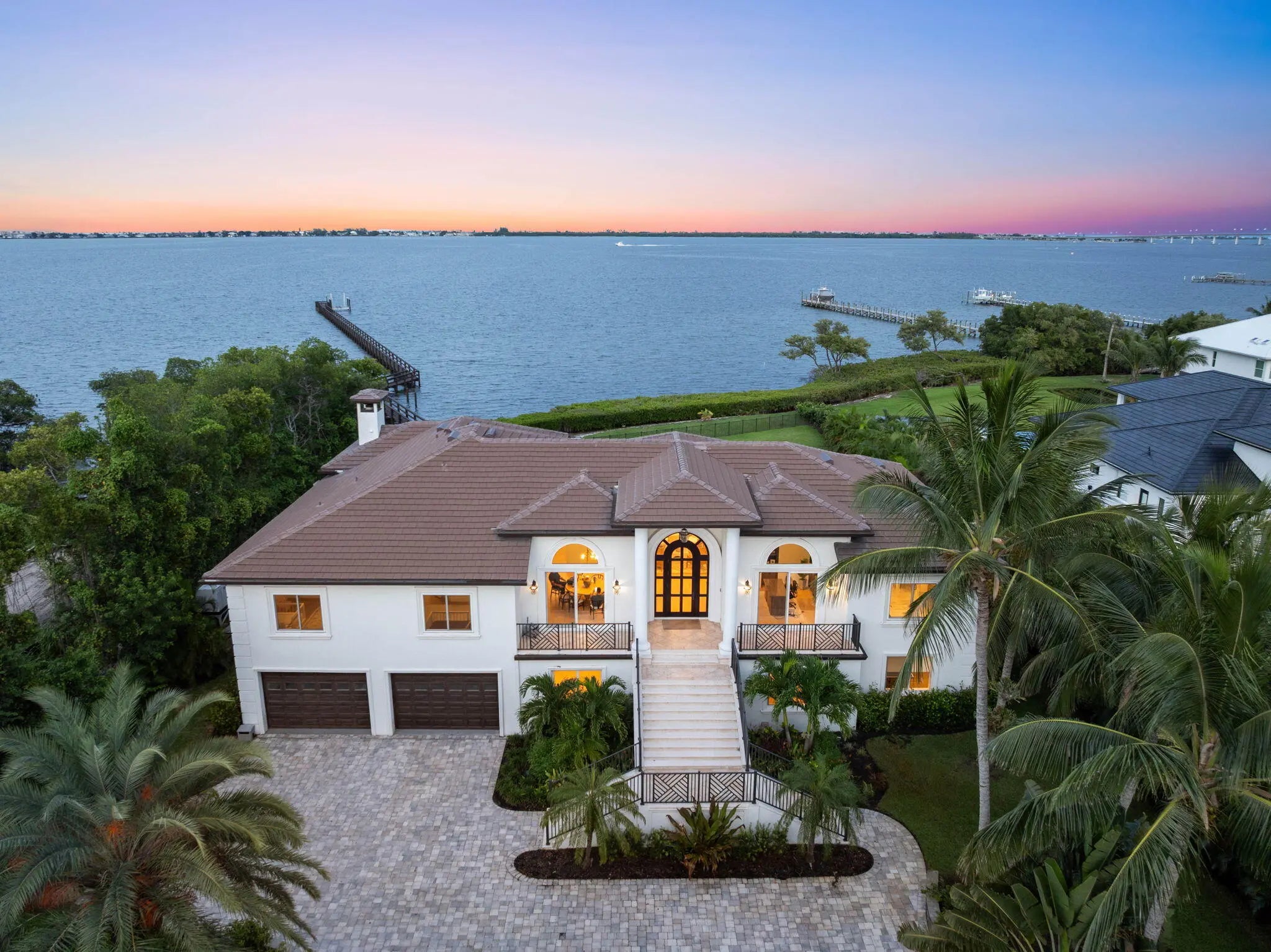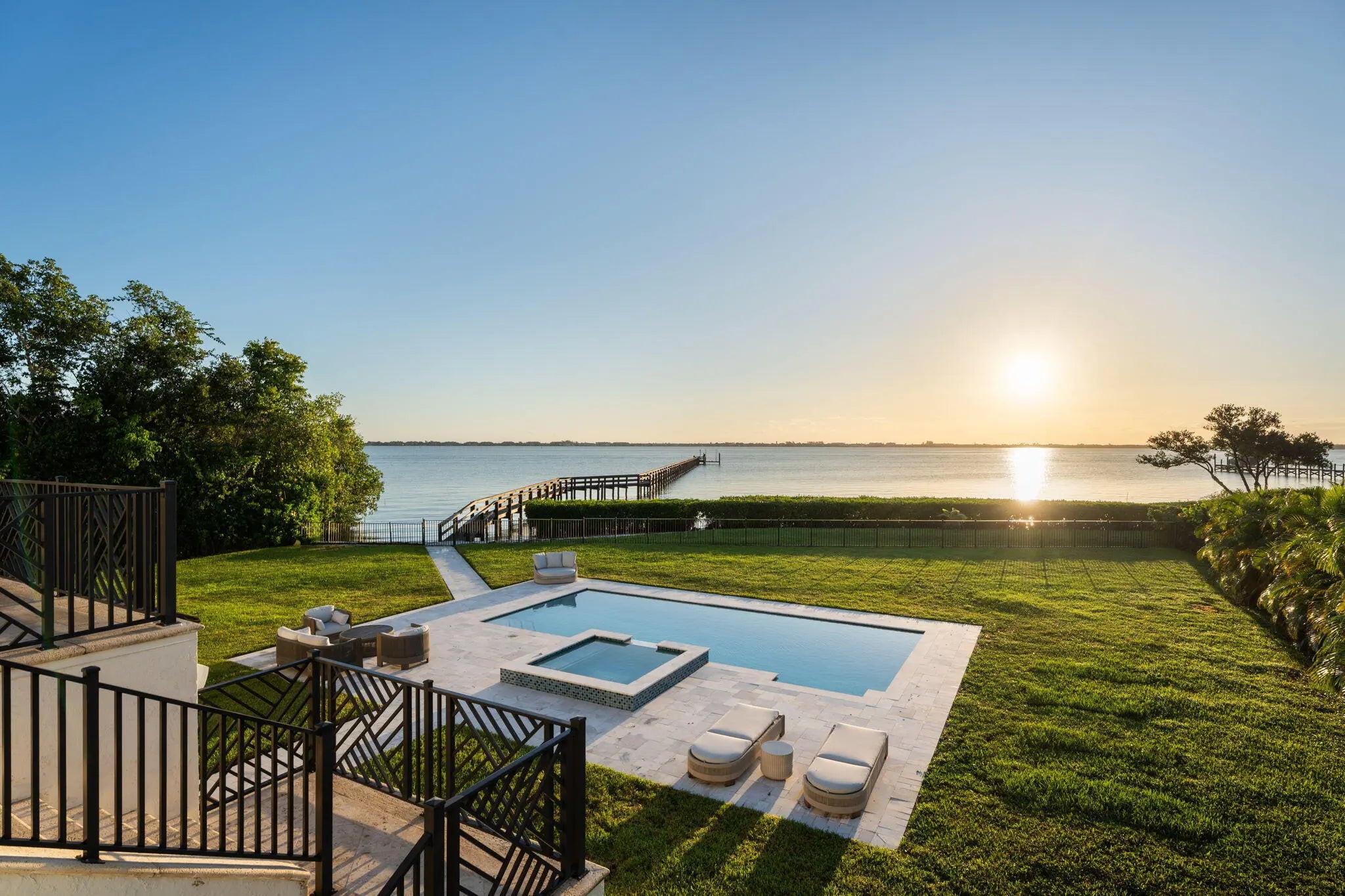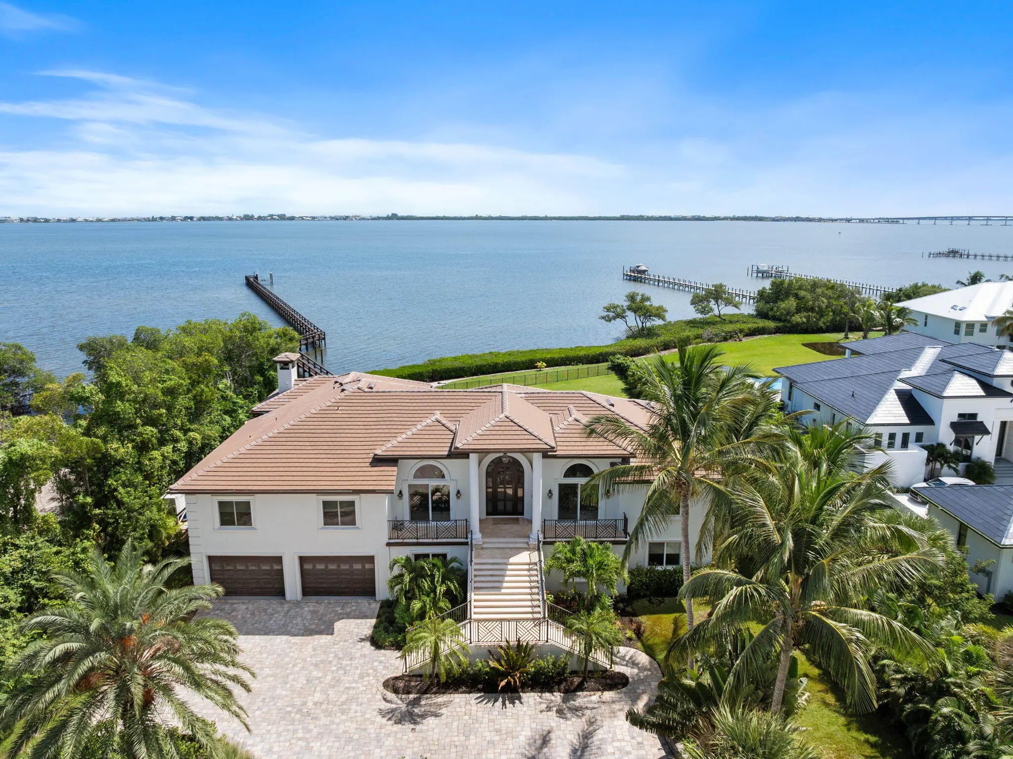 Offered fully furnished & sold turnkey, this gated Sewalls Point estate was completely reimagined in 2022 with hand-selected materials by FireFinish Interiors & additional bespoke finishes by Hurd Homes. Set on 1.25 acres with 152 feet of direct Indian River frontage, the home combines architectural precision with the finest modern comforts.Inside, picture-frame windows flood the interiors with natural light & frame panoramic water views. The open floor plan showcases marble & porcelain finishes throughout, with every bedroom designed as an en suite retreat. The Primary Suite commands a front-row seat to the water, featuring a spa-like bath adorned with marble & porcelain tile crafted to resemble teak floors without the upkeep. Wake up to breathtaking sunrises over the