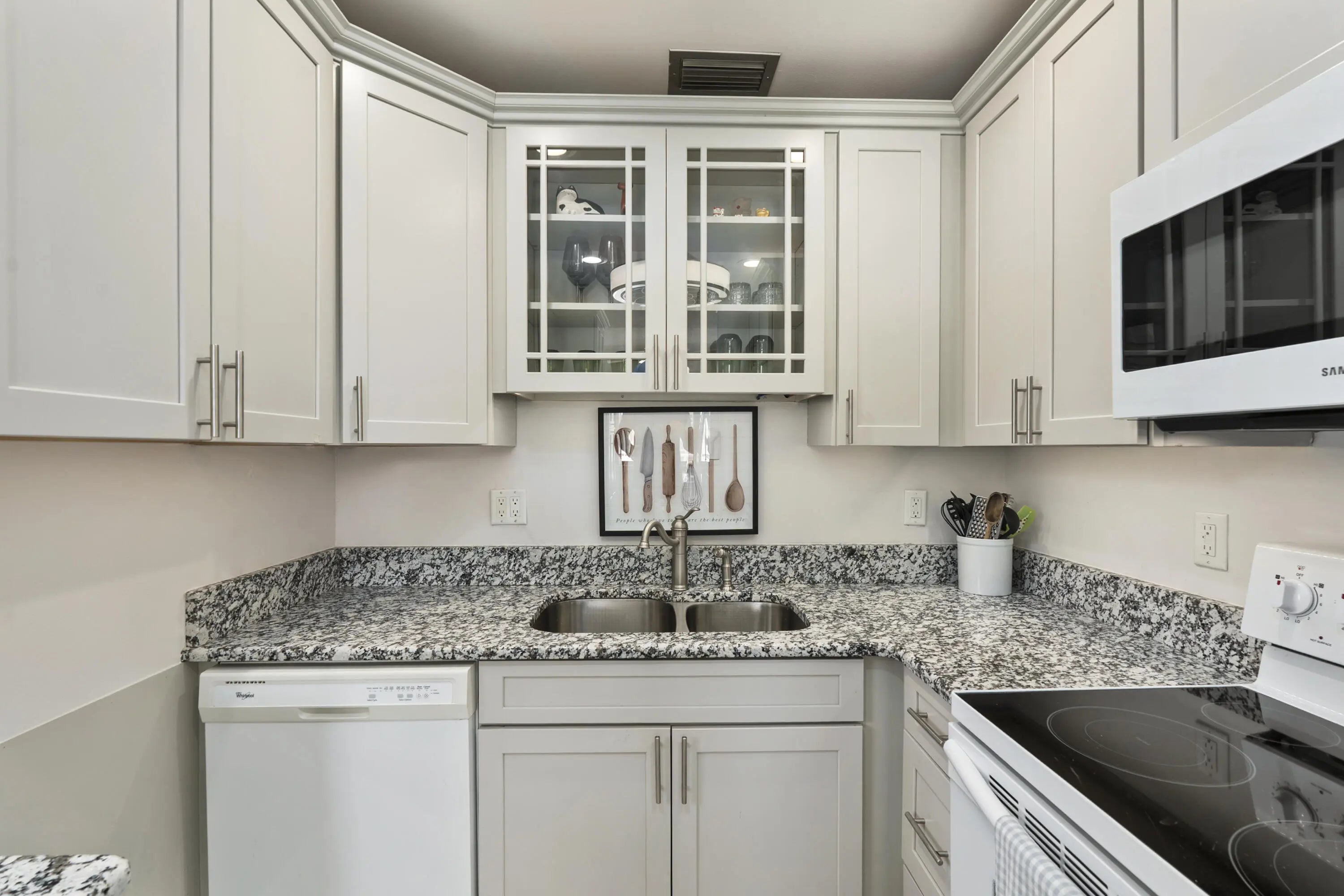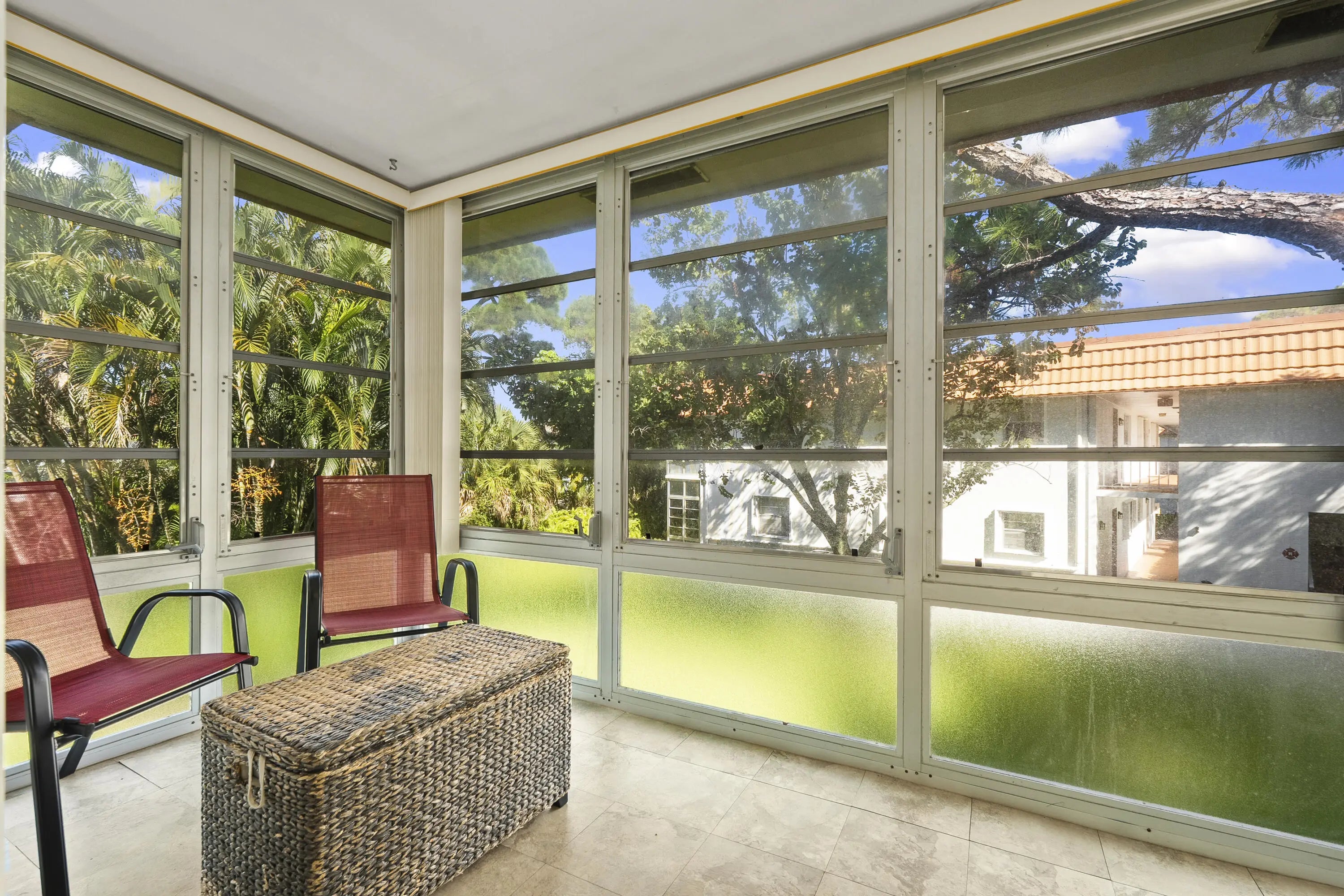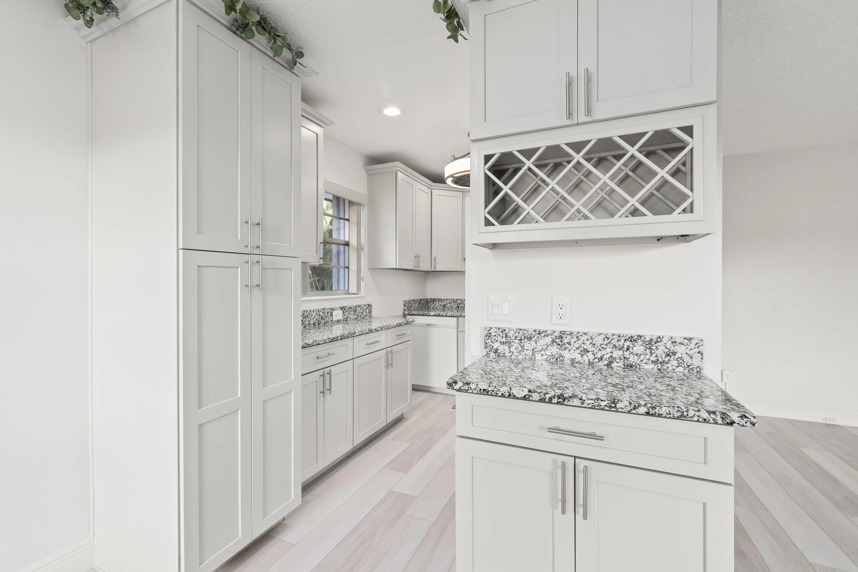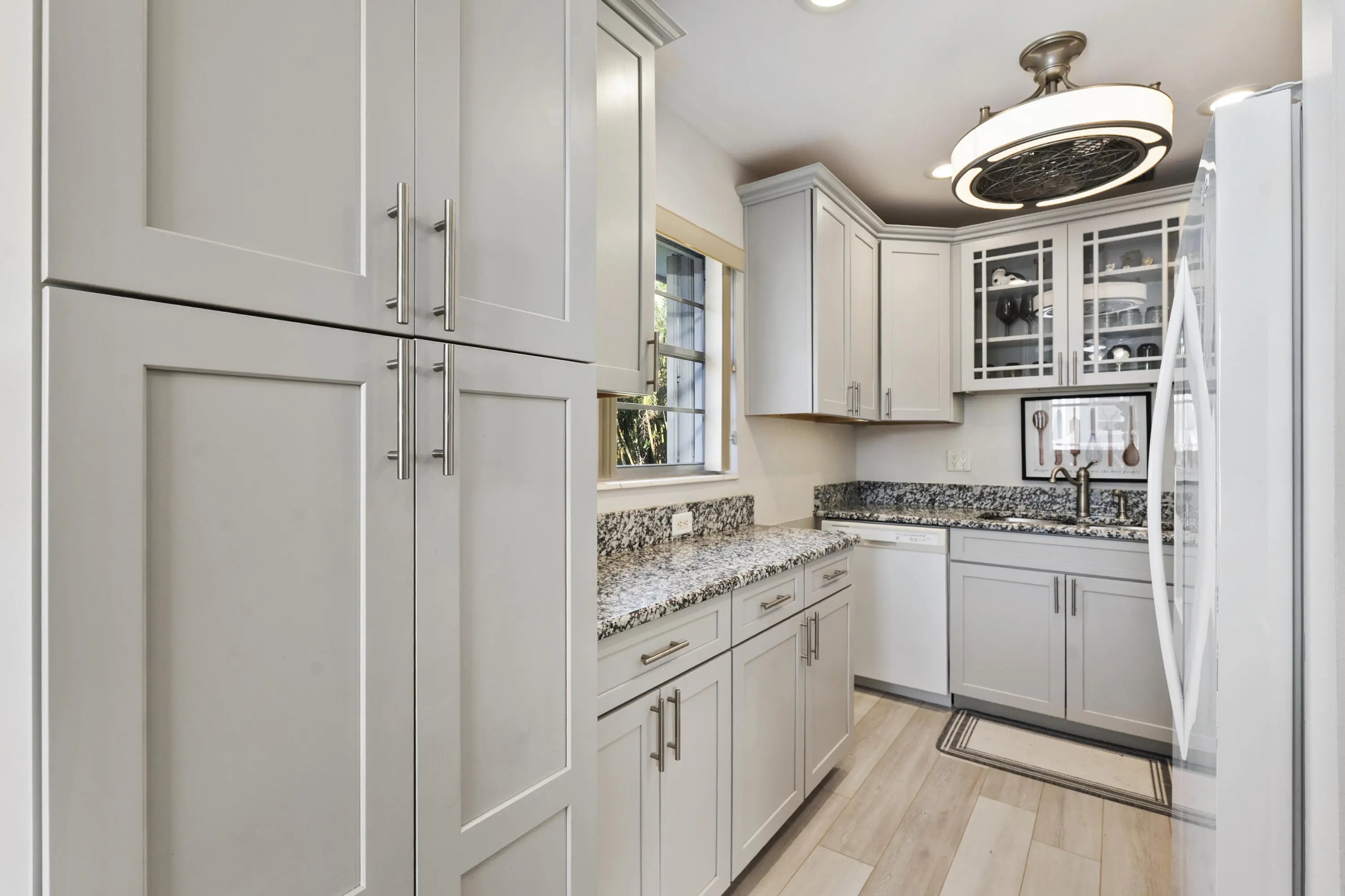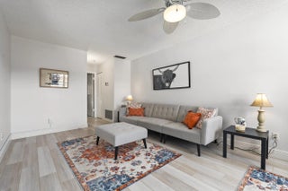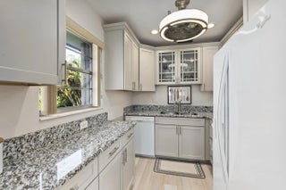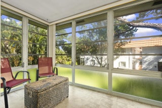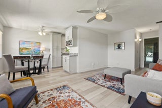 Partially furnished 1Bed 1.5Bath bright and airy end unit. Stunning remodeled kitchen featuring solid Wood 36'' Gray shaker cabinets, built in pantry, 3cm Granite Counters, high hat lighting, under cabinet lighting, glass accent doors, wine rack, white Whirlpool & Samsung appliance package. Recent upgrades include laminate & tile floors, hardwired Hunter ceiling fans, 6'' baseboards, decor electrical switches, lighting, screened front door, new toilets. Impact Sliding Glass door to glass enclosed screen patio with storage. Accordion Hurricane Shutters, Roof 2023, A/C 2022, newer screens & water heater. Great location just a short walk to community club house with Pool, Dance Hall, Library, Gym, Shuffleboard & workshop. Close to shopping, restaurants, and beaches. No pets or Pick-up trucks.
